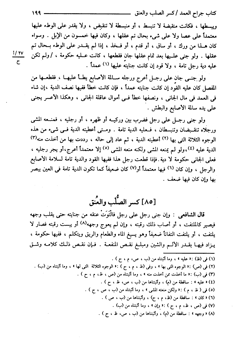 وَيَبْسُطَهَا فَكَانَتْ مُنْقَبِضَةً لاَ تَنْبَسِطُ أَوْ مُنْبَسِطَةً لاَ تَنْقَبِضُ وَلاَ يَقْدِرُ عَلَى الْوَطْءِ عَلَيْهَا مُعْتَمِدًا عَلَى عَصًا وَلاَ عَلَى شَيْءٍ بِحَالٍ , ثُمَّ عَقَلَهَا وَكَانَ فِيهَا خَمْسُونَ مِنْ الْإِبِلِ وَسَوَاءٌ كَانَ هَذَا مِنْ وَرِكٍ أَوْ سَاقٍ أَوْ قَدَمٍ أَوْ فَخِذٍ إذَا لَمْ يَقْدِرْ عَلَى الْوَطْءِ بِحَالٍ تَمَّ عَقَلَهَا وَلَوْ جَنَى عَلَيْهَا بَعْدَ تَمَامِ عَقْلِهَا جَانٍ فَقَطَعَهَا كَانَتْ عَلَيْهِ حُكُومَةٌ وَلَمْ تَكُنْ عَلَيْهِ دِيَةُ رِجْلٍ تَامَّةٌ وَلاَ قَوَدَ إنْ كَانَتْ جِنَايَتُهُ عَلَيْهَا عَمْدًا , وَلَوْ جَنَى جَانٍ عَلَى رَجُلٍ أَعْرَجَ , وَرِجْلُهُ سَالِمَةُ الْأَصَابِعِ يَطَأُ عَلَيْهَا فَقَطَعَهَا مِنْ الْمَفْصِلِ كَانَ عَلَيْهِ الْقَوَدُ إنْ كَانَتْ جِنَايَتُهُ عَمْدًا فَإِنْ كَانَتْ خَطَأً فَفِيهَا نِصْفُ الدِّيَةِ إنْ شَاءَ فِي الْعَمْدِ فِي مَالِ الْجَانِي وَنِصْفُهَا خَطَأٌ فِي أَمْوَالِ عَاقِلَةِ الْجَانِي . وَهَكَذَا الْأَعْسَرُ يُجْنَى عَلَى يَدِهِ سَالِمَةَ الْأَصَابِعِ وَالْبَطْشِ , وَلَوْ جَنَى رَجُلٌ عَلَى رَجُلٍ فَضَرَبَ بَيْنَ وَرِكَيْهِ أَوْ ظَهْرِهِ أَوْ رِجْلَيْهِ فَمَنَعَهُ الْمَشْيَ وَرِجْلاَهُ تَنْقَبِضَانِ وَتَنْبَسِطَانِ فَعَلَيْهِ الدِّيَةُ تَامَّةٌ وَمَتَى أَعْطَيْته الدِّيَةَ فِي شَيْءٍ مِنْ هَذِهِ الْوُجُوهِ الثَّلاَثَةِ الَّتِي بِهَا أَعْطَيْته الدِّيَةَ , ثُمَّ عَادَ إلَى حَالِهِ رَدَدْت بِهَا مَا أَخَذْت مِمَّنْ أَخَذْت مِنْهُ الدِّيَةَ عَلَيْهِ وَلَوْ لَمْ يَمْنَعْهُ الْمَشْيَ وَلَكِنَّهُ مَنَعَهُ الْمَشْيَ إلَّا مُعْتَمِدًا أَعْرَجَ أَوْ يَجُرُّ رِجْلَيْهِ فَعَلَى الْجَانِي حُكُومَةٌ لاَ دِيَةٌ فَإِذَا قُطِعَتْ رِجْلُ هَذَا فَفِيهَا الْقَوَدُ وَالدِّيَةُ تَامَّةٌ لِسَلاَمَةِ الْأَصَابِعِ وَالرِّجْلِ وَإِنْ كَانَ فِيهَا مُعْتَمِدًا أَوْ كَانَ ضَعِيفًا كَمَا تَكُونُ الدِّيَةُ تَامَّةٌ فِي الْعَيْنِ يُبْصِرُ بِهَا وَإِنْ كَانَ فِيهَا ضَعْفٌ . .