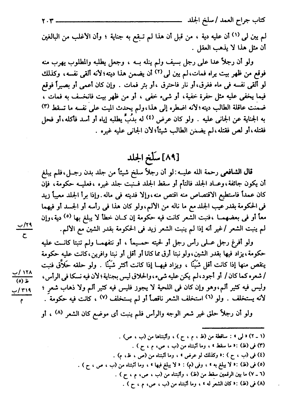 قَالَ الشَّافِعِيُّ : رحمه الله : وَلَوْ أَنَّ رَجُلاً سَلَخَ شَيْئًا مِنْ جِلْدِ بَدَنِ رَجُلٍ فَلَمْ يَبْلُغْ أَنْ يَكُونَ جَائِفَةً وَعَادَ الْجِلْدُ فَالْتَأَمَ أَوْ سَقَطَ الْجِلْدُ فَنَبَتَ جِلْدٌ غَيْرُهُ فَعَلَيْهِ حُكُومَةٌ فَإِنْ كَانَ عَمْدًا فَاسْتُطِيعَ الِاقْتِصَاصُ مِنْهُ اُقْتُصَّ مِنْهُ وَإِلَّا فَدِيَتُهُ فِي مَالِهِ وَإِذَا بَرَأَ الْجِلْدُ مَعِيبًا زِيدَ فِي الْحُكُومَةِ بِقَدْرِ عَيْبِ الْجِلْدِ مَعَ مَا نَالَهُ مِنْ الْأَلَمِ وَلَوْ كَانَ هَذَا فِي رَأْسِهِ أَوْ الْجَسَدِ أَوْ فِيهِمَا مَعًا أَوْ فِي بَعْضِهِمَا فَنَبَتَ الشَّعْرُ كَانَتْ فِيهِ حُكُومَةٌ إنْ كَانَ خَطَأً لاَ يُبْلَغُ بِهَا دِيَةٌ وَإِنْ لَمْ يَنْبُتْ الشَّعْرُ غَيْرَ أَنَّهُ إذَا لَمْ يَنْبُتْ الشَّعْرُ زِيدَ فِي الْحُكُومَةِ بِقَدْرِ الشَّيْنِ مَعَ الْأَلَمِ وَلَوْ أَفْرَغَ رَجُلٌ عَلَى رَأْسِ رَجُلٍ أَوْ لِحْيَتِهِ حَمِيمًا أَوْ نَتْفَهُمَا وَلَمْ تَنْبُتَا كَانَتْ عَلَيْهِ حُكُومَةٌ يُزَادُ فِيهَا بِقَدْرِ الشَّيْنِ وَلَوْ نَبَتَا أَرَقَّ مِمَّا كَانَا أَوْ أَقَلَّ أَوْ نَبَتَا وَافِرَيْنِ كَانَتْ عَلَيْهِ حُكُومَةٌ يُنْقَصُ مِنْهَا إذَا كَانَتْ أَقَلَّ شَيْئًا وَيُزَادُ فِيهَا إذَا كَانَتْ أَكْثَرَ شَيْئًا وَلَوْ حَلَقَهُ حَلَّاقٌ فَنَبَتَ شَعْرُهُ كَمَا كَانَ أَوْ أَجْوَدَ لَمْ يَكُنْ عَلَيْهِ شَيْءٌ وَالْحِلاَقُ لَيْسَ بِجِنَايَةٍ ; لِأَنَّ فِيهِ نُسُكًا فِي الرَّأْسِ وَلَيْسَ فِيهِ كَثِيرُ أَلَمٍ وَهُوَ وَإِنْ كَانَ فِي اللِّحْيَةِ لاَ يَجُوزُ فَلَيْسَ فِيهِ كَثِيرُ أَلَمٍ وَلاَ ذَهَابُ شَعْرٍ ; لِأَنَّهُ يُسْتَخْلَفُ وَلَوْ اسْتَخْلَفَ الشَّعْرُ نَاقِصًا أَوْ لَمْ يَسْتَخْلِفْ كَانَتْ فِيهِ حُكُومَةٌ وَلَوْ أَنَّ رَجُلاً حَلَقَ غَيْرَ شَعْرِ الْوَجْهِ وَالرَّأْسِ فَلَمْ يَنْبُتْ أَيَّ مَوْضِعٍ كَانَ الشَّعْرُ أَوْ@