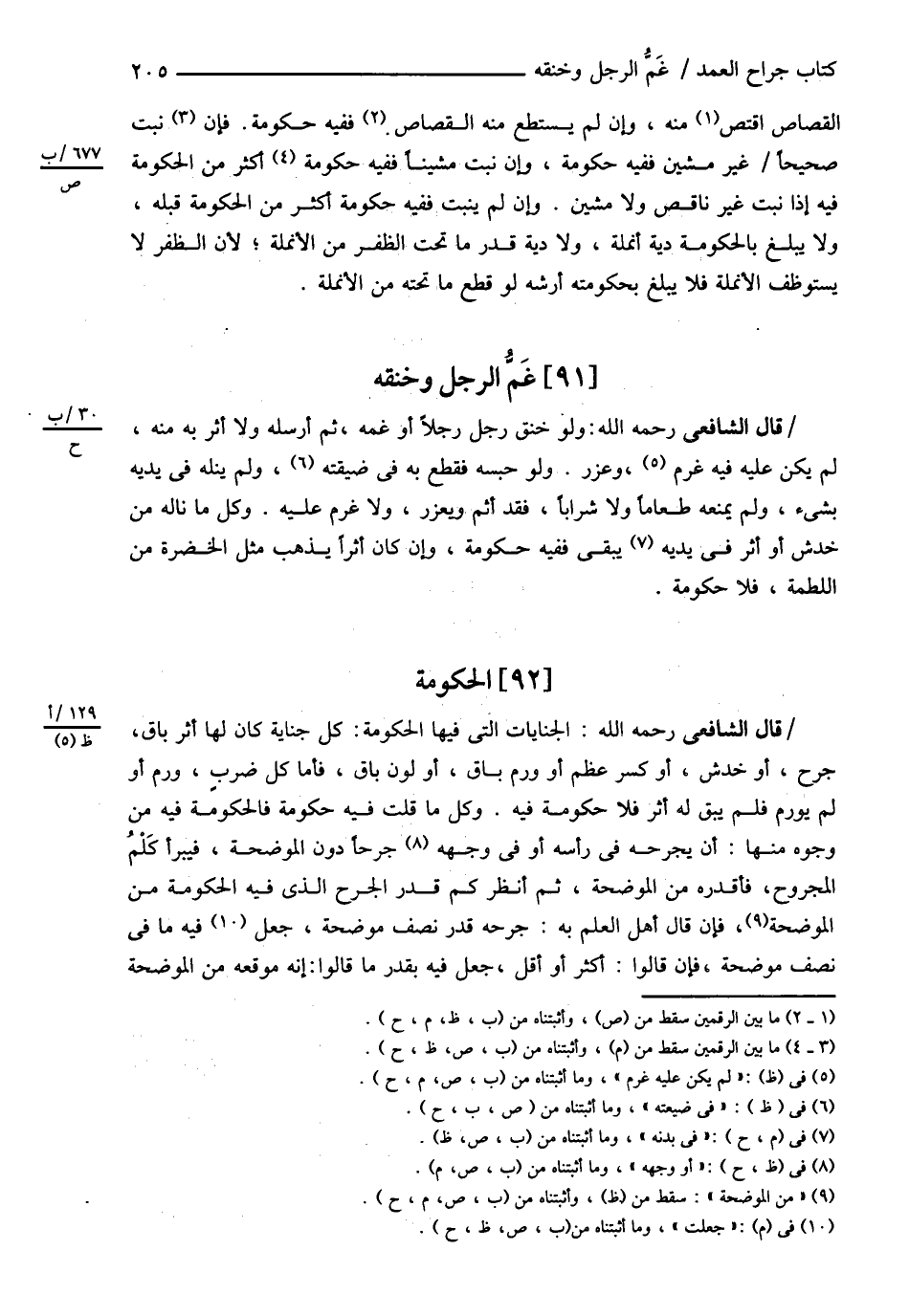 قَالَ الشَّافِعِيُّ : رحمه الله : الْجِنَايَاتُ الَّتِي فِيهَا الْحُكُومَةُ كُلُّ جِنَايَةٍ كَانَ لَهَا أَثَرٌ بَاقٍ : جُرْحٌ أَوْ خَدْشٌ أَوْ كَسْرُ عَظْمٍ أَوْ وَرَمٌ بَاقٍ أَوْ لَوْنٌ بَاقٍ فَأَمَّا كُلُّ ضَرْبٍ وَرِمَ أَوْ لَمْ يُورَمْ فَلَمْ يَبْقَ لَهُ أَثَرٌ فَلاَ حُكُومَةَ فِيهِ , وَكُلُّ مَا قُلْت فِيهِ حُكُومَةٌ فَالْحُكُومَةُ فِيهِ مِنْ وُجُوهٍ مِنْهَا أَنْ يَجْرَحَهُ فِي رَأْسِهِ أَوْ فِي وَجْهِهِ جُرْحًا دُونَ الْمُوضِحَةِ فَيَبْرَأُ كَلْمُ الْمَجْرُوحِ فَأُقَدِّرُهُ مِنْ الْمُوضِحَةِ , ثُمَّ أَنْظُرُ كَمْ قَدْرُ الْجُرْحِ الَّذِي فِيهِ الْحُكُومَةُ مِنْ الْمُوضِحَةِ , فَإِنْ قَالَ أَهْلُ الْعِلْمِ بِهِ : جُرْحُهُ قَدْرُ نِصْفِ مُوضِحَةٍ جُعِلَ فِيهِ مَا فِي نِصْفِ مُوضِحَةٍ فَإِنْ قَالُوا : أَكْثَرُ أَوْ أَقَلُّ جُعِلَ فِيهِ بِقَدْرِ مَا قَالُوا إنَّهُ مَوْقِعُهُ مِنْ الْمُوضِحَةِ@