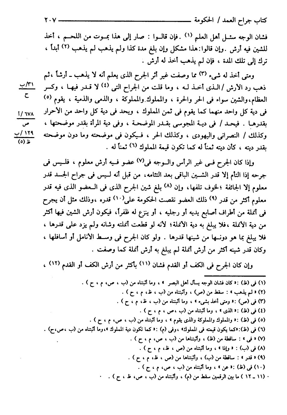 فَشَانَ الْوَجْهَ سُئِلَ أَهْلُ الْعِلْمِ فَإِنْ قَالُوا : صَارَ إلَى هَذَا بِمَوْتٍ مِنْ اللَّحْمِ أُخِذَ لِلشَّيْنِ فِيهِ أَرْشٌ وَإِنْ قَالُوا هَذَا مُشْكِلٌ وَإِنْ بَلَغَ مُدَّةَ كَذَا وَلَمْ يَذْهَبْ أَبَدًا تُرِكَ إلَى تِلْكَ الْمُدَّةِ فَإِنْ لَمْ يَذْهَبْ أُخِذَ لَهُ أَرْشٌ وَمَتَى أُخِذَ لَهُ شَيْءٌ مِمَّا وَصَفْت غَيْرُ أَثَرِ الْجُرْحِ الَّذِي يُعْلَمُ أَنَّهُ لاَ يَذْهَبُ أَرْشًا , ثُمَّ ذَهَبَ رَدَّ الْأَرْشَ الَّذِي أُخِذَ لَهُ وَمَا قُلْت مِنْ الْجِرَاحِ الَّتِي لاَ قَدْرَ فِيهَا وَكَسْرِ الْعِظَامِ وَالشَّيْنِ سَوَاءٌ فِي الْحُرِّ وَالْحُرَّةِ وَالْمَمْلُوكِ وَالْمَمْلُوكَةِ وَالذِّمِّيِّ وَالذِّمِّيَّةِ يَقُومُ فِي دِيَةِ كُلِّ وَاحِدٍ مِنْهُمَا كَمَا يَقُومُ فِي ثَمَنِ الْمَمْلُوكِ وَيُحَدُّ فِي دِيَةِ كُلِّ وَاحِدٍ مِنْ الْأَحْرَارِ بِقَدْرِهَا , فَيُحَدُّ فِي دِيَةِ الْمَجُوسِيِّ بِقَدْرِ الْمُوضِحَةِ وَفِي دِيَةِ الْمَرْأَةِ بِقَدْرِ مُوضِحَتِهَا , وَكَذَلِكَ النَّصْرَانِيُّ وَالْيَهُودِيُّ , وَكَذَلِكَ الْحُرُّ فَيَكُونُ فِي مُوضِحَتِهِ وَمَا دُونَ مُوضِحَتِهِ بِقَدْرِ دِيَتِهِ كَانَ دِيَتُهُ ثَمَنًا لَهُ كَمَا تَكُونُ قِيمَةُ الْمَمْلُوكِ ثَمَنًا لَهُ , وَإِذَا كَانَ الْجُرْحُ فِي غَيْرِ الرَّأْسِ وَالْوَجْهِ فِي عُضْوٍ فِيهِ أَرْشٌ مَعْلُومٌ فَلَيْسَ فِي جُرْحِهِ إذَا الْتَأَمَ إلَّا قَدْرُ الشَّيْنِ الْبَاقِي بَعْدَ الْتِئَامِهِ مِنْ قِبَلِ أَنَّهُ لَيْسَ فِي جِرَاحِ الْجَسَدِ قَدْرٌ مَعْلُومٌ إلَّا الْجَائِفَةَ لِخَوْفِ تَلَفِهَا وَإِذَا بَلَغَ شَيْنُ الْجُرْحِ الَّذِي فِي الْعُضْوِ الَّذِي فِيهِ قَدْرٌ مَعْلُومٌ أَكْثَرُ مِنْ ذَلِكَ الْعُضْوِ نَقَصَتْ الْحُكُومَةُ عَلَى قَدْرِهِ , وَذَلِكَ مِثْلُ أَنْ يُجْرَحَ فِي أُنْمُلَةٍ مِنْ أَطْرَافِ أَصَابِعِ يَدَيْهِ أَوْ رِجْلَيْهِ أَوْ يَنْزِعُ لَهُ ظُفُرًا فَيَكُونُ أَرْشُ الشَّيْنِ فِيهَا أَكْثَرَ مِنْ دِيَةِ الْأُنْمُلَةِ فَلاَ يَبْلُغُ بِهِ دِيَةَ أُنْمُلَةٍ ; لِأَنَّهُ لَوْ قُطِعَتْ أُنْمُلَتُهُ وَشَانَتْهُ لَمْ يَزِدْ عَلَى قَدْرِهَا فَلاَ يَبْلُغُ بِمَا هُوَ دُونَهَا مِنْ شَيْنِهَا قَدْرَهَا وَلَوْ كَانَ الْجُرْحُ فِي وَسَطِ الْأَنَامِلِ أَوْ أَسَافِلِهَا وَكَانَ قَدْرُ شَيْنِهِ أَكْثَرَ مِنْ أَرْشِ أُنْمُلَةٍ لَمْ يَبْلُغْ بِهِ أَرْشَ أُنْمُلَةٍ كَمَا وَصَفْت وَإِنْ كَانَ الْجُرْحُ فِي الْكَفِّ أَوْ الْقَدَمِ فَشَانَ بِأَكْثَرَ مِنْ أَرْشِ الْكَفِّ أَوْ الْقَدَمِ@