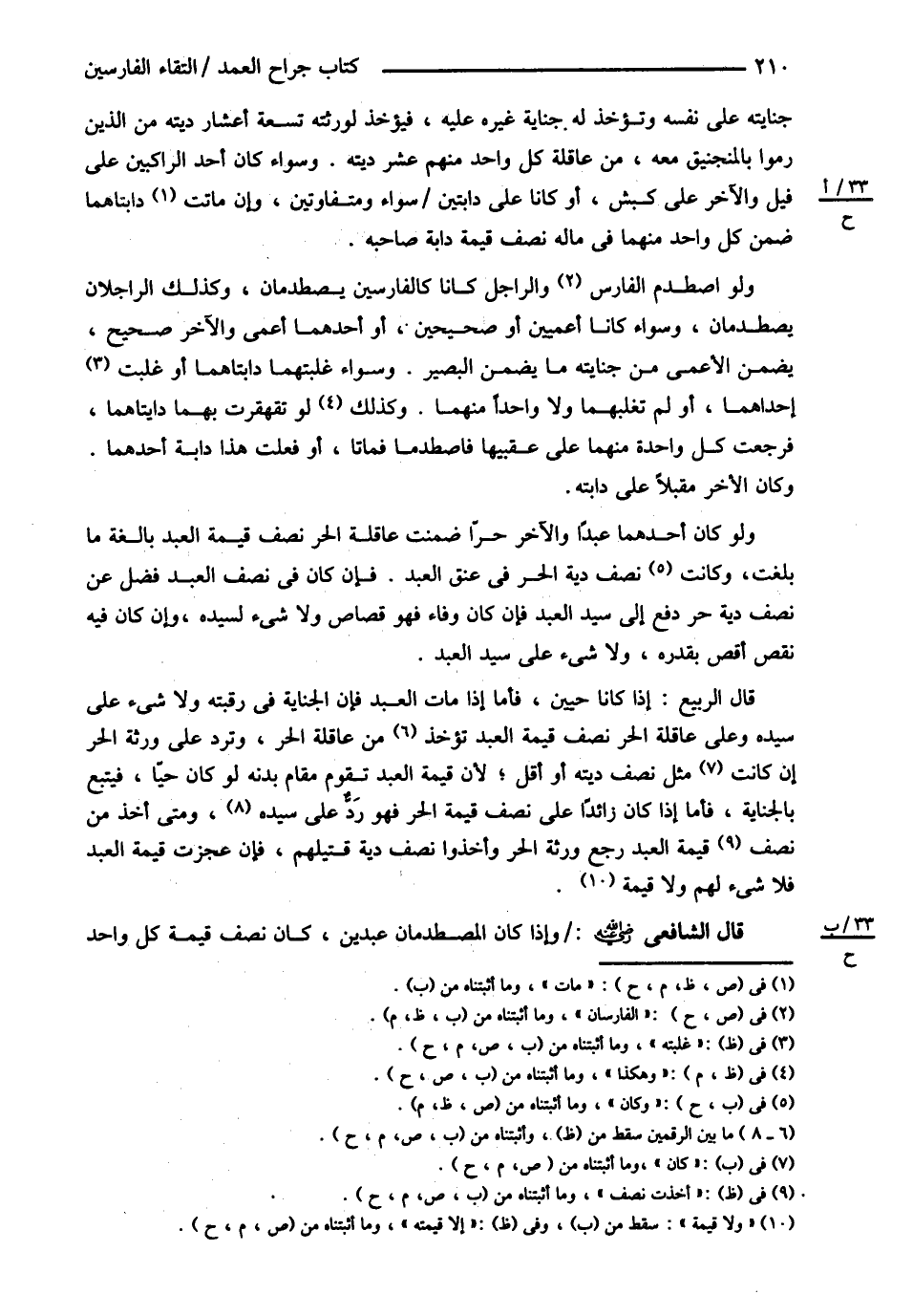 جِنَايَتِهِ عَلَى نَفْسِهِ وَتُؤْخَذُ لَهُ جِنَايَةُ غَيْرِهِ عَلَيْهِ فَيُؤْخَذُ لِوَرَثَتِهِ تِسْعَةُ أَعْشَارِ دِيَتِهِ مِنْ الَّذِينَ رَمَوْا بِالْمَنْجَنِيقِ مَعَهُ مِنْ عَاقِلَةِ كُلِّ وَاحِدٍ مِنْهُمْ عُشْرُ دِيَتِهِ وَسَوَاءٌ كَانَ أَحَدُ الرَّاكِبَيْنِ عَلَى فِيلٍ وَالْآخَرُ عَلَى كَبْشٍ أَوْ كَانَا عَلَى دَابَّتَيْنِ سَوَاءٌ وَمُتَفَاوِتَيْنِ وَإِنْ مَاتَتْ دَابَّتَاهُمَا ضَمِنَ كُلُّ وَاحِدٍ مِنْهُمَا فِي مَالِهِ نِصْفَ قِيمَةِ دَابَّةِ صَاحِبِهِ وَلَوْ اصْطَدَمَ الْفَارِسُ وَالرَّاجِلُ كَانَا كَالْفَارِسَيْنِ يَصْطَدِمَانِ . وَكَذَلِكَ الرَّاجِلاَنِ يَصْطَدِمَانِ وَسَوَاءٌ كَانَا أَعْمَيَيْنِ أَوْ صَحِيحَيْنِ أَوْ أَحَدُهُمَا أَعْمَى وَالْآخَرُ صَحِيحٌ يَضْمَنُ الْأَعْمَى مِنْ جِنَايَتِهِ مَا يَضْمَنُ الْبَصِيرُ وَسَوَاءٌ غَلَبَتْهُمَا دَابَّتَاهُمَا أَوْ غَلَبَتْ إحْدَاهُمَا أَوْ لَمْ تَغْلِبْهُمَا وَلاَ وَاحِدًا مِنْهُمَا , وَكَذَلِكَ لَوْ تَقَهْقَرَتْ بِهِمَا دَابَّتَاهُمَا فَرَجَّعَتْ كُلَّ وَاحِدَةٍ مِنْهُمَا عَلَى عَقِبَيْهَا فَاصْطَدَمَا فَمَاتَا , أَوْ فَعَلَتْ هَذَا دَابَّةُ أَحَدِهِمَا وَكَانَ الْآخَرُ مُقْبِلاً عَلَى دَابَّتِهِ وَلَوْ كَانَ أَحَدُهُمَا عَبْدًا وَالْآخَرُ حُرًّا ضَمِنَتْ عَاقِلَةُ الْحُرِّ نِصْفَ قِيمَةِ الْعَبْدِ بَالِغَةً مَا بَلَغَتْ وَكَانَ نِصْفُ دِيَةِ الْحُرِّ فِي عُنُقِ الْعَبْدِ فَإِنْ كَانَ فِي نِصْفِ قِيمَةِ الْعَبْدِ فَضْلٌ عَنْ نِصْفِ دِيَةِ حُرٍّ دُفِعَ إلَى سَيِّدِ الْعَبْدِ فَإِنْ كَانَ وَفَاءٌ فَهُوَ قِصَاصٌ وَلاَ شَيْءَ لِسَيِّدِهِ وَإِنْ كَانَ فِيهِ نَقْصٌ أُقِصَّ بِقَدْرِهِ وَلاَ شَيْءَ عَلَى سَيِّدِ الْعَبْدِ ( قَالَ الرَّبِيعُ ) إذَا كَانَا حَيَّيْنِ فَأَمَّا إذَا مَاتَ الْعَبْدُ فَإِنَّ الْجِنَايَةَ فِي رَقَبَتِهِ وَلاَ شَيْءَ عَلَى سَيِّدِهِ وَعَلَى عَاقِلَةِ الْحُرِّ نِصْفُ قِيمَةِ الْعَبْدِ تُؤْخَذُ مِنْ عَاقِلَةِ الْحُرِّ وَتُرَدُّ عَلَى وَرَثَةِ الْحُرِّ إنْ كَانَ مِثْلَ نِصْفِ دِيَتِهِ أَوْ أَقَلَّ ; لِأَنَّ قِيمَةَ الْعَبْدِ تَقُومُ مَقَامَ بَدَنِهِ لَوْ كَانَ حَيًّا فَيُتْبَعُ بِالْجِنَايَةِ فَأَمَّا إذَا كَانَ زَائِدًا عَلَى نِصْفِ قِيمَةِ الْحُرِّ فَهُوَ رَدٌّ عَلَى سَيِّدِهِ وَمَتَى أُخِذَ مِنْ نِصْفِ قِيمَةِ الْعَبْدِ رَجَعَ وَرَثَةُ الْحُرِّ وَأَخَذُوا نِصْفَ دِيَةِ قَتِيلِهِمْ فَإِنْ عَجَزَتْ قِيمَةُ الْعَبْدِ فَلاَ شَيْءَ لَهُمْ .