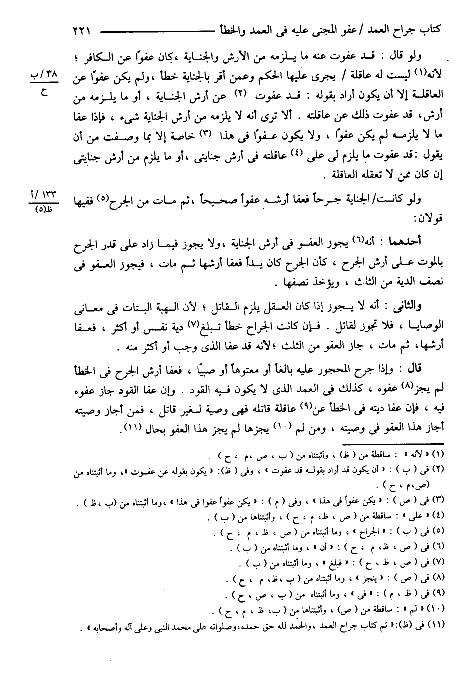 , وَلَوْ قَالَ : قَدْ عَفَوْت عَنْهُ مَا يَلْزَمُهُ مِنْ الْأَرْشِ وَالْجِنَايَةِ كَانَ عَفْوًا عَنْ الْكَافِرِ ; لِأَنَّهُ لَيْسَتْ لَهُ عَاقِلَةٌ يَجْرِي عَلَيْهَا الْحُكْمُ وَعَمَّنْ أَقَرَّ بِالْجِنَايَةِ خَطَأً وَلَمْ يَكُنْ عَفْوًا عَنْ الْعَاقِلَةِ إلَّا أَنْ يَكُونَ قَدْ أَرَادَ بِقَوْلِهِ قَدْ عَفَوْت عَنْ أَرْشِ الْجِنَايَةِ أَوْ مَا يَلْزَمُهُ مِنْ أَرْشٍ قَدْ عَفَوْت ذَلِكَ عَنْ عَاقِلَتِهِ . أَلاَ تَرَى أَنَّهُ لاَ يَلْزَمُهُ مِنْ أَرْشِ الْجِنَايَةِ شَيْءٌ فَإِذَا عَفَا مَا لاَ يَلْزَمُهُ لَمْ يَكُنْ عَفْوًا وَلاَ يَكُونُ عَفْوًا فِي هَذَا خَاصَّةً إلَّا بِمَا وَصَفْت مِنْ أَنْ يَقُولَ قَدْ عَفَوْت مَا يَلْزَمُ لِي عَلَى عَاقِلَتِهِ فِي أَرْشِ جِنَايَتِي أَوْ مَا يَلْزَمُ مِنْ أَرْشِ جِنَايَتِي إنْ كَانَ مِمَّنْ لاَ تَعْقِلُهُ الْعَاقِلَةُ وَلَوْ كَانَتْ الْجِنَايَةُ جُرْحًا فَعَفَا أَرْشَهُ عَفْوًا صَحِيحًا ثُمَّ مَاتَ مِنْ الْجِرَاحِ فَفِيهَا قَوْلاَنِ : أَحَدُهُمَا : أَنَّهُ يَجُوزُ الْعَفْوُ فِي أَرْشِ الْجِنَايَةِ وَلاَ يَجُوزُ فِيمَا زَادَ عَلَى قَدْرِ الْجُرْحِ بِالْمَوْتِ عَلَى أَرْشِ الْجُرْحِ كَأَنَّ الْجُرْحَ كَانَ يَدًا فَعَفَا أَرْشَهَا , ثُمَّ مَاتَ فَيَجُوزُ الْعَفْوُ فِي نِصْفِ الدِّيَةِ مِنْ الثُّلُثِ وَيُؤْخَذُ نِصْفُهَا . وَالثَّانِي : أَنَّهُ لاَ يَجُوزُ إذَا كَانَ الْعَقْلُ يَلْزَمُ الْقَاتِلَ ; لِأَنَّ الْهِبَةَ الْبَتَاتَ فِي مَعَانِي الْوَصَايَا فَلاَ تَجُوزُ لِقَاتِلٍ فَإِنْ كَانَتْ الْجِرَاحُ خَطَأً تَبْلُغُ دِيَةَ نَفْسٍ أَوْ أَكْثَرَ فَعَفَا أَرْشَهَا , ثُمَّ مَاتَ جَازَ الْعَفْوُ مِنْ الثُّلُثِ ; لِأَنَّهُ قَدْ عَفَا الَّذِي وَجَبَ أَوْ أَكْثَرَ مِنْهُ . ( قَالَ ) وَإِذَا جُرِحَ الْمَحْجُورُ عَلَيْهِ بَالِغًا أَوْ مَعْتُوهًا أَوْ صَبِيًّا فَعَفَا أَرْشَ الْجُرْحِ فِي الْخَطَأِ لَمْ يَجُزْ عَفْوُهُ , وَكَذَلِكَ فِي الْعَمْدِ الَّذِي لاَ يَكُونُ فِيهِ الْقَوَدُ وَإِنْ عَفَا الْقَوَدَ جَازَ عَفْوُهُ فِيهِ فَإِنْ عَفَا دِيَتَهُ فِي الْخَطَأِ عَنْ عَاقِلَةِ قَاتِلِهِ فَهِيَ وَصِيَّةٌ لِغَيْرِ قَاتِلٍ فَمَنْ أَجَازَ وَصِيَّتَهُ أَجَازَ هَذَا الْعَفْوَ فِي وَصِيَّتِهِ وَمَنْ لَمْ يُجِزْهَا لَمْ يُجِزْ هَذَا الْعَفْوَ بِحَالٍ . .@