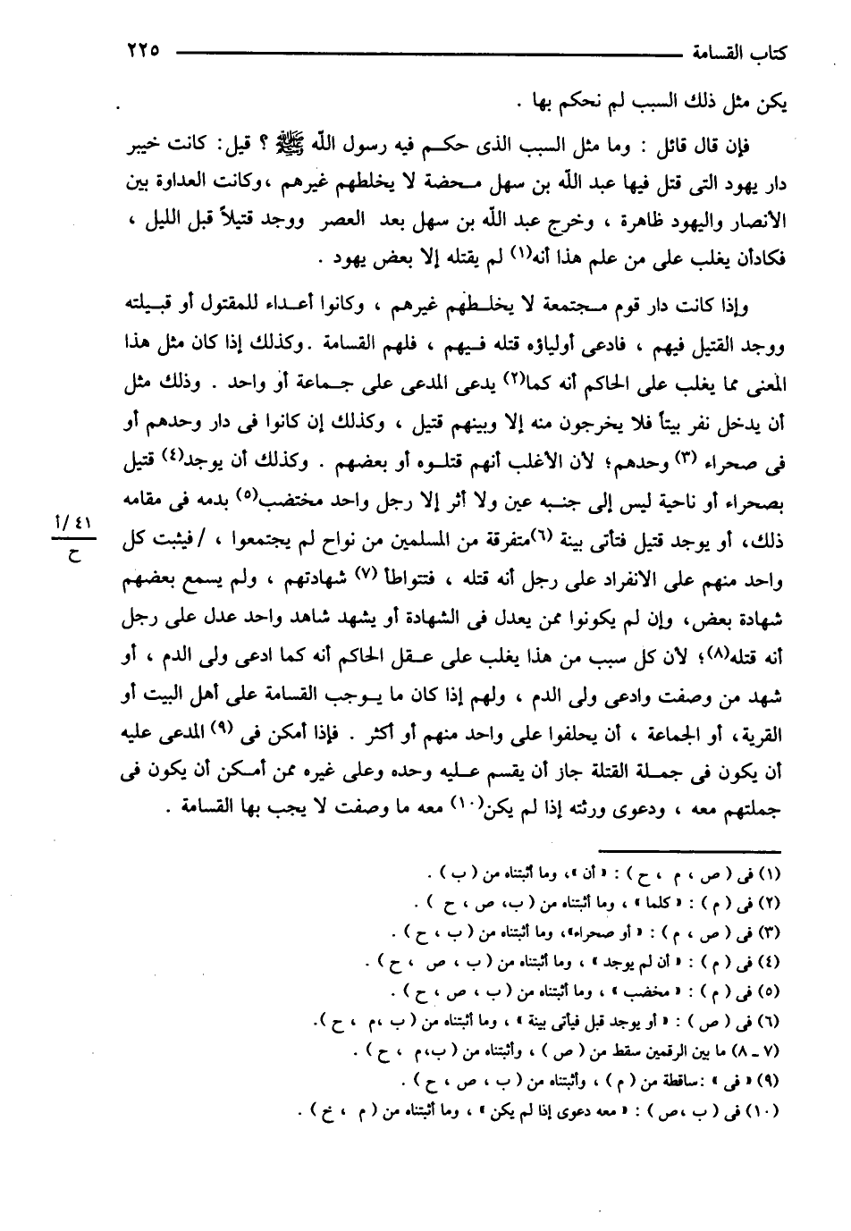 يَكُنْ مِثْلُ ذَلِكَ السَّبَبِ لَمْ نَحْكُمْ بِهَا , فَإِنْ قَالَ قَائِلٌ : وَمَا مِثْلُ السَّبَبِ الَّذِي حَكَمَ فِيهِ رَسُولُ اللَّهِ - صلى الله عليه وسلم - ؟ قِيلَ كَانَتْ خَيْبَرُ دَارَ يَهُودَ الَّتِي قُتِلَ فِيهَا عَبْدُ اللَّهِ بْنُ سَهْلٍ مَحْضَةً لاَ يَخْلِطُهُمْ غَيْرُهُمْ وَكَانَتْ الْعَدَاوَةُ بَيْن الْأَنْصَارِ وَالْيَهُودِ ظَاهِرَةً وَخَرَجَ عَبْدُ اللَّهِ بْنُ سَهْلٍ بَعْدَ الْعَصْرِ وَوُجِدَ قَتِيلاً قَبْلَ اللَّيْلِ فَكَادَ أَنْ يَغْلِبَ عَلَى مَنْ عَلِمَ هَذَا أَنَّهُ لَمْ يَقْتُلْهُ إلَّا بَعْضُ يَهُودَ وَإِذَا كَانَتْ دَارُ قَوْمٍ مُجْتَمِعَةً لاَ يَخْلِطُهُمْ غَيْرُهُمْ وَكَانُوا أَعْدَاءً لِلْمَقْتُولِ أَوْ قَبِيلَتِهِ وَوُجِدَ الْقَتِيلُ فِيهِمْ فَادَّعَى أَوْلِيَاؤُهُ قَتْلَهُ فِيهِمْ فَلَهُمْ الْقَسَامَةُ , وَكَذَلِكَ إذَا كَانَ مِثْلُ هَذَا الْمَعْنَى مِمَّا يَغْلِبُ عَلَى الْحَاكِمِ أَنَّهُ كَمَا يَدَّعِي الْمُدَّعِي عَلَى جَمَاعَةٍ أَوْ وَاحِدٍ . وَذَلِكَ مِثْلُ أَنْ يَدْخُلَ نَفَرٌ بَيْتًا فَلاَ يَخْرُجُونَ مِنْهُ إلَّا وَبَيْنَهُمْ قَتِيلٌ , وَكَذَلِكَ إنْ كَانُوا فِي دَارٍ وَحْدَهُمْ أَوْ فِي صَحْرَاءَ وَحْدَهُمْ ; لِأَنَّ الْأَغْلَبَ أَنَّهُمْ قَتَلُوهُ أَوْ بَعْضُهُمْ , وَكَذَلِكَ أَنْ يُوجَدَ قَتِيلٌ بِصَحْرَاءَ أَوْ نَاحِيَةٍ لَيْسَ إلَى جَنْبِهِ عَيْنٌ وَلاَ أَثَرٌ إلَّا رَجُلٌ وَاحِدٌ مُخْتَضِبٌ بِدَمِهِ فِي مَقَامِهِ ذَلِكَ أَوْ يُوجَدَ قَتِيلٌ فَتَأْتِيَ بَيِّنَةٌ مُتَفَرِّقَةٌ مِنْ الْمُسْلِمِينَ مِنْ نَوَاحٍ لَمْ يَجْتَمِعُوا فَيُثْبِتُ كُلُّ وَاحِدٍ مِنْهُمْ عَلَى الِانْفِرَادِ عَلَى رَجُلٍ أَنَّهُ قَتَلَهُ فَتَتَوَاطَأُ شَهَادَتُهُمْ وَلَمْ يَسْمَعْ بَعْضُهُمْ شَهَادَةَ بَعْضٍ وَإِنْ لَمْ يَكُونُوا مِمَّنْ يَعْدِلُ فِي الشَّهَادَةِ أَوْ يَشْهَدَ شَاهِدٌ وَاحِدٌ عَدْلٌ عَلَى رَجُلٍ أَنَّهُ قَتَلَهُ ; لِأَنَّ كُلَّ سَبَبٍ مِنْ هَذَا يَغْلِبُ عَلَى عَقْلِ الْحَاكِمِ أَنَّهُ كَمَا ادَّعَى وَلِيُّ الدَّمِ أَوْ شَهِدَ مَنْ وَصَفْت وَادَّعَى وَلِيُّ الدَّمِ , وَلَهُمْ إذَا كَانَ مَا يُوجِبُ الْقَسَامَةَ عَلَى أَهْلِ الْبَيْتِ أَوْ الْقَرْيَةِ أَوْ الْجَمَاعَةِ أَنْ يَحْلِفُوا عَلَى وَاحِدٍ مِنْهُمْ أَوْ أَكْثَرَ . فَإِذَا أَمْكَنَ فِي الْمُدَّعَى عَلَيْهِ أَنْ يَكُونَ فِي جُمْلَةِ الْقَتَلَةِ جَازَ أَنْ يُقْسِمَ عَلَيْهِ وَحْدَهُ وَعَلَى غَيْرِهِ مِمَّنْ أَمْكَنَ أَنْ يَكُونَ فِي جُمْلَتِهِمْ مَعَهُ دَعْوَى إذَا لَمْ يَكُنْ مَعَهُ مَا وَصَفْت لاَ يَجِبُ بِهَا الْقَسَامَةُ ,@