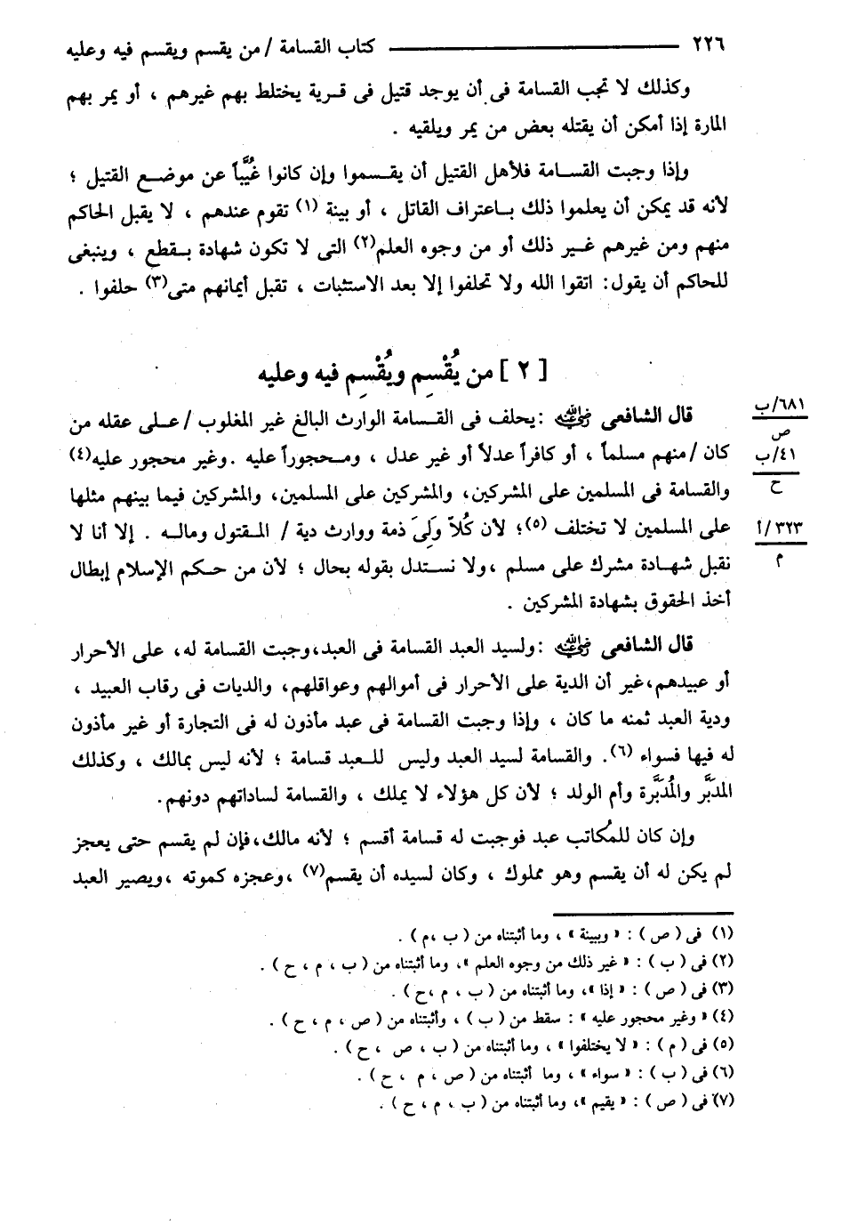 قَالَ الشَّافِعِيُّ : رحمه الله : يَحْلِفُ فِي الْقَسَامَةِ الْوَارِثُ الْبَالِغُ غَيْرُ الْمَغْلُوبِ عَلَى عَقْلِهِ مَنْ كَانَ مِنْهُمْ مُسْلِمًا أَوْ كَافِرًا عَدْلاً أَوْ غَيْرَ عَدْلٍ وَمَحْجُورًا عَلَيْهِ . وَالْقَسَامَةُ فِي الْمُسْلِمِينَ عَلَى الْمُشْرِكِينَ وَالْمُشْرِكِينَ عَلَى الْمُسْلِمِينَ وَالْمُشْرِكِينَ فَمَا بَيْنَهُمْ مِثْلُهَا عَلَى الْمُسْلِمِينَ لاَ تَخْتَلِفُ ; لِأَنَّ كُلًّا وَلِيُّ دَمِهِ وَوَارِثُ دِيَةِ الْمَقْتُولِ وَمَالِهِ إلَّا أَنَّا لاَ نَقْبَلُ شَهَادَةَ مُشْرِكٍ عَلَى مُسْلِمٍ وَلاَ نَسْتَدِلُّ بِقَوْلِهِ بِحَالٍ ; لِأَنَّ حُكْمَ الْإِسْلاَمِ إبْطَالُ أَخْذِ الْحُقُوقِ بِشَهَادَةِ الْمُشْرِكِينَ