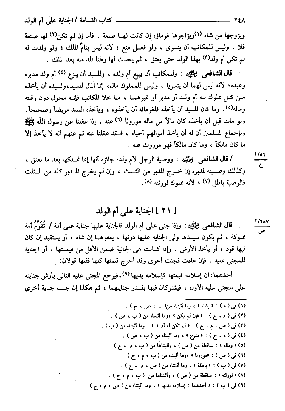 قَالَ الشَّافِعِيُّ : وَإِذَا جَنَى عَلَى أُمِّ الْوَلَدِ فَالْجِنَايَةُ عَلَيْهَا جِنَايَةٌ عَلَى أَمَةٍ تُقَوَّمُ أَمَةً مَمْلُوكَةً , ثُمَّ يَكُونُ سَيِّدُهَا وَلِيُّ الْجِنَايَةِ عَلَيْهَا دُونَهَا يَعْفُوهَا إنْ شَاءَ أَوْ يَسْتَقِيدُ إنْ كَانَ فِيهَا قَوَدٌ أَوْ يَأْخُذُ الْأَرْشَ وَإِذَا كَانَتْ هِيَ الْجَانِيَةُ ضَمِنَ الْأَقَلَّ مِنْ قِيمَتِهَا أَوْ الْجِنَايَةَ لِلْمَجْنِيِّ عَلَيْهِ فَإِنْ عَادَتْ فَجَنَتْ أُخْرَى وَقَدْ أَخْرَجَ قِيمَتَهَا كُلَّهَا فَفِيهَا قَوْلاَنِ . أَحَدُهُمَا : إسْلاَمُهُ بَدَنَهَا فَيَرْجِعُ الْمَجْنِيُّ عَلَيْهِ الثَّانِي بِأَرْشِ جِنَايَتِهِ عَلَى الْمَجْنِيِّ عَلَيْهِ الْأَوَّلِ فَيَشْتَرِكَانِ فِيهَا بِقَدْرِ جِنَايَتِهِمَا , ثُمَّ هَكَذَا إنْ جَنَتْ جِنَايَةً أُخْرَى@