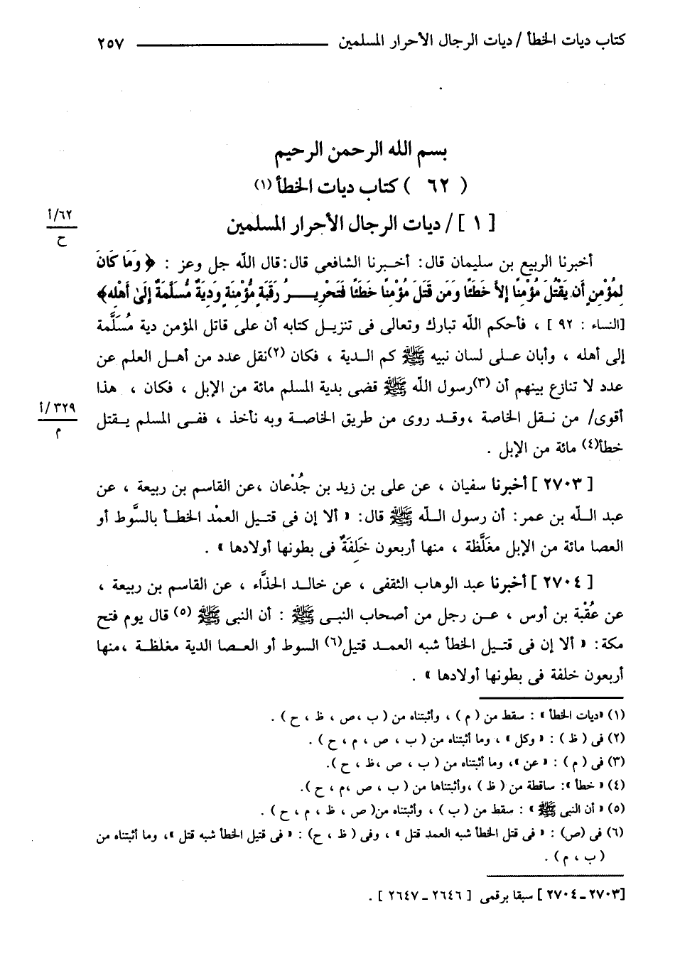 دِيَاتُ الْخَطَأِ دِيَاتُ الرِّجَالِ الْأَحْرَارِ الْمُسْلِمِينَ أَخْبَرَنَا الرَّبِيعُ بْنُ سُلَيْمَانَ قَالَ أَخْبَرَنَا الشَّافِعِيُّ قَالَ : قَالَ اللَّهُ عَزَّ وَجَلَّ : ? وَمَا كَانَ لِمُؤْمِنٍ أَنْ يَقْتُلَ مُؤْمِنًا إلَّا خَطَأً وَمَنْ قَتَلَ مُؤْمِنًا خَطَأً فَتَحْرِيرُ رَقَبَةٍ مُؤْمِنَةٍ وَدِيَةٌ مُسَلَّمَةٌ إلَى أَهْلِهِ ? فَأَحْكَمَ اللَّهُ تَبَارَكَ وَتَعَالَى فِي تَنْزِيلِ كِتَابِهِ أَنَّ عَلَى قَاتِلِ الْمُؤْمِنِ دِيَةٌ مُسَلَّمَةٌ إلَى أَهْلِهِ وَأَبَانَ عَلَى لِسَانِ نَبِيِّهِ - صلى الله عليه وسلم - كَمْ الدِّيَةُ فَكَانَ نَقْلُ عَدَدٍ مِنْ أَهْلِ الْعِلْمِ عَنْ عَدَدٍ لاَ تَنَازُعَ بَيْنَهُمْ أَنَّ رَسُولَ اللَّهِ - صلى الله عليه وسلم - قَضَى بِدِيَةِ الْمُسْلِمِ مِائَةً مِنْ الْإِبِلِ فَكَانَ هَذَا أَقْوَى مِنْ نَقْلِ الْخَاصَّةِ وَقَدْ رُوِيَ مِنْ طَرِيقِ الْخَاصَّةِ وَبِهِ نَأْخُذُ فَفِي الْمُسْلِمِ يُقْتَلُ خَطَأً مِائَةٌ مِنْ الْإِبِلِ أَخْبَرَنَا سُفْيَانُ عَنْ عَلِيِّ بْنِ زَيْدِ بْنِ جُدْعَانَ عَنْ الْقَاسِمِ بْنِ رَبِيعَةَ عَنْ عَبْدِ اللَّهِ بْنِ عُمَرَ أَنَّ رَسُولَ اللَّهِ - صلى الله عليه وسلم - قَالَ : ? أَلاَ إنَّ فِي قَتِيلِ الْعَمْدِ الْخَطَأَ بِالسَّوْطِ أَوْ الْعَصَا مِائَةٌ مِنْ الْإِبِلِ مُغَلَّظَةً مِنْهَا أَرْبَعُونَ خَلِفَةً فِي بُطُونِهَا أَوْلاَدُهَا ? أَخْبَرَنَا عَبْدُ الْوَهَّابِ الثَّقَفِيُّ عَنْ خَالِدٍ الْحَذَّاءَ عَنْ الْقَاسِمِ بْنِ رَبِيعَةَ عَنْ عُقْبَةَ بْنِ أَوْسٍ عَنْ رَجُلٍ مِنْ أَصْحَابِ النَّبِيِّ - صلى الله عليه وسلم - قَالَ يَوْمَ فَتْحِ مَكَّةَ أَلاَ : ? إنَّ فِي قَتِيلِ الْخَطَأِ شِبْهِ الْعَمْدِ قَتِيلِ السَّوْطِ أَوْ الْعَصَا الدِّيَةَ مُغَلَّظَةً مِنْهَا أَرْبَعُونَ خَلِفَةً فِي بُطُونِهَا أَوْلاَدُهَا ?@