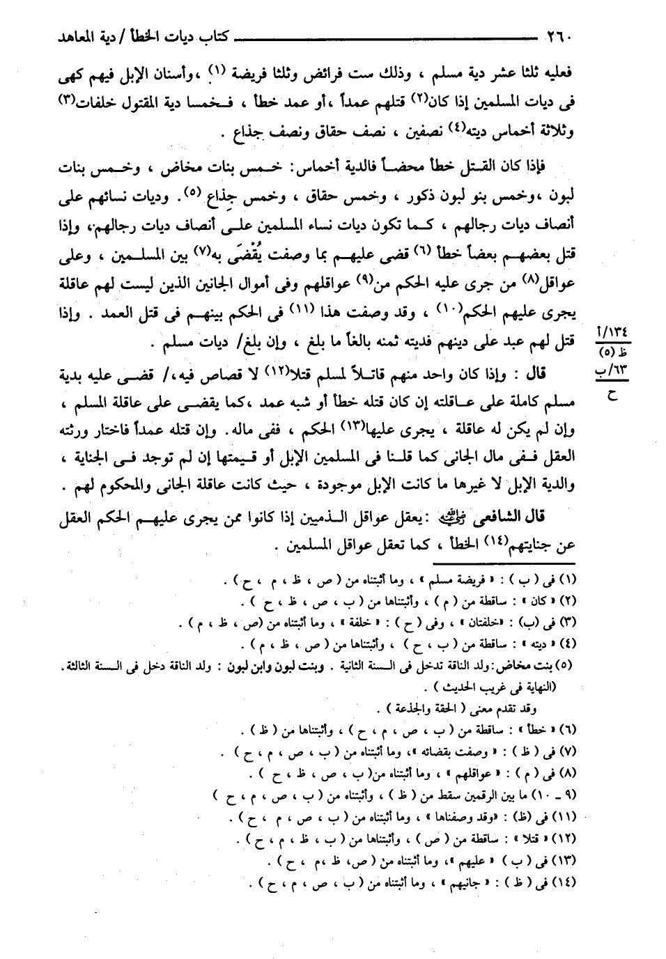 فَعَلَيْهِ ثُلُثَا عُشْرِ دِيَةِ مُسْلِمٍ وَذَلِكَ سِتُّ فَرَائِضَ وَثُلُثَا فَرِيضَةِ مُسْلِمٍ وَأَسْنَانُ الْإِبِلِ فِيهِمْ كَهِيَ فِي دِيَاتِ الْمُسْلِمِينَ إذَا كَانَ قَتَلَهُمْ عَمْدًا أَوْ عَمْدَ خَطَأٍ فَخُمُسَا دِيَةِ الْمَقْتُولِ خَلِفَتَانِ وَثَلاَثَةُ أَخْمَاسٍ نِصْفَيْنِ : نِصْفٌ حِقَاقٌ وَنِصْفٌ جِذَاعٌ فَإِذَا كَانَ الْقَتْلُ خَطَأً مَحْضًا فَالدِّيَةُ أَخْمَاسٌ : خَمْسٌ بَنَاتُ مَخَاضٍ وَخَمْسٌ بَنَاتُ لَبُونٍ وَخَمْسٌ بَنُو لَبُونٍ ذُكُورٍ وَخَمْسٌ حِقَاقٌ وَخَمْسٌ جِذَاعٌ , وَدِيَاتُ نِسَائِهِمْ عَلَى أَنْصَافِ دِيَاتِ رِجَالِهِمْ كَمَا تَكُونُ دِيَاتُ نِسَاءِ الْمُسْلِمِينَ عَلَى أَنْصَافِ دِيَاتِ رِجَالِهِمْ وَإِذَا قَتَلَ بَعْضُهُمْ بَعْضًا قُضِيَ عَلَيْهِمْ بِمَا وَصَفْت يُقْضَى بِهِ بَيْنَ الْمُسْلِمِينَ وَعَلَى عَوَاقِلِ مَنْ جَرَى عَلَيْهِ الْحُكْمُ وَقَدْ وَصَفْت هَذَا فِي الْحُكْمِ بَيْنَهُمْ فِي قَتْلِ الْعَمْدِ وَإِذَا قُتِلَ لَهُمْ عَبْدٌ عَلَى دِينِهِمْ فَدِيَتُهُ ثَمَنُهُ بَالِغًا مَا بَلَغَ وَإِنْ بَلَغَ دِيَاتِ مُسْلِمٍ ( قَالَ ) وَإِذَا كَانَ وَاحِدٌ مِنْهُمْ قَاتِلاً لِمُسْلِمٍ قَتْلاً لاَ قِصَاصَ فِيهِ قُضِيَ عَلَيْهِ بِدِيَةِ مُسْلِمٍ كَامِلَةٍ عَلَى عَاقِلَتِهِ إنْ كَانَ قَتْلُهُ خَطَأً أَوْ شِبْهَ عَمْدٍ كَمَا يُقْضَى عَلَى عَاقِلَةِ الْمُسْلِمِ , وَإِنْ لَمْ يَكُنْ لَهُ عَاقِلَةٌ يَجْرِي عَلَيْهِمْ الْحُكْمُ فَفِي مَالِهِ وَإِنْ قَتَلَهُ عَمْدًا فَاخْتَارَ وَرَثَتُهُ الْعَقْلَ فَفِي مَالِ الْجَانِي كَمَا قُلْنَا فِي الْمُسْلِمِينَ الْإِبِلُ أَوْ قِيمَتُهَا إنْ لَمْ تُوجَدْ فِي الْجِنَايَةِ وَالدِّيَةُ وَالْإِبِلُ لاَ غَيْرُهَا مَا كَانَتْ الْإِبِلُ مَوْجُودَةً حَيْثُ كَانَتْ عَاقِلَةُ الْجَانِي وَالْمَحْكُومِ لَهُمْ