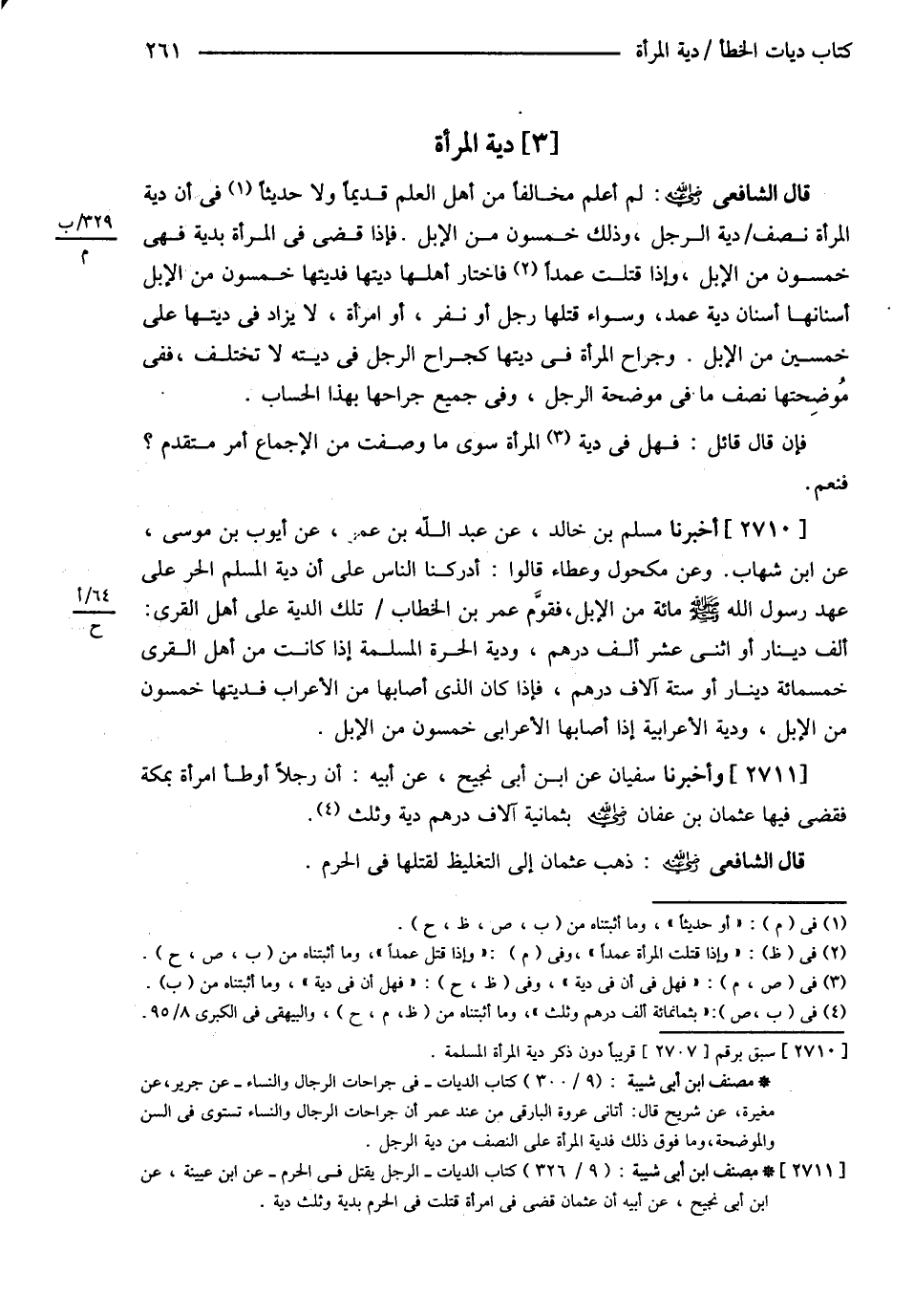 قَالَ الشَّافِعِيُّ : رحمه الله تعالى : لَمْ أَعْلَمْ مُخَالِفًا مِنْ أَهْلِ الْعِلْمِ قَدِيمًا وَلاَ حَدِيثًا فِي أَنَّ دِيَةَ الْمَرْأَةِ نِصْفُ دِيَةِ الرَّجُلِ وَذَلِكَ خَمْسُونَ مِنْ الْإِبِلِ فَإِذَا قَضَى فِي الْمَرْأَةِ بِدِيَةٍ فَهِيَ خَمْسُونَ مِنْ الْإِبِلِ وَإِذَا قُتِلَتْ عَمْدًا فَاخْتَارَ أَهْلُهَا دِيَتَهَا فَدِيَتُهَا خَمْسُونَ مِنْ الْإِبِلِ أَسْنَانُهَا أَسْنَانُ دِيَةِ عَمْدٍ وَسَوَاءٌ قَتَلَهَا رَجُلٌ أَوْ نَفَرٌ أَوْ امْرَأَةٌ لاَ يُزَادُ فِي دِيَتِهَا عَلَى خَمْسِينَ مِنْ الْإِبِلِ وَجِرَاحُ الْمَرْأَةِ فِي دِيَتِهَا كَجِرَاحِ الرَّجُلِ فِي دِيَتِهِ لاَ تَخْتَلِفُ , فَفِي مُوضِحَتِهَا نِصْفُ مَا فِي مُوضِحَةِ الرَّجُلِ وَفِي جَمِيعِ جِرَاحِهَا بِهَذَا الْحِسَابِ , فَإِنْ قَالَ قَائِلٌ فَهَلْ فِي دِيَةِ الْمَرْأَةِ سِوَى مَا وَصَفْت مِنْ الْإِجْمَاعِ أَمْرٌ مُتَقَدِّمٌ ؟ فَنَعَمْ أَخْبَرَنَا مُسْلِمُ بْنُ خَالِدٍ عَنْ عَبْدِ اللَّهِ بْنِ عُمَرَ عَنْ أَيُّوبَ بْنِ مُوسَى عَنْ ابْنِ شِهَابٍ وَعَنْ مَكْحُولٍ وَعَطَاءٍ قَالُوا أَدْرَكْنَا النَّاسَ عَلَى أَنَّ : ? دِيَةَ الْحُرِّ الْمُسْلِمِ عَلَى عَهْدِ رَسُولِ اللَّهِ - صلى الله عليه وسلم - مِائَةٌ مِنْ الْإِبِلِ ? فَقَوَّمَ عُمَرُ بْنُ الْخَطَّابِ تِلْكَ الدِّيَةَ عَلَى أَهْلِ الْقُرَى أَلْفَ دِينَارٍ أَوْ اثْنَيْ عَشَرَ أَلْفَ دِرْهَمٍ وَدِيَةُ الْحُرَّةِ الْمُسْلِمَةِ إذَا كَانَتْ مِنْ أَهْلِ الْقُرَى خَمْسُمِائَةِ دِينَارٍ أَوْ سِتَّةُ آلاَفِ دِرْهَمٍ فَإِذَا كَانَ الَّذِي أَصَابَهَا مِنْ الْأَعْرَابِ فَدِيَتُهَا خَمْسُونَ مِنْ الْإِبِلِ وَدِيَةُ الْأَعْرَابِيَّةِ إذَا أَصَابَهَا الْأَعْرَابِيُّ خَمْسُونَ مِنْ الْإِبِلِ وَأَخْبَرَنَا سُفْيَانُ عَنْ ابْنِ أَبِي نَجِيحٍ عَنْ أَبِيهِ أَنَّ رَجُلاً أَوْطَأَ امْرَأَةً بِمَكَّةَ فَقَضَى فِيهَا عُثْمَانُ بْنُ عَفَّانَ رضي الله عنه بِثَمَانِمِائَةِ أَلْفِ دِرْهَمٍ وَثُلُثٍ .