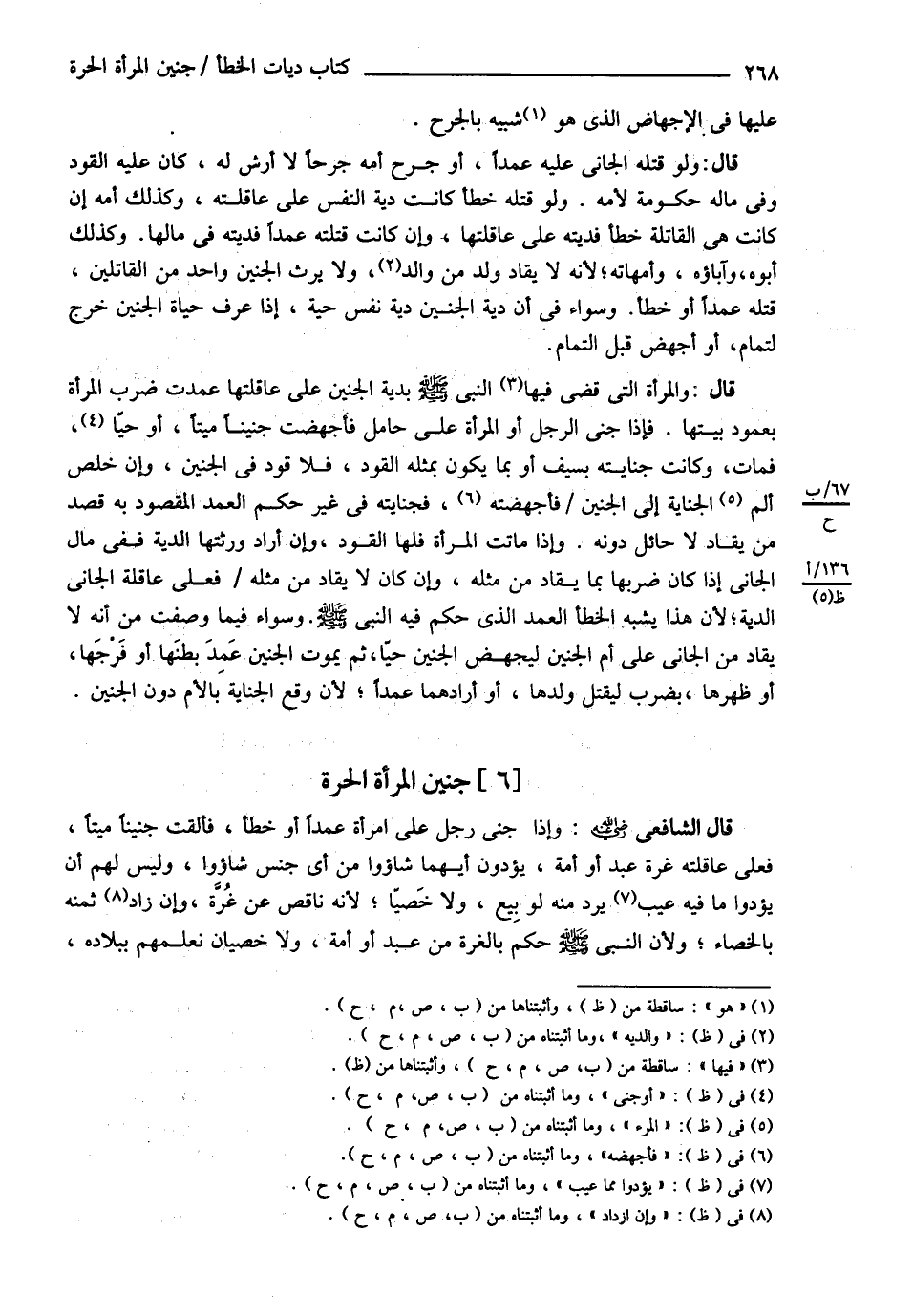 عَلَيْهَا فِي الْإِجْهَاضِ الَّذِي هُوَ شَبِيهٌ بِالْجُرْحِ ( قَالَ ) وَلَوْ قَتَلَهُ الْجَانِي عَلَيْهِ عَمْدًا أَوْ جَرَحَ أُمَّهُ جُرْحًا لاَ أَرْشَ لَهُ كَانَ عَلَيْهِ الْقَوَدُ وَفِي مَالِهِ حُكُومَةٌ لِأُمِّهِ وَلَوْ قَتَلَهُ خَطَأً كَانَتْ دِيَةُ النَّفْسِ عَلَى عَاقِلَتِهِ , وَكَذَلِكَ أُمُّهُ إنْ كَانَتْ هِيَ الْقَاتِلَةُ خَطَأً فَدِيَتُهُ عَلَى عَاقِلَتِهَا وَإِنْ كَانَتْ قَتَلَتْهُ عَمْدًا فَدِيَتُهُ فِي مَالِهَا . وَكَذَلِكَ أَبُوهُ وَآبَاؤُهُ وَأُمَّهَاتُهُ ; لِأَنَّهُ لاَ يُقَادُ وَلَدٌ مِنْ وَالِدٍ وَلاَ يَرِثُ الْجَنِينَ وَاحِدٌ مِنْ الْقَاتِلِينَ قَتَلَهُ عَمْدًا أَوْ خَطَأً وَسَوَاءٌ فِي أَنَّ دِيَةَ الْجَنِينِ دِيَةُ نَفْسٍ حَيَّةٍ إذَا عَرَفَ حَيَاةَ الْجَنِينِ خَرَجَ لِتَمَامٍ أَوْ أُجْهِضَ قَبْلَ التَّمَامِ ( قَالَ ) وَالْمَرْأَةُ الَّتِي قَضَى النَّبِيُّ - صلى الله عليه وسلم - بِدِيَةِ الْجَنِينِ عَلَى عَاقِلَتِهَا عَمَدَتْ ضَرْبَ الْمَرْأَةِ بِعَمُودِ بَيْتِهَا فَإِذَا جَنَى الرَّجُلُ أَوْ الْمَرْأَةُ عَلَى حَامِلٍ فَأَجْهَضَتْ جَنِينًا مَيِّتًا أَوْ حَيًّا فَمَاتَ وَكَانَتْ جِنَايَتُهُ بِسَيْفٍ أَوْ بِمَا يَكُونُ بِمِثْلِهِ الْقَوَدُ فَلاَ قَوَدَ فِي الْجَنِينِ , وَإِنْ خَلَصَ أَلَمُ الْجِنَايَةِ إلَى الْجَنِينِ فَأَجْهَضَتْهُ فَجِنَايَتُهُ فِي غَيْرِ حُكْمِ الْعَمْدِ الْمَقْصُودِ بِهِ قَصْدُ مَنْ يُقَادُ لاَ حَائِلَ دُونَهُ وَإِذَا مَاتَتْ الْمَرْأَةُ فَلَهَا الْقَوَدُ . وَإِنْ أَرَادَ وَرَثَتُهَا الدِّيَةَ فَفِي مَالِ الْجَانِي إذَا كَانَ ضَرَبَهَا بِمَا يُقَادُ مِنْ مِثْلِهِ وَإِنْ كَانَ لاَ يُقَادُ مِنْ مِثْلِهِ فَعَلَى عَاقِلَةِ الْجَانِي الدِّيَةُ ; لِأَنَّ هَذَا يُشْبِهُ الْخَطَأَ الْعَمْدَ الَّذِي حَكَمَ فِيهِ النَّبِيُّ - صلى الله عليه وسلم - وَسَوَاءٌ فِيمَا وَصَفْت مِنْ أَنَّهُ لاَ يُقَادُ مِنْ الْجَانِي عَلَى أُمِّ الْجَنِينِ لِيُجْهِضَ الْجَنِينَ حَيًّا ثُمَّ يَمُوتَ الْجَنِينُ عَمْدَ بَطْنِهَا أَوْ فَرْجِهَا أَوْ ظَهْرِهَا بِضَرْبٍ لِيَقْتُلَ وَلَدَهَا أَوْ أَرَادَهُمَا عَمْدًا ; لِأَنَّ وَقْعَ الْجِنَايَةِ بِالْأُمِّ دُونَ الْجَنِينِ .
