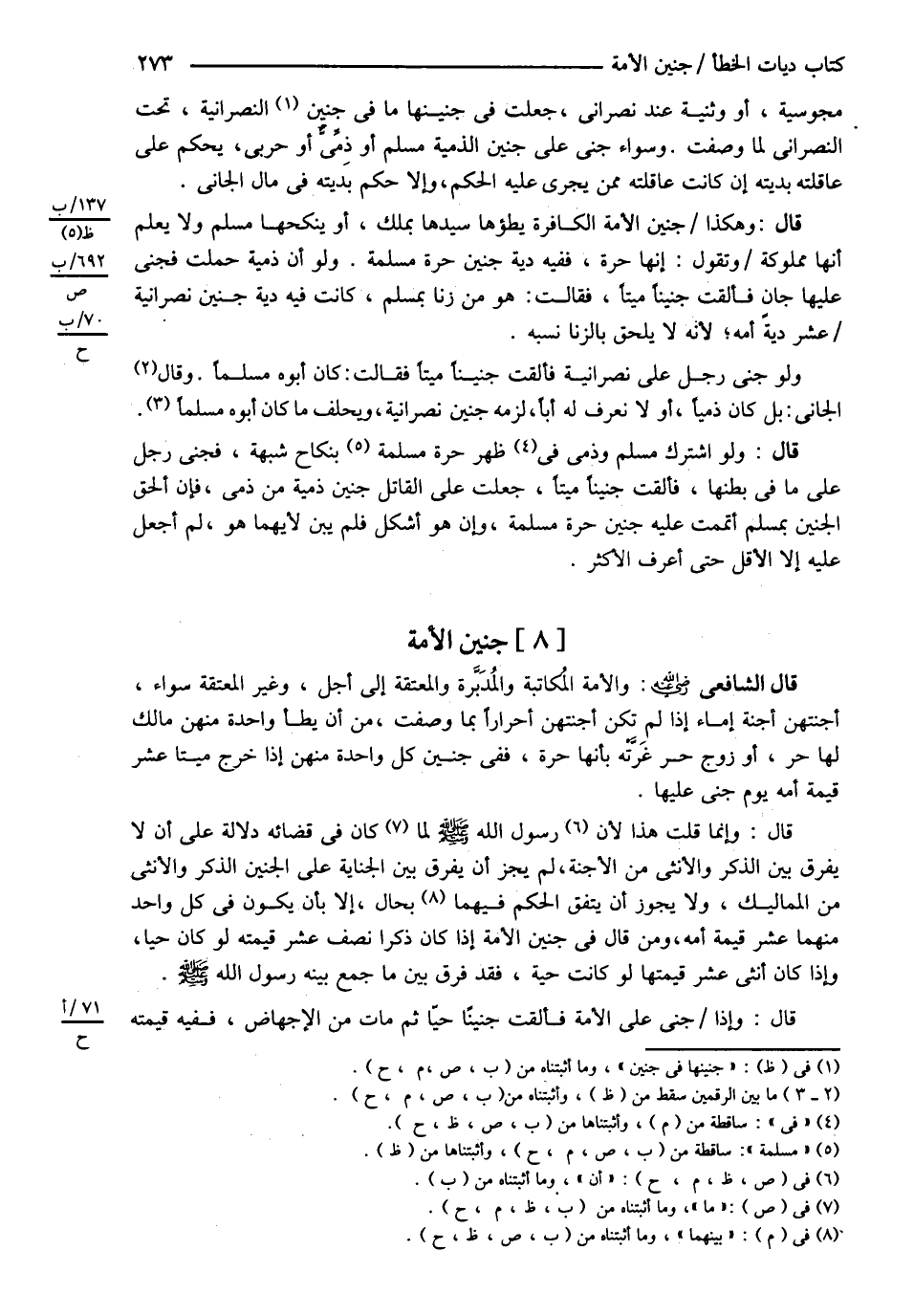 مَجُوسِيَّةٌ أَوْ وَثَنِيَّةٌ عِنْدَ نَصْرَانِيٍّ جَعَلْتُ فِي جَنِينِهَا مَا فِي جَنِينِ النَّصْرَانِيَّةِ تَحْتَ النَّصْرَانِيِّ ; لِمَا وَصَفْتُ وَسَوَاءٌ جَنَى عَلَى جَنِينِ الذِّمِّيَّةِ مُسْلِمٌ أَوْ ذِمِّيٌّ أَوْ حَرْبِيٌّ يُحْكَمُ عَلَى عَاقِلَتِهِ بِدِيَتِهِ إنْ كَانَتْ عَاقِلَتُهُ مِمَّنْ يَجْرِي عَلَيْهِ الْحُكْمُ وَإِلَّا حُكِمَ بِدِيَتِهِ فِي مَالِ الْجَانِي ( قَالَ ) وَهَكَذَا جَنِينُ الْأَمَةِ الْكَافِرَةِ يَطَؤُهَا سَيِّدُهَا بِمِلْكٍ أَوْ يَنْكِحُهَا مُسْلِمٌ وَلاَ يَعْلَمُ أَنَّهَا مَمْلُوكَةٌ وَتَقُولُ إنَّهَا حُرَّةٌ فَفِيهِ دِيَةُ جَنِينِ حُرَّةٍ مُسْلِمَةٍ .