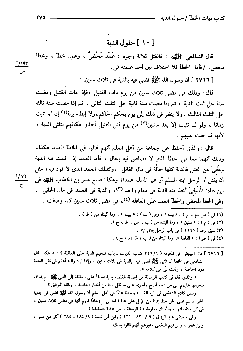 قَالَ الشَّافِعِيُّ : رحمه الله تعالى : فَالْقَتْلُ ثَلاَثَةُ وُجُوهٍ : عَمْدٌ مَحْضٌ , وَعَمْدٌ خَطَأٌ , وَخَطَأٌ مَحْضٌ , فَأَمَّا الْخَطَأُ فَلاَ اخْتِلاَفَ بَيْنَ أَحَدٍ عَلِمْتُهُ فِي أَنَّ رَسُولَ اللَّهِ - صلى الله عليه وسلم - قَضَى فِيهِ بِالدِّيَةِ فِي ثَلاَثِ سِنِينَ ( قَالَ ) وَذَلِكَ فِي مُضِيِّ ثَلاَثِ سِنِينَ مِنْ يَوْمِ مَاتَ الْقَتِيلُ فَإِذَا مَاتَ الْقَتِيلُ وَمَضَتْ سَنَةٌ حَلَّ ثُلُثُ الدِّيَةِ ثُمَّ إذَا مَضَتْ سَنَةٌ ثَانِيَةٌ حَلَّ الثُّلُثُ الثَّانِي ثُمَّ إذَا مَضَتْ سَنَةٌ ثَالِثَةٌ حَلَّ الثُّلُثُ الثَّالِثُ وَلاَ يُنْظَرُ فِي ذَلِكَ إلَى يَوْمِ يَحْكُمُ الْحَاكِمُ وَلاَ إبْطَاءٍ بِبَيِّنَةٍ إنْ لَمْ تُثْبِتْ زَمَانًا وَلَوْ لَمْ يَثْبُتْ إلَّا بَعْدَ سَنَتَيْنِ مِنْ يَوْمِ الْقَتِيلِ أَخَذُوا مَكَانَهُمْ بِثُلُثَيْ الدِّيَةِ ; لِأَنَّهَا قَدْ حَلَّتْ عَلَيْهِمْ ( قَالَ ) وَاَلَّذِي أَحْفَظُ عَنْ جَمَاعَةٍ مِنْ أَهْلِ الْعِلْمِ أَنَّهُمْ قَالُوا فِي الْخَطَأِ الْعَمْدِ هَكَذَا وَذَلِكَ أَنَّهُمَا مَعًا مِنْ الْخَطَأِ الَّذِي لاَ قِصَاصَ فِيهِ بِحَالٍ فَأَمَّا الْعَمْدُ إذَا قُبِلَتْ فِيهِ الدِّيَةُ وَعُفِيَ عَنْ الْقَتْلِ فَالدِّيَةُ كُلُّهَا حَالَّةٌ فِي مَالِ الْقَاتِلِ , وَكَذَلِكَ الْعَمْدُ الَّذِي لاَ قَوَدَ فِيهِ , مِثْلُ أَنْ يَقْتُلَ الرَّجُلُ ابْنَهُ الْمُسْلِمَ أَوْ غَيْرَ الْمُسْلِمِ عَمْدًا وَهَكَذَا صَنَعَ عُمَرُ بْنُ الْخَطَّابِ رضي الله تعالى عنه فِي ابْنِ قَتَادَةَ الْمُدْلِجِيِّ أَخَذَ مِنْهُ الدِّيَةَ فِي مَقَامٍ وَاحِدٍ وَالدِّيَةُ فِي الْعَمْدِ فِي مَالِ الْجَانِي وَفِي الْخَطَأِ الْمَحْضِ وَالْخَطَأِ الْعَمْدِ عَلَى الْعَاقِلَةِ فِي مُضِيِّ ثَلاَثِ سِنِينَ كَمَا وَصَفْتُ@