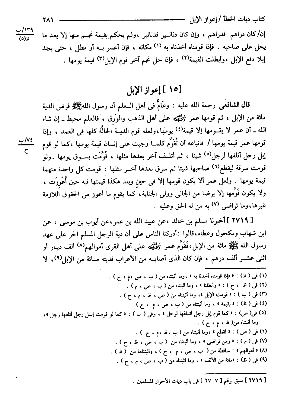 قَالَ الشَّافِعِيُّ : رحمه الله : وَعَامٌّ فِي أَهْلِ الْعِلْمِ : ? أَنَّ رَسُولَ اللَّهِ - صلى الله عليه وسلم - فَرَضَ الدِّيَةَ مِائَةً مِنْ الْإِبِلِ ? ثُمَّ قَوَّمَهَا عُمَرُ رضي الله عنه عَلَى أَهْلِ الذَّهَبِ وَالْوَرِقِ فَالْعِلْمُ مُحِيطٌ إنْ شَاءَ اللَّهُ تَعَالَى أَنَّ عُمَرَ لاَ يُقَوِّمُهَا إلَّا قِيمَةَ يَوْمِهَا وَلَعَلَّهُ قَوَّمَ الدِّيَةَ الْحَالَّةَ كُلَّهَا فِي الْعَمْدِ , وَإِذَا قَوَّمَهَا عُمَرُ قِيمَةَ يَوْمِهَا فَاتِّبَاعُهُ أَنْ تُقَوَّمَ كُلَّمَا وَجَبَتْ عَلَى إنْسَانٍ قِيمَةَ يَوْمِهَا كَمَا لَوْ قُوِّمَتْ إبِلُ رَجُلٍ أَتْلَفَهَا رَجُلٌ شَيْئًا ثُمَّ أَتْلَفَ آخَرُ بَعْدَهَا مِثْلَهَا قُوِّمَتْ بِسُوقِ يَوْمِهَا وَلَوْ قُوِّمَتْ سَرِقَةً لِيَقْطَعَ صَاحِبُهَا شَيْئًا ثُمَّ سَرَقَ بَعْدَهَا آخَرُ مِثْلَهَا قُوِّمَتْ كُلُّ وَاحِدَةٍ مِنْهُمَا قِيمَةَ يَوْمِهَا وَلَعَلَّ عُمَرَ أَنْ لاَ يَكُونَ قَوَّمَهَا إلَّا فِي حِينٍ وَبَلَدٍ هَكَذَا قِيمَتُهَا فِيهِ حِينَ أَعْوَزَتْ وَلاَ يَكُونُ قَوَّمَهَا إلَّا بِرِضًا مِنْ الْجَانِي وَوَلِيِّ الْجِنَايَةِ كَمَا يُقَوِّمُ مَا أَعْوَزَ مِنْ الْحُقُوقِ اللَّازِمَةِ غَيْرَهَا وَمَا تَرَاضَى بِهِ مَنْ لَهُ الْحَقُّ وَعَلَيْهِ . أَخْبَرَنَا مُسْلِمُ بْنُ خَالِدٍ عَنْ عُبَيْدِ اللَّهِ بْنِ عُمَرَ عَنْ أَيُّوبَ بْنِ مُوسَى عَنْ ابْنِ شِهَابٍ وَمَكْحُولٍ وَعَطَاءٍ . قَالُوا : أَدْرَكْنَا النَّاسَ عَلَى أَنَّ دِيَةَ الرَّجُلِ الْمُسْلِمِ الْحُرِّ عَلَى عَهْدِ رَسُولِ اللَّهِ - صلى الله عليه وسلم - مِائَةٌ مِنْ الْإِبِلِ فَقَوَّمَ عُمَرُ رضي الله عنه عَلَى أَهْلِ الْقُرَى أَلْفَ دِينَارٍ أَوْ اثْنَيْ عَشَرَ أَلْفَ دِرْهَمٍ فَإِنْ كَانَ الَّذِي أَصَابَهُ مِنْ الْأَعْرَابِ فَدِيَتُهُ مِائَةٌ مِنْ الْإِبِلِ لاَ @