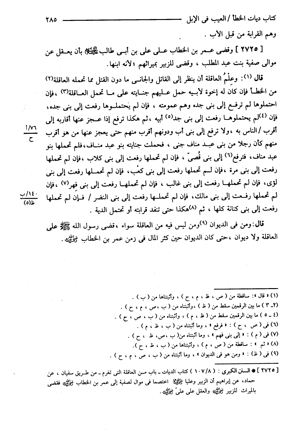 وَهُمْ الْقَرَابَةُ مِنْ قِبَلِ الْأَبِ وَقَضَى عُمَرُ بْنُ الْخَطَّابِ عَلَى عَلِيِّ بْنِ أَبِي طَالِبٍ رضي الله عنهما بِأَنْ يَعْقِلَ عَنْ مَوَالِي صَفِيَّةَ بِنْتِ عَبْدِ الْمُطَّلِبِ وَقَضَى لِلزُّبَيْرِ بِمِيرَاثِهِمْ ; لِأَنَّهُ ابْنُهَا . ( قَالَ ) وَعِلْمُ الْعَاقِلَةِ أَنْ يُنْظَرَ إلَى الْقَاتِلِ وَالْجَانِي مَا دُونَ الْقَتْلِ مِمَّا تَحْمِلُهُ الْعَاقِلَةُ مِنْ الْخَطَأِ فَإِنْ كَانَ لَهُ إخْوَةٌ لِأَبِيهِ حَمَلَ عَلَيْهِمْ جِنَايَتَهُمْ عَلَى مَا تَحْمِلُ الْعَاقِلَةُ فَإِنْ احْتَمَلُوهَا لَمْ تُرْفَعْ إلَى بَنِي جَدِّهِ وَهُمْ عُمُومَتُهُ فَإِنْ لَمْ يَحْتَمِلُوهَا رُفِعَتْ إلَى بَنِي جَدِّهِ فَإِنْ لَمْ يَحْتَمِلُوهَا رُفِعَتْ إلَى بَنِي جَدِّ أَبِيهِ ثُمَّ هَكَذَا تُرْفَعُ إذَا عَجَزَ عَنْهَا أَقَارِبُهُ إلَى أَقْرَبِ النَّاسِ بِهِ وَلاَ تُرْفَعُ إلَى بَنِي أَبٍ وَدُونَهُمْ أَقْرَبُ مِنْهُمْ حَتَّى يَعْجِزَ عَنْهَا مَنْ هُوَ أَقْرَبُ مِنْهُمْ كَأَنَّ رَجُلاً مِنْ بَنِي عَبْدِ مَنَافٍ جَنَى فَحَمَلَتْ جِنَايَتَهُ بَنُو عَبْدِ مَنَافٍ فَلَمْ تَحْمِلْهَا بَنُو عَبْدِ مَنَافٍ فَتُرْفَعُ إلَى بَنِي قُصَيٍّ فَإِنْ لَمْ تَحْمِلْهَا رُفِعَتْ إلَى بَنِي كِلاَبٍ فَإِنْ لَمْ تَحْمِلْهَا رُفِعَتْ إلَى بَنِي مُرَّةَ فَإِنْ لَمْ تَحْمِلْهَا رُفِعَتْ إلَى بَنِي كَعْبٍ فَإِنْ لَمْ تَحْمِلْهَا رُفِعَتْ إلَى بَنِي لُؤَيٍّ فَإِنْ لَمْ تَحْمِلْهَا رُفِعَتْ إلَى بَنِي غَالِبٍ فَإِنْ لَمْ تَحْمِلْهَا رُفِعَتْ إلَى بَنِي مَالِكٍ فَإِنْ لَمْ تَحْمِلْهَا رُفِعَتْ إلَى بَنِي النَّضْرِ فَإِنْ لَمْ تَحْمِلْهَا رُفِعَتْ إلَى بَنِي كِنَانَةَ كُلِّهَا ثُمَّ هَكَذَا حَتَّى تَنْفَدَ قَرَابَتُهُ أَوْ تُحْتَمَلُ الدِّيَةُ ( قَالَ ) : وَمَنْ فِي الدِّيوَانِ , وَمَنْ لَيْسَ فِيهِ مِنْ الْعَاقِلَةِ سَوَاءٌ قَضَى رَسُولُ اللَّهِ - صلى الله عليه وسلم - عَلَى الْعَاقِلَةِ وَلاَ دِيوَانَ حَتَّى كَانَ الدِّيوَانُ حِينَ كَثُرَ الْمَالُ فِي زَمَنِ عُمَرَ بْنِ الْخَطَّابِ رضي الله عنه . .@