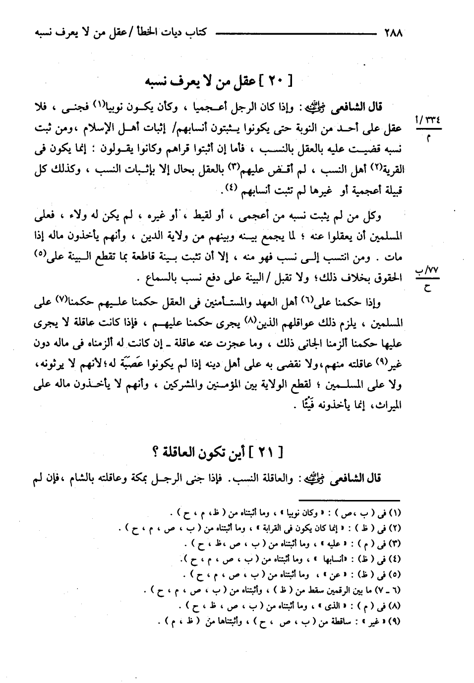 قَالَ الشَّافِعِيُّ : رحمه الله تعالى : وَإِذَا كَانَ الرَّجُلُ أَعْجَمِيًّا وَكَانَ نُوبِيًا فَجَنَى فَلاَ عَقْلَ عَلَى أَحَدٍ مِنْ النُّوبَةِ حَتَّى يَكُونُوا يُثْبِتُونَ أَنْسَابَهُمْ إثْبَاتَ أَهْلِ الْإِسْلاَمِ , وَمَنْ ثَبَتَ نَسَبُهُ قَضَيْتُ عَلَيْهِ بِالْعَقْلِ بِالنَّسَبِ , فَأَمَّا إنْ أَثْبَتُوا قُرَاهُمْ وَكَانُوا يَقُولُونَ إنَّمَا يَكُونُ فِي الْقَرْيَةِ أَهْلُ النَّسَبِ لَمْ أَقْضِ عَلَيْهِمْ بِالْعَقْلِ بِحَالٍ إلَّا بِإِثْبَاتِ النَّسَبِ , وَكَذَلِكَ كُلُّ قَبِيلَةٍ أَعْجَمِيَّةٍ أَوْ غَيْرِهَا لَمْ تَثْبُتْ أَنْسَابُهُمْ وَكُلُّ مَنْ لَمْ يَثْبُتْ نَسَبُهُ مِنْ أَعْجَمِيٍّ أَوْ لَقِيطٍ أَوْ غَيْرِهِ لَمْ يَكُنْ لَهُ وَلاَءٌ فَعَلَى الْمُسْلِمِينَ أَنْ يَعْقِلُوا عَنْهُ لِمَا يَجْمَعُ بَيْنَهُ وَبَيْنَهُمْ مِنْ وِلاَيَةِ الدِّينِ وَإِنَّهُمْ يَأْخُذُونَ مَالَهُ إذَا مَاتَ , وَمَنْ انْتَسَبَ إلَى نَسَبٍ فَهُوَ مِنْهُ إلَّا أَنْ تَثْبُتَ بَيِّنَةٌ قَاطِعَةٌ بِمَا تَقْطَعُ الْبَيِّنَةَ عَلَى الْحُقُوقِ بِخِلاَفِ ذَلِكَ وَلاَ تُقْبَلُ الْبَيِّنَةُ عَلَى دَفْعِ نَسَبٍ بِالسَّمَاعِ وَإِذَا حَكَمْنَا عَلَى أَهْلِ الْعَهْدِ وَالْمُسْتَأْمَنِينَ فِي الْعَقْلِ حَكَمْنَا عَلَيْهِمْ حُكْمَنَا عَلَى الْمُسْلِمِينَ يَلْزَمُ ذَلِكَ عَوَاقِلُهُمْ الَّذِينَ يَجْرِي حُكْمُنَا عَلَيْهِمْ فَإِذَا كَانَتْ عَاقِلَةً لاَ يَجْرِي حُكْمُنَا عَلَيْهَا أَلْزَمْنَا الْجَانِيَ ذَلِكَ وَمَا عَجَزَتْ عَنْهُ عَاقِلَةٌ إنْ كَانَتْ لَهُ أَلْزَمْنَاهُ فِي مَالِهِ دُونَ غَيْرِ عَاقِلَتِهِ مِنْهُمْ وَلاَ نَقْضِي بِهِ عَلَى أَهْلِ دِينِهِ إذَا لَمْ يَكُونُوا عَصَبَةً لَهُ ; لِأَنَّهُمْ لاَ يَرِثُونَهُ وَلاَ عَلَى الْمُسْلِمِينَ لِقَطْعِ الْوِلاَيَةِ بَيْنَ الْمُؤْمِنِينَ وَالْمُشْرِكِينَ وَأَنَّهُمْ لاَ يَأْخُذُونَ مَالَهُ عَلَى الْمِيرَاثِ إنَّمَا يَأْخُذُونَهُ فَيْئًا . .