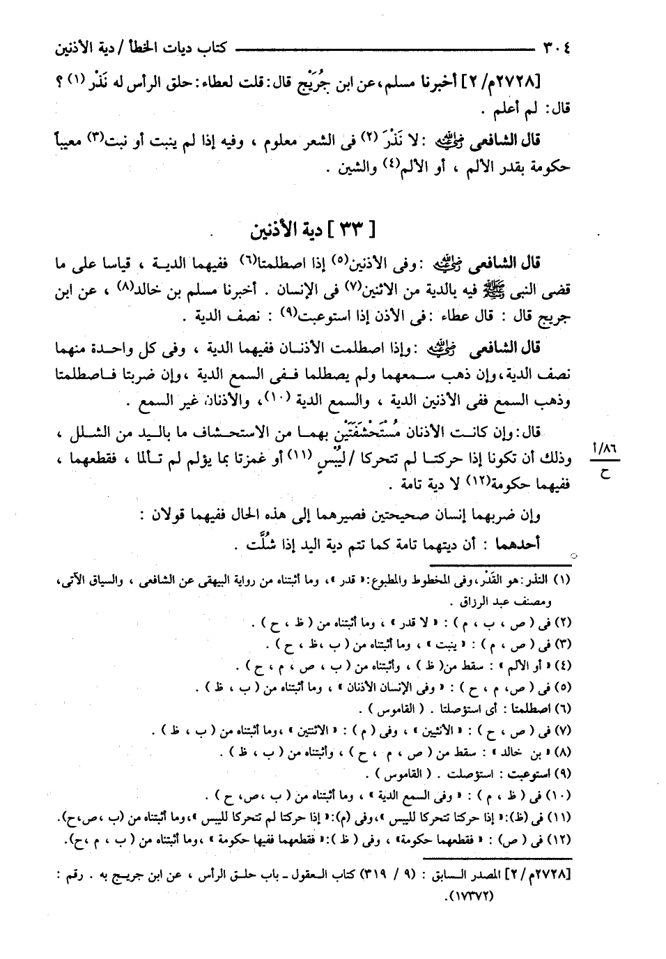 قَالَ الشَّافِعِيُّ : فِي الْأُذُنَيْنِ إذَا اصْطَلَمَتَا فَفِيهَا الدِّيَةُ قِيَاسًا عَلَى مَا قَضَى النَّبِيُّ - صلى الله عليه وسلم - فِيهِ بِالدِّيَةِ مِنْ الِاثْنَيْنِ فِي الْإِنْسَانِ أَخْبَرَنَا مُسْلِمُ بْنُ خَالِدٍ عَنْ ابْنِ جُرَيْجٍ قَالَ : قَالَ عَطَاءٌ فِي الْأُذُنِ إذَا اُسْتُوْعِبَتْ نِصْفُ الدِّيَةِ