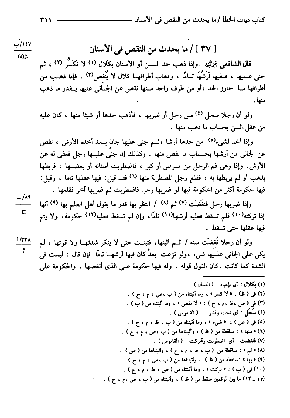 قَالَ الشَّافِعِيُّ : رحمه الله تعالى وَإِذَا ذَهَبَ حَدُّ السِّنِّ أَوْ الْأَسْنَانِ بكلال لاَ تُكْسَرُ ثُمَّ جَنَى عَلَيْهَا فَفِيهَا أَرْشُهَا تَامًّا , وَذَهَابُ أَطْرَافِهَا كَلَّالٍ لاَ يَنْقُصُ فَإِذَا ذَهَبَ مِنْ أَطْرَافِهَا مَا جَاوَزَ الْحَدَّ أَوْ مِنْ طَرَفٍ وَاحِدٍ مِنْهَا نَقَصَ عَنْ الْجَانِي عَلَيْهَا بِقَدْرِ مَا ذَهَبَ مِنْهَا وَلَوْ أَنَّ رَجُلاً سَحَلَ سِنَّ رَجُلٍ أَوْ ضَرَبَهَا فَأَذْهَبَ حَدَّهَا أَوْ شَيْئًا مِنْهَا كَانَ عَلَيْهِ مِنْ عَقْلِ السِّنِّ بِحِسَابِ مَا ذَهَبَ مِنْهَا وَإِذَا أَخَذَ لِشَيْءٍ مِنْ حَدِّهَا أَرْشًا ثُمَّ جَنَى عَلَيْهَا جَانٍ بَعْدَ أَخْذِهِ الْأَرْشَ نَقَصَ عَنْ الْجَانِي مِنْ أَرْشِهَا بِحِسَابِ مَا نَقَصَ مِنْهَا , وَكَذَلِكَ إنْ جَنَى عَلَيْهَا رَجُلٌ فَعَفَا لَهُ عَنْ الْأَرْشِ وَإِذَا وَهِيَ فَمُ الرَّجُلِ مِنْ مَرَضٍ أَوْ كِبَرٍ فَاضْطَرَبَتْ أَسْنَانُهُ أَوْ بَعْضُهَا فَرَبَطَهَا بِذَهَبٍ أَوْ لَمْ يَرْبِطْهَا بِهِ فَقَلَعَ رَجُلٌ الْمُضْطَرِبَةَ مِنْهَا فَقَدْ قِيلَ فِيهَا عَقْلُهَا تَامًّا وَقِيلَ فِيهَا حُكُومَةٌ أَكْثَرُ مِنْ الْحُكُومَةِ فِيهَا لَوْ ضَرَبَهَا رَجُلٌ فَاضْطَرَبَتْ ثُمَّ ضَرَبَهَا آخَرُ فَقَلَعَهَا وَإِذَا ضَرَبَهَا رَجُلٌ فَنَغَضَتْ انْتَظَرَ بِهَا قَدْرَ مَا يَقُولُ أَهْلُ الْعِلْمِ بِهَا أَنَّهَا إذَا تُرِكَتْ فَلَمْ تَسْقُطْ لَمْ تَسْقُطْ إلَّا مِنْ حَادِثٍ بَعْدَهُ فَإِنْ سَقَطَتْ فَعَلَيْهِ أَرْشُهَا تَامًّا وَإِنْ لَمْ تَسْقُطْ فَعَلَيْهِ حُكُومَةٌ وَلاَ يَتِمُّ فِيهَا عَقْلُهَا حَتَّى تَسْقُطَ وَلَوْ أَنَّ رَجُلاً نَغَضَتْ سِنُّهُ ثُمَّ أَثْبَتَهَا فَثَبَتَتْ حَتَّى لاَ يُنْكِرَ شِدَّتَهَا وَلاَ قُوَّتَهَا لَمْ يَكُنْ عَلَى الْجَانِي عَلَيْهَا شَيْءٌ وَلَوْ نُزِعَتْ بَعْدُ كَانَ فِيهَا أَرْشُهَا تَامًّا فَإِنْ قَالَ لَيْسَتْ فِي الشِّدَّةِ كَمَا كَانَتْ كَانَ الْقَوْلُ قَوْلَهُ وَلَهُ فِيهَا حُكُومَةٌ عَلَى الَّذِي أَنْغَضَهَا وَحُكُومَةٌ عَلَى@