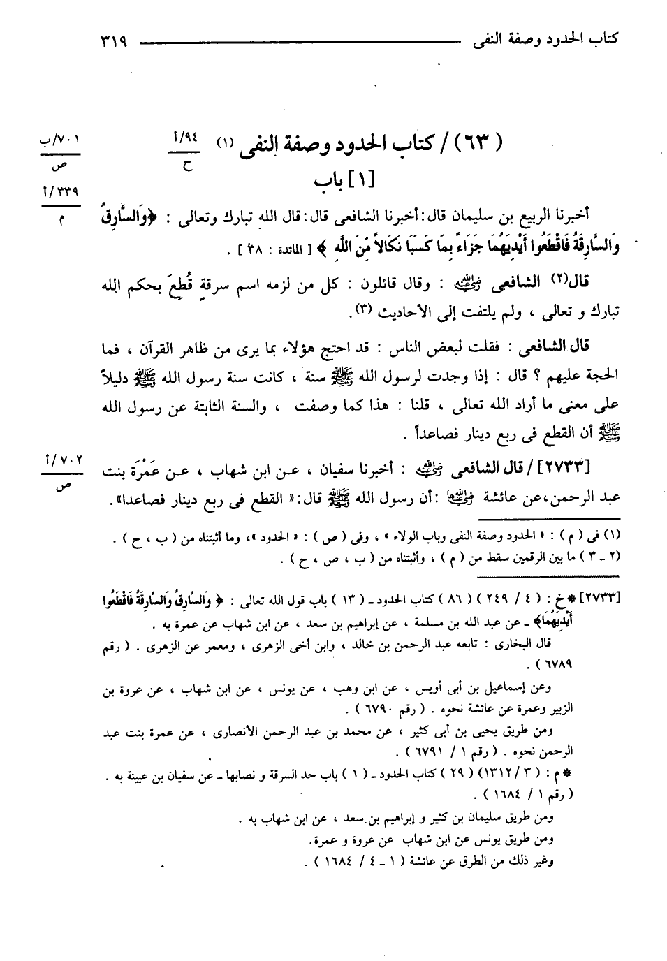 (أَخْبَرَنَا الرَّبِيعُ) قَالَ (أَخْبَرَنَا الشَّافِعِيُّ) قَالَ: قَالَ اللَّهُ تَبَارَكَ وَتَعَالَى: ? وَالسَّارِقُ وَالسَّارِقَةُ فَاقْطَعُوا أَيْدِيَهُمَا جَزَاءً بِمَا كَسَبَا نَكَالاً مِنْ اللَّهِ ?