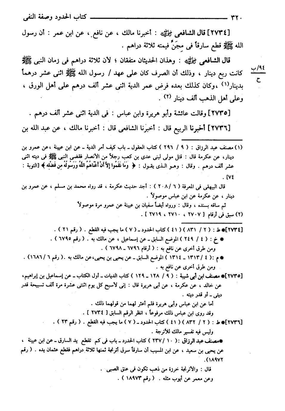 قَالَ الشَّافِعِيُّ : أَخْبَرَنَا مَالِكٌ عَنْ نَافِعٍ عَنْ ابْنِ عُمَرَ : ? أَنَّ رَسُولَ اللَّهِ - صلى الله عليه وسلم - قَطَعَ سَارِقًا فِي مِجَنٍّ قِيمَتُهُ ثَلاَثَةُ دَرَاهِمَ ?