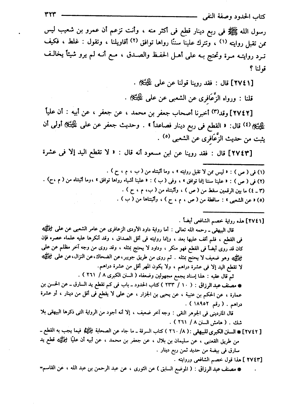 رَسُولُ اللَّهِ - صلى الله عليه وسلم - فِي رُبُعِ دِينَارٍ قَطَعَ فِي أَكْثَرَ عَنْهُ وَأَنْتَ تَزْعُمُ أَنَّ عَمْرَو بْنَ شُعَيْبٍ لَيْسَ مِمَّنْ تُقْبَلُ رِوَايَتُهُ وَتَتْرُكُ عَلَيْنَا أَشْيَاءَ رَوَاهَا تُوَافِقُ أَقَاوِيلَنَا وَتَقُولُ غَلَطٌ فَكَيْفَ تَرُدُّ رِوَايَتَهُ مَرَّةً وَتَحْتَجُّ بِهِ عَلَى أَهْلِ الْحِفْظِ وَالصِّدْقِ مَعَ أَنَّهُ لَمْ يَرْوِ شَيْئًا يُخَالِفُ قَوْلَنَا ؟ قَالَ : فَقَدْ رَوَيْنَا قَوْلَنَا عَنْ عَلِيٍّ رضي الله عنه قُلْنَا : وَرَوَاهُ الزَّعَافِرِيُّ عَنْ الشَّعْبِيِّ عَنْ عَلِيٍّ رضي الله عنه وَقَدْ أَخْبَرَنَا أَصْحَابُ جَعْفَرِ بْنِ مُحَمَّدٍ عَنْ جَعْفَرٍ عَنْ أَبِيهِ أَنَّ عَلِيًّا رضي الله عنه قَالَ : " الْقَطْعُ فِي رُبُعِ دِينَارٍ فَصَاعِدًا " وَحَدِيثُ جَعْفَرٍ عَنْ عَلِيٍّ رضي الله عنه أَوْلَى أَنْ يَثْبُتَ مِنْ حَدِيثِ الزَّعَافِرِيِّ عَنْ الشَّعْبِيِّ قَالَ : فَقَدْ رَوَيْنَا عَنْ ابْنِ مَسْعُودٍ أَنَّهُ قَالَ " لاَ تُقْطَعُ الْيَدُ إلَّا فِي عَشَرَةِ @