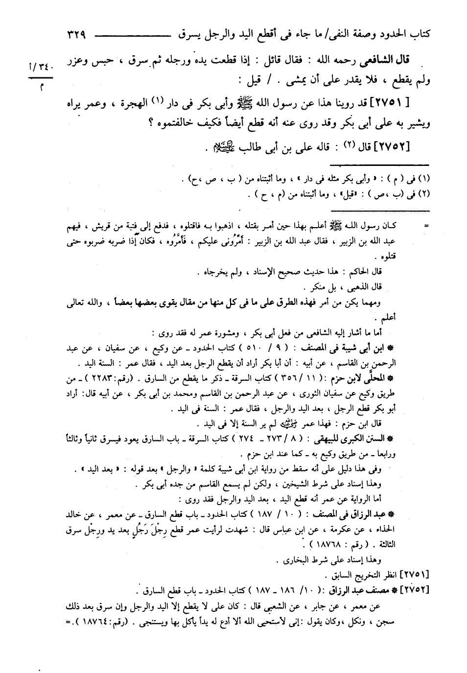 قَالَ الشَّافِعِيُّ : فَقَالَ قَائِلٌ : إذَا قُطِعَتْ يَدُهُ وَرِجْلُهُ ثُمَّ سَرَقَ حُبِسَ وَعُزِّرَ وَلَمْ يُقْطَعْ فَلاَ يَقْدِرُ عَلَى أَنْ يَمْشِيَ قِيلَ قَدْ رَوَيْنَا هَذَا عَنْ رَسُولِ اللَّهِ - صلى الله عليه وسلم - وَأَبِي بَكْرٍ فِي دَارِ الْهِجْرَةِ وَعُمَرُ يَرَاهُ وَيُشِيرُ بِهِ عَلَى أَبِي بَكْرٍ وَقَدْ رُوِيَ عَنْهُ أَنَّهُ قَطَعَ أَيْضًا فَكَيْفَ خَالَفْتُمُوهُ ؟ قِيلَ قَالَهُ عَلِيُّ بْنُ أَبِي طَالِبٍ رضي الله عنه@