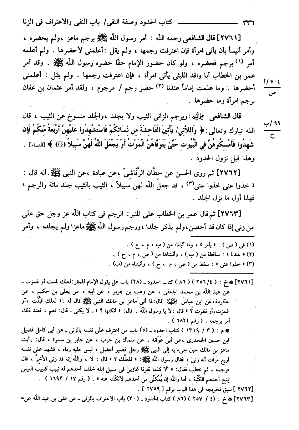 قَالَ الشَّافِعِيُّ: وَيُرْجَمُ الزَّانِي الثَّيِّبُ وَلاَ يُجْلَدُ وَالْجَلْدُ مَنْسُوخٌ عَنْ الثَّيِّبِ قَالَ اللَّهُ تَبَارَكَ وَتَعَالَى: ? وَاَللَّاتِي يَأْتِينَ الْفَاحِشَةَ مِنْ نِسَائِكُمْ ? إلَى: ? سَبِيلاً ? وَهَذَا قَبْلَ نُزُولِ الْحُدُودِ. ثُمَّ رَوَى الْحَسَنُ عَنْ حِطَّانَ الرَّقَاشِيِّ عَنْ عُبَادَةَ عَنْ النَّبِيِّ - صلى الله عليه وسلم -. أَنَّهُ قَالَ: ? خُذُوا عَنِّي خُذُوا عَنِّي قَدْ جَعَلَ اللَّهُ لَهُنَّ سَبِيلاً: الثَّيِّبُ بِالثَّيِّبِ جَلْدُ مِائَةٍ وَالرَّجْمُ ? فَهَذَا أَوَّلُ مَا نَزَلَ الْجَلْدُ ثُمَّ قَالَ عُمَرُ بْنُ الْخَطَّابِ رضي الله عنه عَلَى الْمِنْبَرِ الرَّجْمُ فِي كِتَابِ اللَّهِ عَزَّ وَجَلَّ حَقٌّ عَلَى مَنْ زَنَى إذَا كَانَ قَدْ أَحْصَنَ وَلَمْ يَذْكُرْ جَلْدًا وَرَجَمَ رَسُولُ اللَّهِ - صلى الله عليه وسلم - مَاعِزًا وَلَمْ يَجْلِدْهُ وَأَمَرَ @