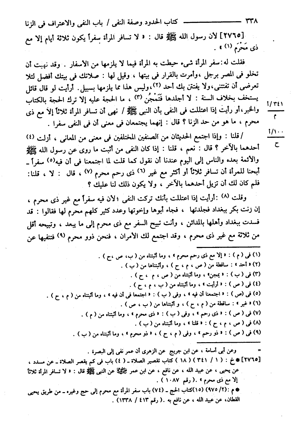 لِأَنَّ رَسُولَ اللَّهِ - صلى الله عليه وسلم - قَالَ : ? لاَ تُسَافِرْ الْمَرْأَةُ سَفَرًا يَكُونُ ثَلاَثَةَ أَيَّامٍ إلَّا مَعَ ذِي مَحْرَمٍ ? فَقُلْت لَهُ سَفَرُ الْمَرْأَةِ شَيْءٌ حِيطَتْ بِهِ الْمَرْأَةُ فِيمَا لاَ يَلْزَمُهَا مِنْ الْأَسْفَارِ . وَقَدْ نُهِيَتْ أَنْ تَخْلُوَ فِي الْمِصْرِ بِرَجُلٍ وَأُمِرَتْ بِالْقَرَارِ فِي بَيْتِهَا . وَقِيلَ لَهَا صَلاَتُكَ فِي بَيْتِكِ أَفْضَلُ لِئَلَّا تَعْرِضِي أَنْ تُفْتَتَنِي وَلاَ يَفْتَتِنُ بِكَ أَحَدٌ وَلَيْسَ هَذَا مِمَّا يَلْزَمُهَا بِسَبِيلٍ . أَرَأَيْت لَوْ قَالَ قَائِلٌ يَسْتَخِفُّ بِخِلاَفِ السُّنَّةِ لاَ أَجْلِدُهَا يَمْجُنُ مَا الْحُجَّةُ عَلَيْهِ إلَّا تَرْكُ الْحُجَّةِ بِالْكِتَابِ وَالْخَبَرِ . أَوْ رَأَيْت إذَا اعْتَلَلْت فِي النَّفْيِ بِأَنَّ : ? النَّبِيَّ - صلى الله عليه وسلم - نَهَى أَنْ تُسَافِرَ الْمَرْأَةُ ثَلاَثًا إلَّا مَعَ ذِي مَحْرَمٍ ? مَا هُوَ مِنْ حَدِّ الزِّنَا قَالَ : إنَّهُمَا يَجْتَمِعَانِ فِي مَعْنَى أَنَّ فِي النَّفْيِ سَفَرًا قُلْنَا : وَإِذَا اجْتَمَعَ الْحَدِيثَانِ مِنْ الصِّنْفَيْنِ الْمُخْتَلِفَيْنِ فِي مَعْنًى مِنْ الْمَعَانِي أَزَلْت أَحَدَهُمَا بِالْآخِرِ ؟ قَالَ : نَعَمْ قُلْنَا : إذَا كَانَ النَّفْيُ مِنْ أَثْبَتِ مَا رُوِيَ عَنْ رَسُولِ اللَّهِ - صلى الله عليه وسلم - وَالْأَئِمَّةِ بَعْدَهُ وَالنَّاسِ إلَى الْيَوْمِ عِنْدَنَا أَنْ نَقُولَ كَمَا قُلْت : لَمَّا اجْتَمَعَا فِي أَنَّ فِيهِ سَفَرًا أَبَحْنَا لِلْمَرْأَةِ أَنْ تُسَافِرَ ثَلاَثًا أَوْ أَكْثَرَ مَعَ غَيْرِ ذِي مَحْرَمٍ , قَالَ : لاَ قُلْنَا فَلِمَ كَانَ لَكَ أَنْ تُزِيلَ أَحَدَهُمَا بِالْآخَرِ وَلاَ يَكُونُ ذَلِكَ لَنَا عَلَيْكَ ؟ وَقُلْت أَرَأَيْت إذَا اعْتَلَلْت بِأَنَّكَ تَرَكْت النَّفْيَ ; لِأَنَّ فِيهِ سَفَرًا مَعَ غَيْرِ ذِي مَحْرَمٍ إنْ زَنَتْ بِكْرٌ بِبَغْدَادَ فَجَلَدْتهَا فَجَاءَ أَبُوهَا وَإِخْوَتُهَا وَعَدَدٌ كَثِيرٌ كُلُّهُمْ مَحْرَمٌ لَهَا فَقَالُوا قَدْ فَسَدَتْ بِبَغْدَادَ وَأَهْلُهَا بِالْمَدَائِنِ وَأَنْتَ تُبِيحُ السَّفَرَ مَعَ ذِي مَحْرَمٍ إلَى مَا يَبْعُدُ وَتُبِيحُهُ أَقَلَّ مِنْ ثَلاَثٍ مَعَ غَيْرِ ذِي مَحْرَمٍ . وَقَدْ اجْتَمَعَ لَكَ الْأَمْرَانِ فَنَحْنُ ذَوُو مَحْرَمٍ فَتَنْفِيهَا عَنْ@