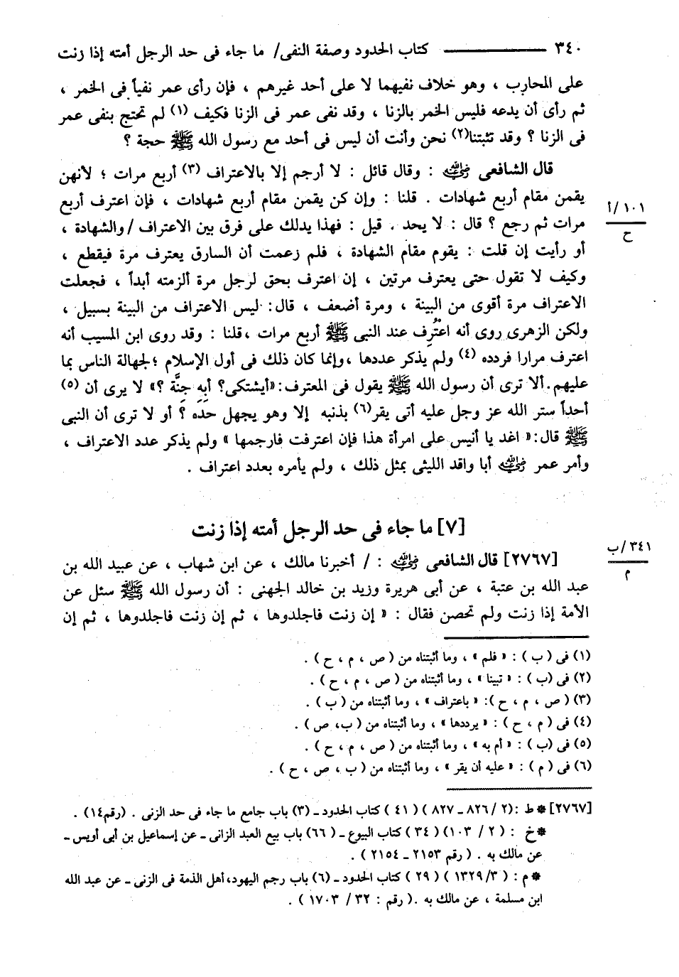 قَالَ الشَّافِعِيُّ : رحمه الله تعالى : أَخْبَرَنَا مَالِكٌ عَنْ ابْنِ شِهَابٍ عَنْ عُبَيْدِ بْنِ عَبْدِ اللَّهِ بْنِ عُتْبَةَ عَنْ أَبِي هُرَيْرَةَ وَزَيْدِ بْنِ خَالِدٍ الْجُهَنِيِّ رضي الله عنهما : ? أَنَّ رَسُولَ اللَّهِ - صلى الله عليه وسلم - سُئِلَ عَنْ الْأَمَةِ إذَا زَنَتْ وَلَمْ تُحْصَنْ فَقَالَ إنْ زَنَتْ فَاجْلِدُوهَا ثُمَّ إنْ زَنَتْ فَاجْلِدُوهَا ثُمَّ إنْ@