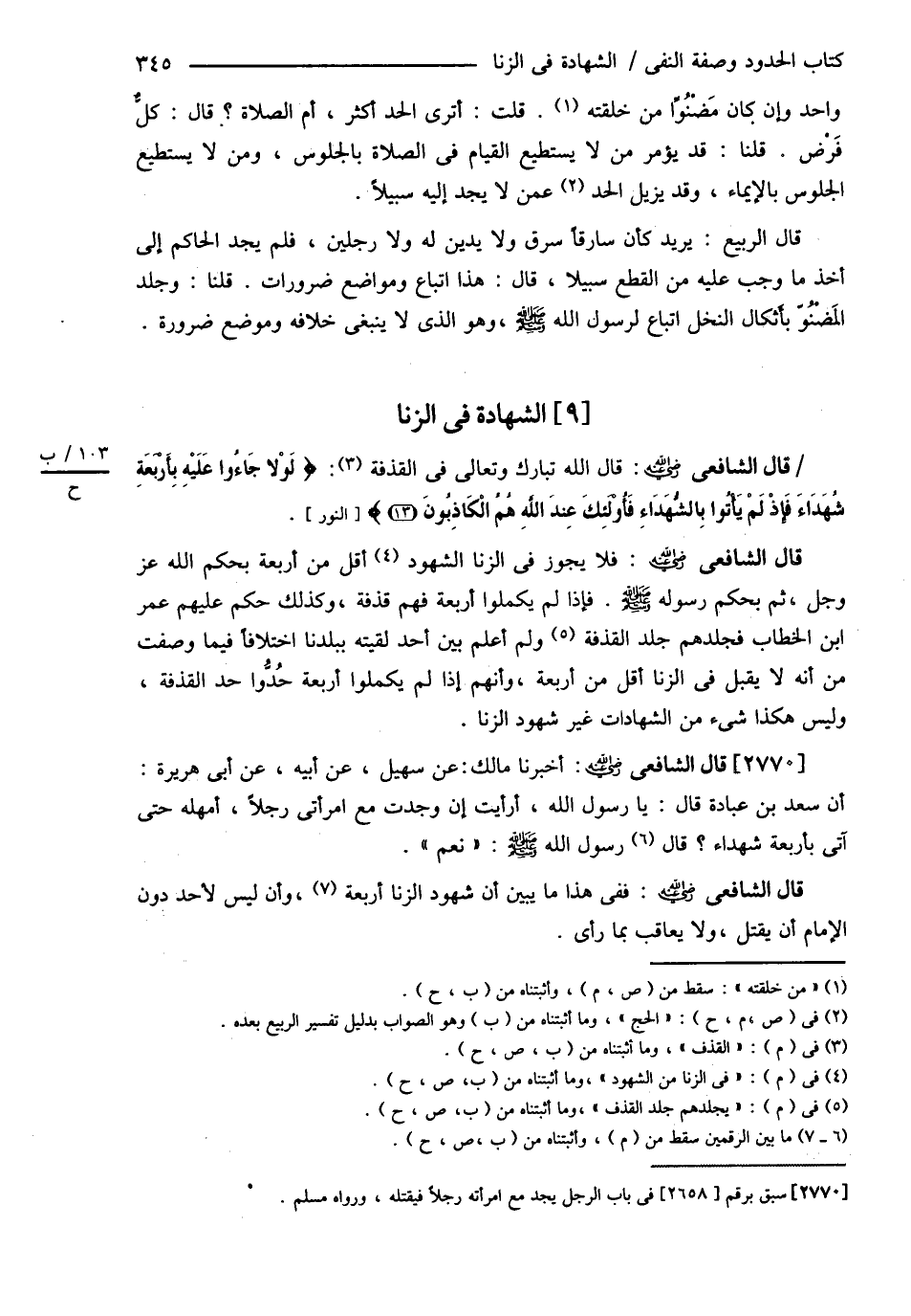 قَالَ الشَّافِعِيُّ : رحمه الله فَفِي هَذَا مَا يُبَيِّنُ أَنَّ شُهُودَ الزِّنَا أَرْبَعَةٌ وَأَنْ لَيْسَ لِأَحَدٍ دُونَ الْإِمَامِ أَنْ يَقْتُلَ وَلاَ يُعَاقِبَ بِمَا رَأَى@