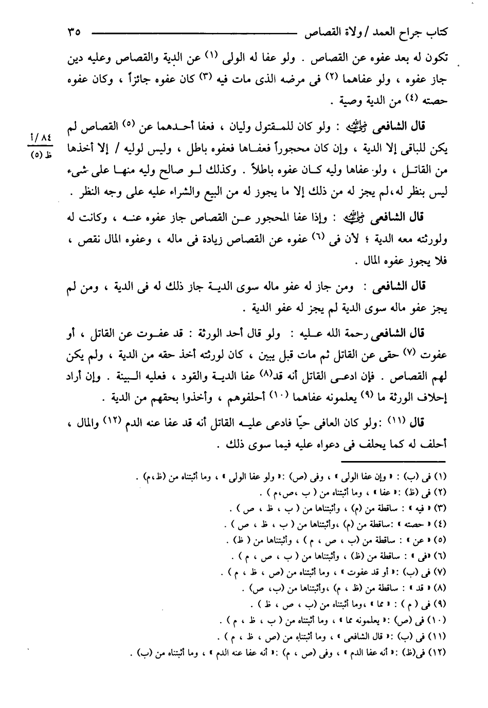 قَالَ الشَّافِعِيُّ : وَلَوْ قَالَ أَحَدُ الْوَرَثَةِ قَدْ عَفَوْت عَنْ الْقَاتِلِ أَوْ قَدْ عَفَوْت حَقِّي عَنْ الْقَاتِلِ ثُمَّ مَاتَ قَبْلَ أَنْ يُبَيِّنَ كَانَ لِوَرَثَتِهِ أَخْذُ حَقِّهِ مِنْ الدِّيَةِ وَلَمْ يَكُنْ لَهُمْ الْقِصَاصُ فَإِنْ ادَّعَى الْقَاتِلُ أَنَّهُ قَدْ عَفَا الدِّيَةَ وَالْقَوَدَ فَعَلَيْهِ الْبَيِّنَةُ وَإِنْ أَرَادَ إحْلاَفَ الْوَرَثَةِ مَا يَعْلَمُونَهُ عَفَاهُمَا أَحَلَفُوهُمْ وَأَخَذُوا بِحَقِّهِمْ مِنْ الدِّيَةِ .