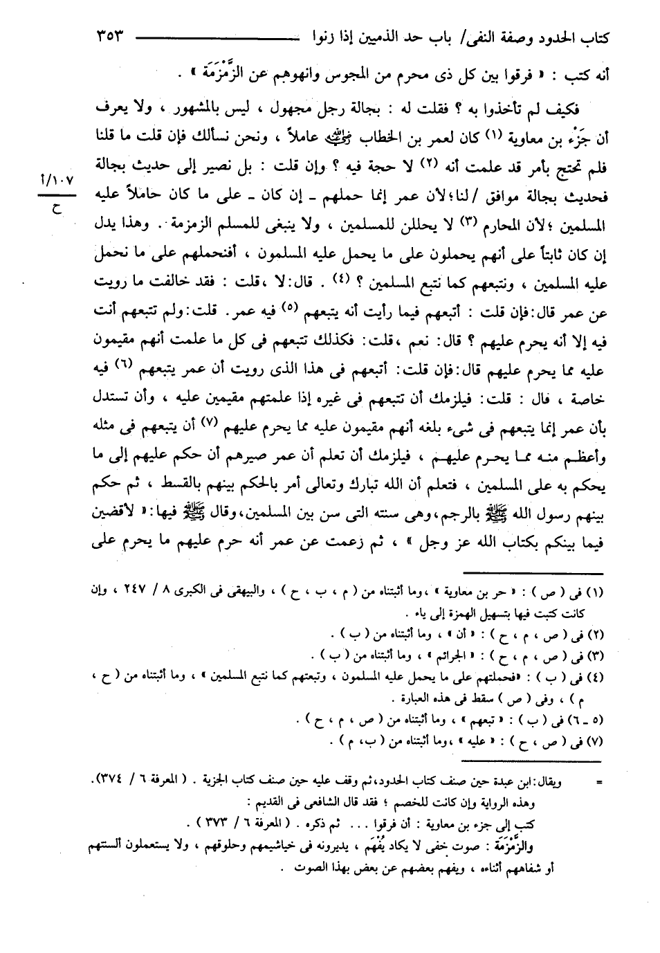 أَنَّهُ كَتَبَ " فَرِّقُوا بَيْنَ كُلِّ ذِي مَحْرَمٍ مِنْ الْمَجُوسِ وَانْهَوْهُمْ عَنْ الزَّمْزَمَةِ " فَكَيْفَ لَمْ تَأْخُذُوا بِهِ؟ فَقُلْت لَهُ بَجَالَةُ رَجُلٌ مَجْهُولٌ لَيْسَ بِالْمَشْهُورِ وَلاَ يُعْرَفُ أَنَّ جُزْءَ مُعَاوِيَةَ كَانَ لِعُمَرَ بْنِ الْخَطَّابِ رضي الله عنه عَامِلاً وَنَحْنُ نَسْأَلُكَ فَإِنْ قُلْت مَا قُلْنَا فَلِمَ تَحْتَجَّ بِأَمْرٍ قَدْ عَلِمْت أَنَّهُ لاَ حُجَّةَ فِيهِ؟ وَإِنْ قُلْت بَلْ نَصِيرُ إلَى حَدِيثِ بَجَالَةَ فَحَدِيثُ بَجَالَةَ مُوَافِقٌ لَنَا ; لِأَنَّ عُمَرَ إنَّمَا حَمَلَهُمْ إنْ كَانَ عَلَى مَا كَانَ حَامِلاً عَلَيْهِ الْمُسْلِمِينَ ; لِأَنَّ الْمَحَارِمَ لاَ يَحْلِلْنَ لِلْمُسْلِمِينَ وَلاَ يَنْبَغِي لِلْمُسْلِمِ الزَّمْزَمَةُ وَهَذَا يَدُلُّ إنْ كَانَ ثَابِتًا عَلَى أَنَّهُمْ يُحْمَلُونَ عَلَى مَا يُحْمَلُ عَلَيْهِ الْمُسْلِمُونَ فَحَمَلْتهمْ عَلَى مَا يُحْمَلُ عَلَيْهِ الْمُسْلِمُونَ وَتَبِعْتهمْ كَمَا تُتْبِعُ الْمُسْلِمِينَ قَالَ: لاَ قُلْت: فَقَدْ خَالَفْت مَا رَوَيْت عَنْ عُمَرَ قَالَ فَإِنْ قُلْت أُتْبِعُهُمْ فِيمَا رَأَيْت أَنَّهُ تَبِعَهُمْ فِيهِ عُمَرُ؟ قُلْت وَلِمَ تُتْبِعُهُمْ أَنْتَ فِيهِ إلَّا أَنَّهُ يَحْرُمُ عَلَيْهِمْ؟ قَالَ: نَعَمْ , قُلْت: فَكَذَلِكَ تُتْبِعُهُمْ فِي كُلِّ مَا عَلِمْت أَنَّهُمْ مُقِيمُونَ عَلَيْهِ مِمَّا يَحْرُمُ عَلَيْهِمْ قَالَ فَإِنْ قُلْت أُتْبِعُهُمْ فِي هَذَا الَّذِي رَوَيْت أَنَّ عُمَرَ تَبِعَهُمْ فِيهِ خَاصَّةً قَالَ قُلْت فَيَلْزَمُكَ أَنْ تُتْبِعَهُمْ فِي غَيْرِهِ إذَا عَلِمْتهمْ مُقِيمِينَ عَلَيْهِ وَأَنْ تَسْتَدِلَّ بِأَنَّ عُمَرَ إنَّمَا يُتْبِعُهُمْ فِي شَيْءٍ بَلَغَهُ أَنَّهُمْ مُقِيمُونَ عَلَيْهِ مِمَّا يَحْرُمُ عَلَيْهِمْ أَنْ يُتْبِعَهُمْ فِي مِثْلِهِ وَأَعْظَمُ مِنْهُ مِمَّا يَحْرُمُ عَلَيْهِمْ فَيَلْزَمُكَ أَنْ تَعْلَمَ أَنَّ عُمَرَ صَيَّرَهُمْ أَنْ حَكَمَ عَلَيْهِمْ إلَى مَا يَحْكُمُ بِهِ عَلَى الْمُسْلِمِينَ فَتَعْلَمُ أَنَّ اللَّهَ تَبَارَكَ وَتَعَالَى أَمَرَ بِالْحُكْمِ بَيْنَهُمْ بِالْقِسْطِ ثُمَّ حَكَمَ بَيْنَهُمْ رَسُولُ اللَّهِ - صلى الله عليه وسلم - بِالرَّجْمِ وَهِيَ سُنَّتُهُ الَّتِي سَنَّ بَيْنَ الْمُسْلِمِينَ وَقَالَ - صلى الله عليه وسلم - فِيهَا: ? لاََقْضِيَنَّ فِيمَا بَيْنَكُمْ بِكِتَابِ اللَّهِ عَزَّ وَجَلَّ ? ثُمَّ زَعَمْت عَنْ عُمَرَ أَنَّهُ حَرَّمَ عَلَيْهِمْ مَا يَحْرُمُ عَلَى@