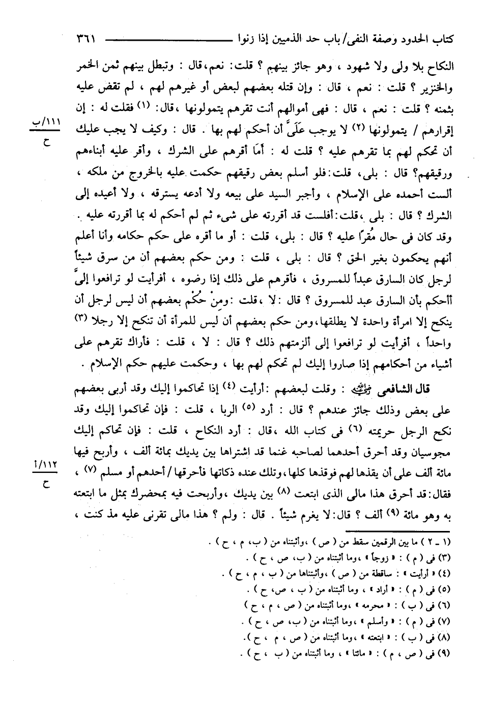 النِّكَاحَ بِلاَ وَلِيٍّ وَلاَ شُهُودٍ وَهُوَ جَائِزٌ بَيْنَهُمْ؟ قُلْت: نَعَمْ قَالَ: وَتُبْطِلُ بَيْنَهُمْ ثَمَنَ الْخَمْرِ وَالْخِنْزِيرِ؟ قُلْت: نَعَمْ قَالَ: وَإِنْ قَتَلَهُ بَعْضُهُمْ لِبَعْضٍ أَوْ غَيْرُهُمْ لَهُمْ لَمْ تَقْضِ عَلَيْهِ بِثَمَنِهِ؟ قُلْت: نَعَمْ قَالَ فَهِيَ أَمْوَالُهُمْ أَنْتَ تُقِرُّهُمْ يتمولونها. قَالَ فَقُلْت لَهُ إنَّ إقْرَارَهُمْ يتمولونها لاَ يُوجِبُ عَلَيَّ أَنْ أَحْكُمَ لَهُمْ بِهَا. قَالَ: وَكَيْفَ لاَ يَجِبُ عَلَيْكَ أَنْ تَحْكُمَ لَهُمْ بِمَا تُقِرُّهُمْ عَلَيْهِ قُلْت لَهُ: أَمَا أُقِرُّهُمْ عَلَى الشِّرْكِ وَأُقِرُّ عَلَيْهِ أَبْنَاءَهُمْ وَرَقِيقَهُمْ؟ قَالَ: بَلَى , قُلْت: فَلَوْ أَسْلَمَ بَعْضُ رَقِيقِهِمْ وَحَكَمْت عَلَيْهِ بِالْخُرُوجِ مِنْ مِلْكِهِ أَلَسْت أَحْمَدُهُ عَلَى الْإِسْلاَمِ وَأُجْبِرُ السَّيِّدَ عَلَى بَيْعِهِ وَلاَ أَدَعُهُ يَسْتَرِقُّهُ وَلاَ أُعِيدُهُ إلَى الشِّرْكِ؟ قَالَ بَلَى قُلْت: أَفْلَسْت أَقْرَرْته عَلَى شَيْءٍ ثُمَّ لَمْ أَحْكُمْ لَهُ بِمَا أَقْرَرْته عَلَيْهِ وَقَدْ كَانَ فِي حَالٍ مُقِرًّا عَلَيْهِ؟ قَالَ: بَلَى قُلْت: أَوْ مَا أُقِرُّهُ عَلَى حُكْمِ حُكَّامِهِ وَأَنَا أَعْلَمُ أَنَّهُمْ يَحْكُمُونَ بِغَيْرِ الْحَقِّ؟ قَالَ بَلَى قُلْت وَمِنْ حُكْمِ بَعْضِهِمْ أَنَّ مَنْ سَرَقَ شَيْئًا لِرَجُلٍ كَانَ السَّارِقُ عَبْدًا لِلْمَسْرُوقِ فَأُقِرَّهُمْ عَلَى ذَلِكَ إذَا رَضُوهُ أَفَرَأَيْت لَوْ تَرَافَعُوا إلَيَّ الْحُكْمَ بِأَنَّ السَّارِقَ عَبْدٌ لِلْمَسْرُوقِ قَالَ: لاَ قُلْت: وَمِنْ حُكْمِ بَعْضِهِمْ أَنْ لَيْسَ لِرَجُلٍ أَنْ يَنْكِحَ إلَّا امْرَأَةً وَاحِدَةً لاَ يُطَلِّقُهَا. وَمِنْ حُكْمِ بَعْضِهِمْ أَنْ لَيْسَ لِلْمَرْأَةِ أَنْ تَنْكِحَ إلَّا رَجُلاً وَاحِدًا أَفَرَأَيْت لَوْ تَرَافَعُوا إلَيَّ أَلْزَمْتهمْ ذَلِكَ؟ قَالَ: لاَ قُلْت فَأَرَاك تُقِرُّهُمْ عَلَى أَشْيَاءَ مِنْ أَحْكَامِهِمْ إذَا صَارُوا إلَيْكَ لَمْ تَحْكُمْ لَهُمْ بِهَا وَحَكَمْت عَلَيْهِمْ حُكْمَ الْإِسْلاَمِ.