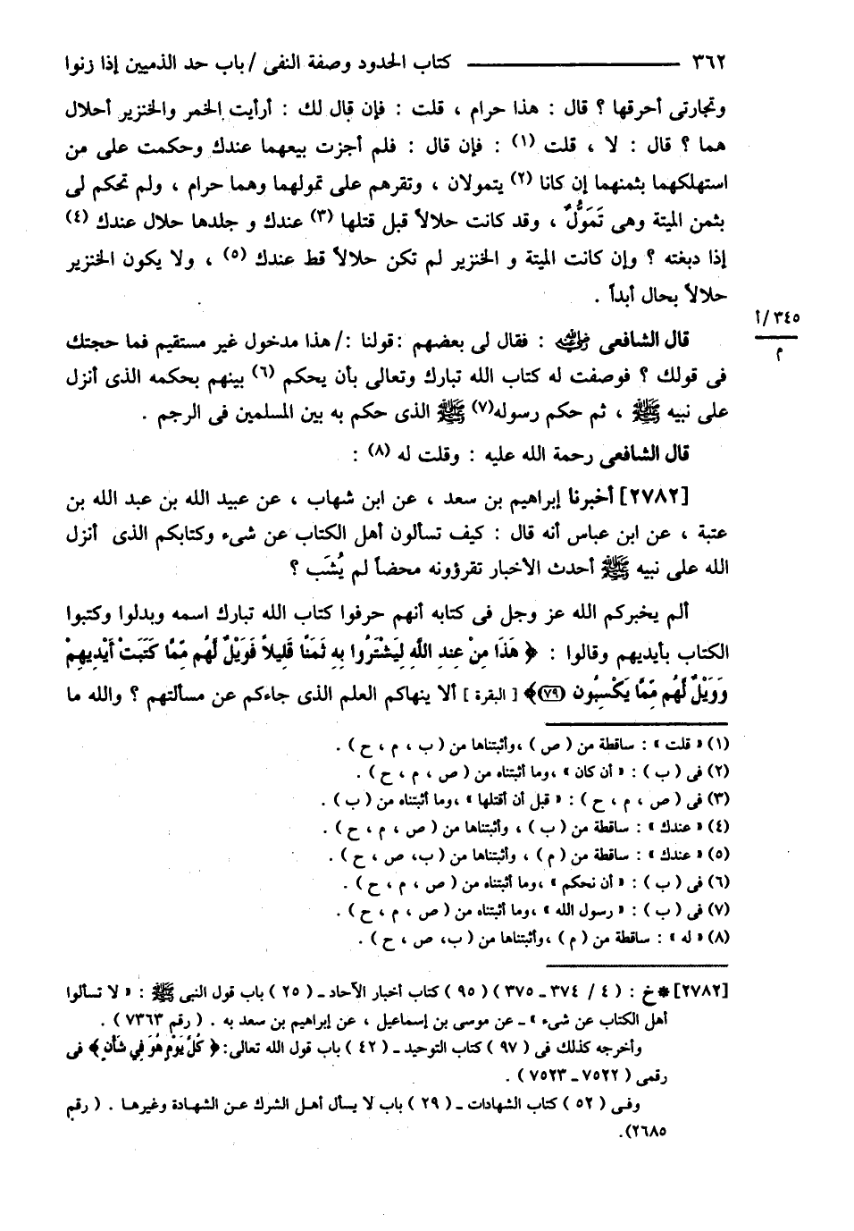 قَالَ الشَّافِعِيُّ: فَقَالَ لِي بَعْضُهُمْ قَوْلُنَا هَذَا مَدْخُولٌ غَيْرُ مُسْتَقِيمٍ فَمَا حُجَّتُكَ فِي قَوْلِكَ؟ فَوَصَفْت لَهُ كِتَابَ اللَّهِ تَبَارَكَ وَتَعَالَى أَنْ نَحْكُمَ بَيْنَهُمْ بِحُكْمِهِ الَّذِي أَنْزَلَ عَلَى نَبِيِّهِ عليه الصلاة والسلام ثُمَّ حُكْمِ رَسُولِ اللَّهِ - صلى الله عليه وسلم - الَّذِي حَكَمَ بِهِ بَيْنَ الْمُسْلِمِينَ فِي الرَّجْمِ.