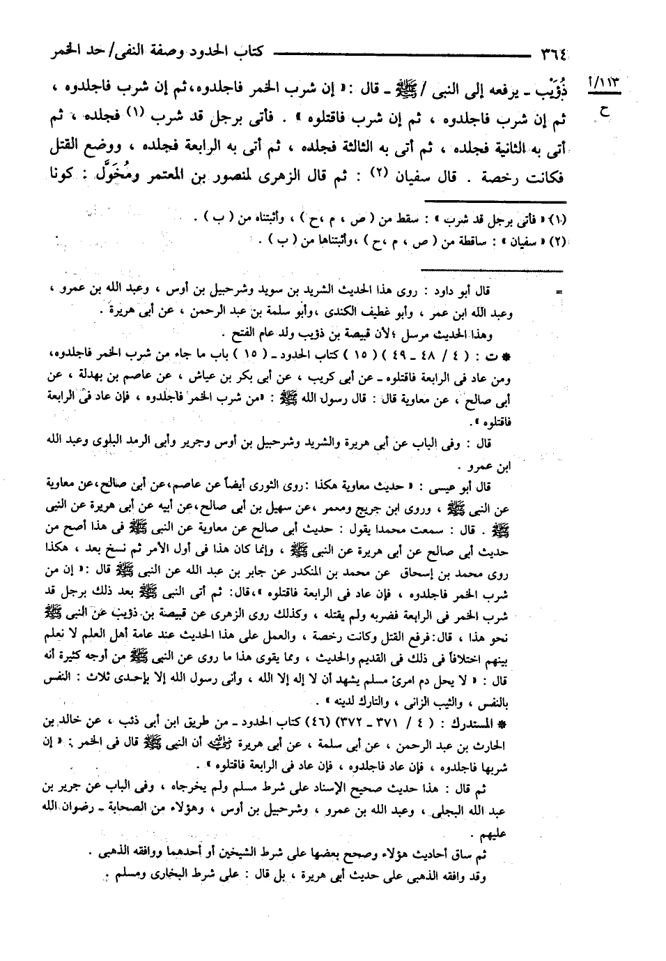 ذُؤَيْبٍ يَرْفَعُهُ إلَى النَّبِيِّ - صلى الله عليه وسلم - قَالَ : : ? إنْ شَرِبَ الْخَمْرَ فَاجْلِدُوهُ ثُمَّ إنْ شَرِبَ فَاجْلِدُوهُ ثُمَّ إنْ شَرِبَ فَاجْلِدُوهُ ثُمَّ إنْ شَرِبَ فَاقْتُلُوهُ فَأُتِيَ بِرَجُلٍ قَدْ شَرِبَ فَجَلَدَهُ ثُمَّ أُتِيَ بِهِ الثَّانِيَةَ فَجَلَدَهُ ثُمَّ أُتِيَ بِهِ الثَّالِثَةَ فَجَلَدَهُ ثُمَّ أُتِيَ بِهِ الرَّابِعَةَ فَجَلَدَهُ وَوَضَعَ الْقَتْلَ ? فَكَانَتْ رُخْصَةً ( قَالَ ) سُفْيَانُ ثُمَّ قَالَ الزُّهْرِيُّ لِمَنْصُورِ بْنِ الْمُعْتَمِرِ وَمُخَوَّلٍ كُونَا@