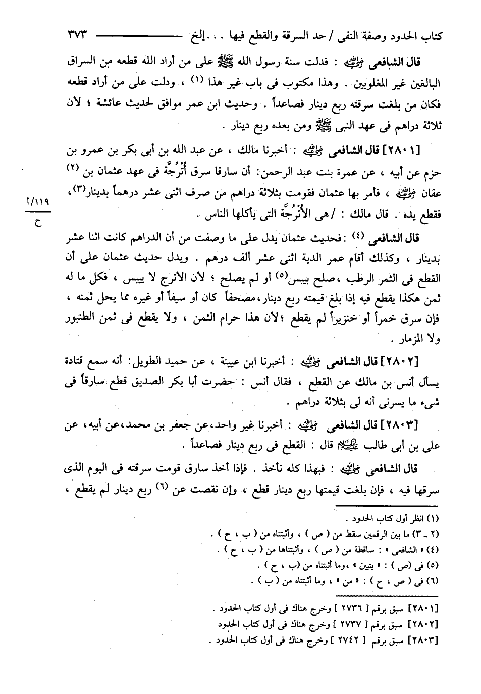 قَالَ الشَّافِعِيُّ : فَدَلَّتْ سُنَّةُ رَسُولِ اللَّهِ - صلى الله عليه وسلم - عَلَى مَنْ أَرَادَ اللَّهُ قَطْعَهُ مِنْ السُّرَّاقِ الْبَالِغِينَ غَيْرِ الْمَغْلُوبِينَ وَهَذَا مَكْتُوبٌ فِي بَابٍ غَيْرِ هَذَا وَدَلَّتْ عَلَى مَنْ أَرَادَ قَطْعَهُ فَكَانَ مَنْ بَلَغَتْ سَرِقَتُهُ رُبُعَ دِينَارٍ فَصَاعِدًا وَحَدِيثُ ابْنِ عُمَرَ مُوَافِقٌ لِحَدِيثِ عَائِشَةَ ; لِأَنَّ ثَلاَثَةَ دَرَاهِمَ فِي عَهْدِ النَّبِيِّ - صلى الله عليه وسلم - وَمَنْ بَعْدَهُ رُبُعُ دِينَارٍ