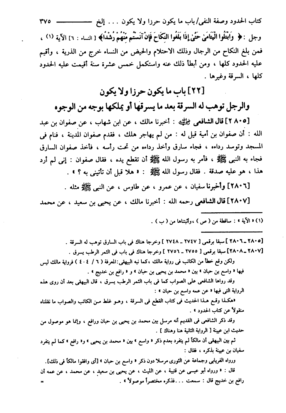 قَالَ الشَّافِعِيُّ : رحمه الله تعالى أَخْبَرَنَا مَالِكٌ عَنْ ابْنِ شِهَابٍ عَنْ صَفْوَانَ بْنِ عَبْدِ اللَّهِ : ? أَنَّ صَفْوَانَ بْنَ أُمَيَّةَ قِيلَ لَهُ مَنْ لَمْ يُهَاجِرْ هَلَكَ فَقَدِمَ صَفْوَانُ الْمَدِينَةَ فَنَامَ فِي الْمَسْجِدِ وَتَوَسَّدَ رِدَاءَهُ فَجَاءَ سَارِقٌ وَأَخَذَ رِدَاءَهُ مِنْ تَحْتِ رَأْسِهِ فَأَخَذَ صَفْوَانُ السَّارِقَ فَجَاءَ بِهِ النَّبِيَّ - صلى الله عليه وسلم - فَأَمَرَ بِهِ رَسُولُ اللَّهِ - صلى الله عليه وسلم - أَنْ تُقْطَعَ يَدُهُ فَقَالَ صَفْوَانُ إنِّي لَمْ أُرِدْ هَذَا هُوَ عَلَيْهِ صَدَقَةٌ فَقَالَ رَسُولُ اللَّهِ - صلى الله عليه وسلم - هَلَّا قَبْلَ أَنْ تَأْتِيَنِي بِهِ ؟ ? وَأَخْبَرَنَا سُفْيَانُ عَنْ عَمْرٍو عَنْ طَاوُسٍ عَنْ النَّبِيِّ - صلى الله عليه وسلم - مِثْلَهُ