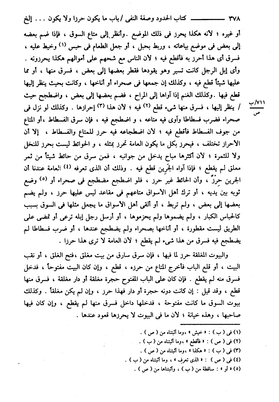 أَوْ غَيْرِهِ ; لِأَنَّهُ هَكَذَا يُحْرَزُ فِي ذَلِكَ الْمَوْضِعِ وَانْظُرْ إلَى مَتَاعِ السُّوقِ فَإِذَا ضُمَّ بَعْضُهُ إلَى بَعْضٍ فِي مَوْضِعٍ بِيَاعَاتِهِ وَرُبِطَ بِحَبْلٍ أَوْ جُعِلَ الطَّعَامُ فِي خَيْشٍ وَخِيطَ عَلَيْهِ فَسُرِقَ أَيْ هَذَا أُحْرِزَ بِهِ فَأَقْطَعُ فِيهِ ; لِأَنَّ النَّاسَ مَعَ شُحِّهِمْ عَلَى أَمْوَالِهِمْ هَكَذَا يُحْرِزُونَهُ وَأَيُّ إبِلِ الرَّجُلِ كَانَتْ تَسِيرُ وَهُوَ يَقُودُهَا فَقَطَرَ بَعْضُهَا إلَى بَعْضٍ فَسَرَقَ مِنْهَا أَوْ مِمَّا عَلَيْهَا شَيْئًا قُطِعَ فِيهِ , وَكَذَلِكَ إنْ جَمَعَهَا فِي صَحْرَاءَ أَوْ أَنَاخَهَا وَكَانَتْ بِحَيْثُ يَنْظُرُ إلَيْهَا قُطِعَ فِيهَا , وَكَذَلِكَ الْغَنَمُ إذَا آوَاهَا إلَى الْمُرَاحِ فَضَمَّ بَعْضَهَا إلَى بَعْضٍ وَاضْطَجَعَ حَيْثُ يَنْظُرُ إلَيْهَا فَسُرِقَ مِنْهَا شَيْءٌ قُطِعَ فِيهِ ; لِأَنَّهُ هَكَذَا إحْرَازُهَا , وَكَذَلِكَ لَوْ نَزَلَ فِي صَحْرَاءَ فَضَرَبَ فُسْطَاطًا وَآوَى فِيهِ مَتَاعَهُ وَاضْطَجَعَ فِيهِ فَإِنْ سُرِقَ الْفُسْطَاطُ وَالْمَتَاعُ مِنْ جَوْفِ الْفُسْطَاطِ فَأَقْطَعُ فِيهِ ; لِأَنَّ اضْطِجَاعَهُ فِيهِ حِرْزٌ لِلْمَتَاعِ وَالْفُسْطَاطِ إلَّا أَنَّ الْأَحْرَازَ تَخْتَلِفُ فَيُحْرَزُ بِكُلِّ مَا يَكُونُ الْعَامَّةُ تُحْرِزُ بِمِثْلِهِ وَالْحَوَائِطُ لَيْسَتْ بِحِرْزٍ لِلنَّخْلِ وَلاَ لِلثَّمَرَةِ ; لِأَنَّ أَكْثَرَهَا مُبَاحٌ يَدْخُلُ مِنْ جَوَانِبِهِ فَمَنْ سَرَقَ مِنْ حَائِطٍ شَيْئًا مِنْ ثَمَرٍ مُعَلَّقٍ لَمْ يُقْطَعْ فَإِذَا آوَاهُ الْجَرِينُ قُطِعَ فِيهِ وَذَلِكَ أَنَّ الَّذِي تَعْرِفُهُ الْعَامَّةُ عِنْدَنَا أَنَّ الْجَرِينَ حِرْزٌ وَأَنَّ الْحَائِطَ غَيْرُ حِرْزٍ فَلَوْ اضْطَجَعَ مُضْطَجِعٌ فِي صَحْرَاءَ وَضَعَ ثَوْبَهُ بَيْنَ يَدَيْهِ أَوْ تَرَكَ أَهْلُ الْأَسْوَاقِ مَتَاعَهُمْ فِي مَقَاعِدَ لَيْسَ عَلَيْهَا حِرْزٌ وَلَمْ يُضَمَّ بَعْضُهَا إلَى بَعْضٍ وَلَمْ تُرْبَطْ أَوْ أَلْقَى أَهْلُ الْأَسْوَاقِ مَا يُجْعَلُ مِثْلُهَا فِي السُّوقِ بِسَبَبٍ كَالْحَبَّاسِ الْكِبَارِ وَلَمْ يَضُمُّوهَا وَلَمْ يَحْزِمُوهَا أَوْ أَرْسَلَ رَجُلٌ إبِلَهُ تَرْعَى أَوْ تَمْضِي عَلَى الطَّرِيقِ لَيْسَتْ مَقْطُورَةً أَوْ أَنَاخَهَا بِصَحْرَاءَ وَلَمْ يَضْطَجِعْ عِنْدَهَا أَوْ ضَرَبَ فُسْطَاطًا لَمْ يَضْطَجِعْ فِيهِ فَسُرِقَ مِنْ هَذَا شَيْءٌ لَمْ يُقْطَعْ ; لِأَنَّ الْعَامَّةَ لاَ تَرَى هَذَا حِرْزًا