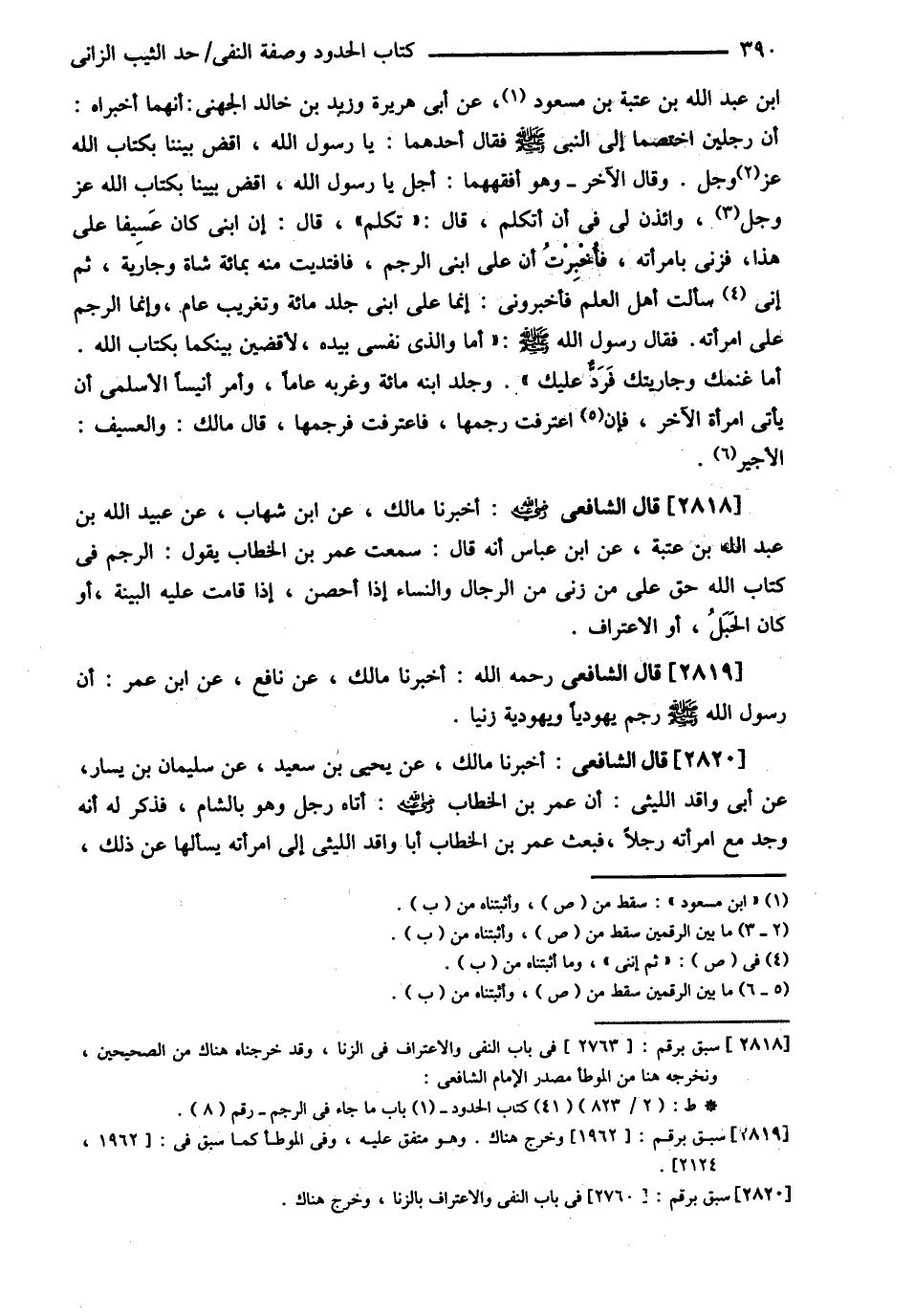 قَالَ الشَّافِعِيُّ: أَخْبَرَنَا مَالِكٌ عَنْ ابْنِ شِهَابٍ عَنْ عُبَيْدِ اللَّهِ بْنِ عَبْدِ اللَّهِ بْنِ عُتْبَةَ عَنْ ابْنِ عَبَّاسٍ أَنَّهُ قَالَ سَمِعْت عُمَرَ بْنَ الْخَطَّابِ رضي الله عنه يَقُولُ: الرَّجْمُ فِي كِتَابِ اللَّهِ حَقٌّ عَلَى مَنْ زَنَى مِنْ الرِّجَالِ وَالنِّسَاءِ إذَا أُحْصِنَ إذَا قَامَتْ عَلَيْهِ الْبَيِّنَةُ أَوْ كَانَ الْحَبَلُ أَوْ الِاعْتِرَافُ.