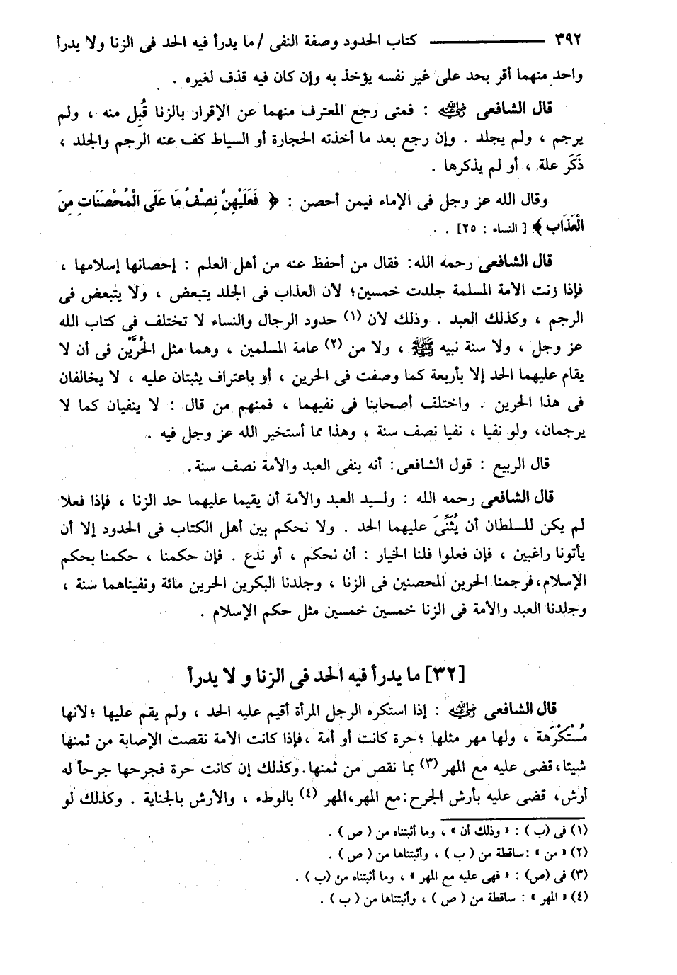 قَالَ الشَّافِعِيُّ: وَلِسَيِّدِ الْعَبْدِ وَالْأَمَةِ أَنْ يُقِيمَا عَلَيْهِمَا حَدَّ الزِّنَا فَإِذَا فَعَلاَ لَمْ يَكُنْ لِلسُّلْطَانِ أَنْ يُثَنِّيَ عَلَيْهِمَا الْحَدَّ وَلاَ نَحْكُمُ بَيْنَ أَهْلِ الْكِتَابِ فِي الْحُدُودِ إلَّا أَنْ يَأْتُونَا رَاغِبِينَ فَإِنْ فَعَلُوا فَلَنَا الْخِيَارُ أَنْ نَحْكُمَ أَوْ نَدَعَ فَإِنْ حَكَمْنَا حَكَمْنَا بِحُكْمِ الْإِسْلاَمِ فَرَجَمْنَا الْحُرَّيْنِ الْمُحْصَنَيْنِ فِي الزِّنَا وَجَلَدْنَا الْبِكْرَيْنِ وَالْحُرَّيْنِ مِائَةً وَنَفَيْنَاهُمَا سَنَةً وَجَلَدْنَا الْعَبْدَ وَالْأَمَةَ فِي الزِّنَا خَمْسِينَ خَمْسِينَ مِثْلَ حُكْمِ الْإِسْلاَمِ. .