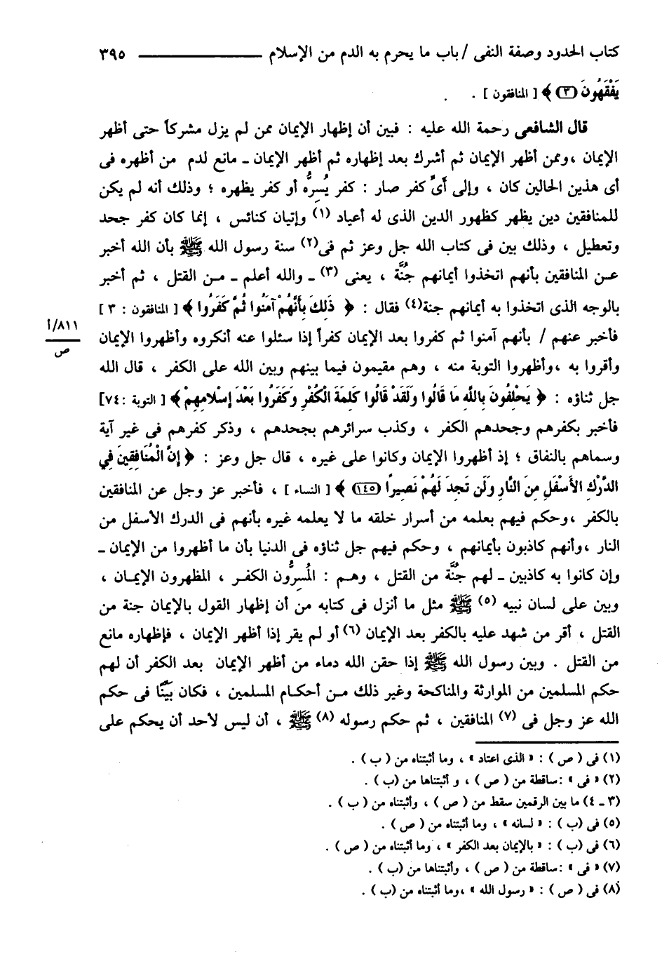 قَالَ الشَّافِعِيُّ: فَبَيَّنَ أَنَّ إظْهَارَ الْإِيمَانِ مِمَّنْ لَمْ يَزَلْ مُشْرِكًا حَتَّى أَظْهَرَ الْإِيمَانَ وَمِمَّنْ أَظْهَرَ الْإِيمَانَ ثُمَّ أَشْرَكَ بَعْدَ إظْهَارِهِ ثُمَّ أَظْهَرَ الْإِيمَانَ مَانِعٌ لِدَمِ مَنْ أَظْهَرَهُ فِي أَيِّ هَذَيْنِ الْحَالَيْنِ كَانَ وَإِلَى أَيِّ كُفْرٍ صَارَ كُفْرٌ يُسِرُّهُ أَوْ كُفْرٌ يُظْهِرُهُ وَذَلِكَ أَنَّهُ لَمْ يَكُنْ لِلْمُنَافِقِينَ دِينٌ يُظْهَرُ كَظُهُورِ الدِّينِ الَّذِي لَهُ أَعْيَادٌ وَإِتْيَانِ كَنَائِسَ إنَّمَا كَانَ كُفْرٌ جُحِدَ وَتَعْطِيلٌ وَذَلِكَ بَيِّنٌ فِي كِتَابِ اللَّهِ عَزَّ وَجَلَّ ثُمَّ فِي سُنَّةِ رَسُولِ اللَّهِ - صلى الله عليه وسلم - بِأَنَّ اللَّهَ عَزَّ وَجَلَّ أَخْبَرَ عَنْ الْمُنَافِقِينَ بِأَنَّهُمْ اتَّخَذُوا أَيْمَانَهُمْ جُنَّةً يَعْنِي وَاَللَّهُ أَعْلَمُ مِنْ الْقَتْلِ ثُمَّ أَخْبَرَ بِالْوَجْهِ الَّذِي اتَّخَذُوا بِهِ أَيْمَانَهُمْ جُنَّةً فَقَالَ: ? ذَلِكَ بِأَنَّهُمْ آمَنُوا ثُمَّ كَفَرُوا ? فَأَخْبَرَ عَنْهُمْ بِأَنَّهُمْ آمَنُوا ثُمَّ كَفَرُوا بَعْدَ الْإِيمَانِ كُفْرًا إذَا سُئِلُوا عَنْهُ أَنْكَرُوهُ وَأَظْهَرُوا الْإِيمَانَ وَأَقَرُّوا بِهِ وَأَظْهَرُوا التَّوْبَةَ مِنْهُ وَهُمْ مُقِيمُونَ فِيمَا بَيْنَهُمْ وَبَيْنَ اللَّهِ عَلَى الْكُفْرِ قَالَ اللَّهُ جَلَّ ثَنَاؤُهُ: ? يَحْلِفُونَ بِاَللَّهِ مَا قَالُوا وَلَقَدْ قَالُوا كَلِمَةَ الْكُفْرِ وَكَفَرُوا بَعْدَ إسْلاَمِهِمْ ? فَأَخْبَرَ بِكُفْرِهِمْ وَجَحْدِهِمْ الْكُفْرَ وَكَذَّبَ سَرَائِرَهُمْ بِجَحْدِهِمْ وَذَكَرَ كُفْرَهُمْ فِي غَيْرِ آيَةٍ وَسَمَّاهُمْ بِالنِّفَاقِ إذْ أَظْهَرُوا الْإِيمَانَ وَكَانُوا عَلَى غَيْرِهِ قَالَ جَلَّ وَعَزَّ ": ? إنَّ الْمُنَافِقِينَ فِي الدَّرْكِ الْأَسْفَلِ مِنْ النَّارِ وَلَنْ تَجِدَ لَهُمْ نَصِيرًا ? فَأَخْبَرَ عَزَّ وَجَلَّ عَنْ الْمُنَافِقِينَ بِالْكُفْرِ وَحَكَمَ فِيهِمْ بِعِلْمِهِ مِنْ أَسْرَارِ خَلْقِهِ مَا لاَ يَعْلَمُهُ غَيْرُهُ بِأَنَّهُمْ فِي الدَّرْكِ الْأَسْفَلِ مِنْ النَّارِ وَأَنَّهُمْ كَاذِبُونَ بِأَيْمَانِهِمْ وَحَكَمَ فِيهِمْ جَلَّ ثَنَاؤُهُ فِي الدُّنْيَا بِأَنَّ مَا أَظْهَرُوا مِنْ الْإِيمَانِ وَإِنْ كَانُوا بِهِ كَاذِبِينَ لَهُمْ جُنَّةٌ مِنْ الْقَتْلِ وَهُمْ الْمُسِرُّونَ الْكُفْرَ الْمُظْهِرُونَ الْإِيمَانَ وَبَيَّنَ عَلَى لِسَانِهِ - صلى الله عليه وسلم - مِثْلَ مَا أَنْزَلَ فِي كِتَابِهِ مِنْ أَنَّ إظْهَارَ الْقَوْلِ بِالْإِيمَانِ جُنَّةٌ مِنْ الْقَتْلِ أَقَرَّ مَنْ شَهِدَ عَلَيْهِ بِالْإِيمَانِ بَعْدَ الْكُفْرِ أَوْ لَمْ يُقِرَّ إذَا أَظْهَرَ الْإِيمَانَ فَإِظْهَارُهُ مَانِعٌ مِنْ الْقَتْلِ وَبَيَّنَ رَسُولُ اللَّهِ - صلى الله عليه وسلم - إذَا حَقَنَ اللَّهُ تَعَالَى دِمَاءَ مَنْ أَظْهَرَ الْإِيمَانَ بَعْدَ الْكُفْرِ أَنَّ لَهُمْ حُكْمَ الْمُسْلِمِينَ مِنْ الْمُوَارَثَةِ وَالْمُنَاكَحَةِ وَغَيْرِ ذَلِكَ مِنْ أَحْكَامِ الْمُسْلِمِينَ. فَكَانَ بَيِّنًا فِي حُكْمِ اللَّهِ عَزَّ وَجَلَّ فِي الْمُنَافِقِينَ ثُمَّ حُكْمِ رَسُولِهِ - صلى الله عليه وسلم - أَنْ لَيْسَ لِأَحَدٍ أَنْ يَحْكُمَ عَلَى@