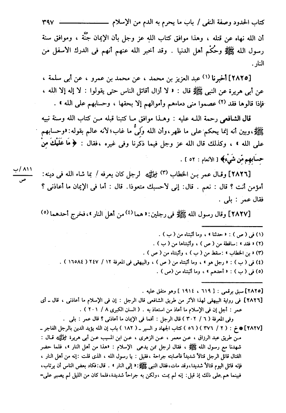 قَالَ الشَّافِعِيُّ: رحمه الله: وَهَذَا مُوَافِقٌ مَا كَتَبْنَا قَبْلَهُ مِنْ كِتَابِ اللَّهِ وَسُنَّةِ نَبِيِّهِ - صلى الله عليه وسلم - وَبَيَّنَ أَنَّهُ إنَّمَا يَحْكُمُ عَلَى مَا ظَهَرَ وَأَنَّ اللَّهَ تَعَالَى وَلِيُّ مَا غَابَ لِأَنَّهُ عَالِمٌ بِقَوْلِهِ وَحِسَابُهُمْ عَلَى اللَّهِ وَكَذَلِكَ قَالَ اللَّهُ عَزَّ وَجَلَّ فِيمَا ذَكَرْنَا وَفِي غَيْرِهِ فَقَالَ: ? مَا عَلَيْك مِنْ حِسَابِهِمْ مِنْ شَيْءٍ ? وَقَالَ عُمَرُ رضي الله عنه لِرَجُلٍ كَانَ يَعْرِفُهُ بِمَا شَاءَ اللَّهُ فِي دِينِهِ " أَمُؤْمِنٌ أَنْتَ؟ " قَالَ نَعَمْ قَالَ " إنِّي لِأَحْسِبك مُتَعَوِّذًا " قَالَ أَمَّا فِي الْإِيمَانِ مَا أَعَاذَنِي؟ فَقَالَ عُمَرُ بَلَى: ? وَقَالَ رَسُولُ اللَّهِ - صلى الله عليه وسلم - فِي رَجُلٍ هُوَ مِنْ أَهْلِ النَّارِ فَخَرَجَ أَحَدُهُمْ@
