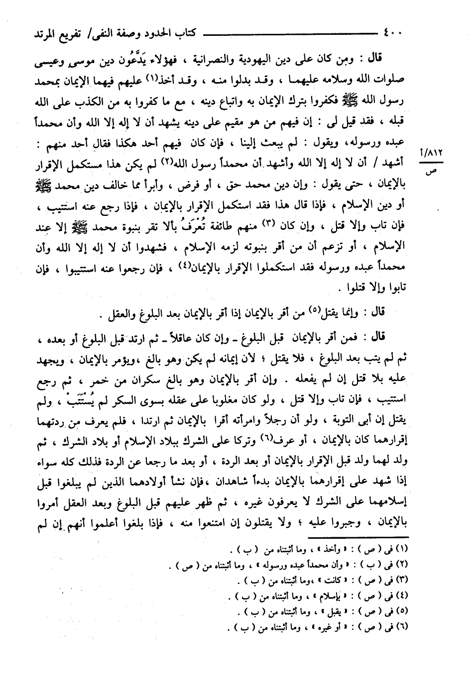 ( قَالَ ) وَمَنْ كَانَ عَلَى دِينِ الْيَهُودِيَّةِ وَالنَّصْرَانِيَّةِ فَهَؤُلاَءِ يَدَّعُونَ دِينَ مُوسَى وَعِيسَى صَلَوَاتُ اللَّهِ وَسَلاَمُهُ عَلَيْهِمَا وَقَدْ بَدَّلُوا مِنْهُ وَقَدْ أَخَذَ عَلَيْهِمْ فِيهِمَا الْإِيمَانَ بِمُحَمَّدٍ رَسُولِ اللَّهِ - صلى الله عليه وسلم - فَكَفَرُوا بِتَرْكِ الْإِيمَانِ بِهِ وَاتِّبَاعِ دِينِهِ مَعَ مَا كَفَرُوا بِهِ مِنْ الْكَذِبِ عَلَى اللَّهِ قَبْلَهُ فَقَدْ قِيلَ لِي إنَّ فِيهِمْ مَنْ هُوَ مُقِيمٌ عَلَى دِينِهِ يَشْهَدُ أَنْ لاَ إلَهَ إلَّا اللَّهُ وَأَنَّ مُحَمَّدًا عَبْدُهُ وَرَسُولُهُ وَيَقُولُ لَمْ يُبْعَثْ إلَيْنَا فَإِنْ كَانَ فِيهِمْ أَحَدٌ هَكَذَا فَقَالَ أَحَدٌ مِنْهُمْ أَشْهَدُ أَنْ لاَ إلَهَ إلَّا اللَّهُ وَأَنَّ مُحَمَّدًا عَبْدُهُ وَرَسُولُهُ لَمْ يَكُنْ هَذَا مُسْتَكْمِلَ الْإِقْرَارِ بِالْإِيمَانِ حَتَّى يَقُولَ وَإِنَّ دِينَ مُحَمَّدٍ حَقٌّ أَوْ فَرْضٌ وَأَبْرَأُ مِمَّا خَالَفَ دِينَ مُحَمَّدٍ - صلى الله عليه وسلم - أَوْ دِينَ الْإِسْلاَمِ فَإِذَا قَالَ هَذَا فَقَدْ اسْتَكْمَلَ الْإِقْرَارَ بِالْإِيمَانِ فَإِذَا رَجَعَ عَنْهُ اُسْتُتِيبَ فَإِنْ تَابَ وَإِلَّا قُتِلَ وَإِنْ كَانَ مِنْهُمْ طَائِفَةٌ تُعْرَفُ بِأَنْ لاَ تُقِرَّ بِنُبُوَّةِ مُحَمَّدٍ - صلى الله عليه وسلم - إلَّا عِنْدَ الْإِسْلاَمِ أَوْ تَزْعُمُ أَنَّ مَنْ أَقَرَّ بِنُبُوَّتِهِ لَزِمَهُ الْإِسْلاَمُ فَشَهِدُوا أَنْ لاَ إلَهَ إلَّا اللَّهُ وَأَنَّ مُحَمَّدًا عَبْدُهُ وَرَسُولُهُ فَقَدْ اسْتَكْمَلُوا الْإِقْرَارَ بِالْإِيمَانِ فَإِنْ رَجَعُوا عَنْهُ اُسْتُتِيبُوا فَإِنْ تَابُوا وَإِلَّا قُتِلُوا ( قَالَ ) وَإِنَّمَا يُقْتَلُ مَنْ أَقَرَّ بِالْإِيمَانِ إذَا أَقَرَّ بِالْإِيمَانِ بَعْدَ الْبُلُوغِ وَالْعَقْلِ ( قَالَ ) فَمَنْ أَقَرَّ بِالْإِيمَانِ قَبْلَ الْبُلُوغِ وَإِنْ كَانَ عَاقِلاً ثُمَّ ارْتَدَّ قَبْلَ الْبُلُوغِ أَوْ بَعْدَهُ ثُمَّ لَمْ يَتُبْ بَعْدَ الْبُلُوغِ فَلاَ يُقْتَلُ لِأَنَّ إيمَانَهُ لَمْ يَكُنْ وَهُوَ بَالِغٌ وَيُؤْمَرُ بِالْإِيمَانِ وَيُجْهَدُ عَلَيْهِ بِلاَ قَتْلٍ إنْ لَمْ يَفْعَلْهُ وَإِنْ أَقَرَّ بِالْإِيمَانِ وَهُوَ بَالِغٌ سَكْرَانُ مِنْ خَمْرٍ ثُمَّ رَجَعَ اُسْتُتِيبَ فَإِنْ تَابَ وَإِلَّا قُتِلَ وَلَوْ كَانَ مَغْلُوبًا عَلَى عَقْلِهِ بِسِوَى السُّكْرِ لَمْ يُسْتَتَبْ وَلَمْ يُقْتَلْ إنْ أَبَى التَّوْبَةَ وَلَوْ أَنَّ رَجُلاً وَامْرَأَتَهُ أَقَرَّا بِالْإِيمَانِ ثُمَّ ارْتَدَّا فَلَمْ يُعْرَفْ مِنْ رِدَّتِهِمَا إقْرَارُهُمَا كَانَ بِالْإِيمَانِ أَوْ عُرِفَ وَتُرِكَا عَلَى الشِّرْكِ بِبِلاَدِ الْإِسْلاَمِ أَوْ بِلاَدِ الشِّرْكِ ثُمَّ وُلِدَ لَهُمَا وَلَدٌ قَبْلَ الْإِقْرَارِ بِالْإِيمَانِ أَوْ بَعْدَ الرِّدَّةِ أَوْ بَعْدَمَا رَجَعَا عَنْ الرِّدَّةِ فَذَلِكَ كُلُّهُ سَوَاءٌ إذَا شَهِدَ عَلَى إقْرَارِهِمَا بِالْإِيمَانِ بَدِيئًا شَاهِدَانِ فَإِنْ نَشَأَ أَوْلاَدُهُمَا الَّذِينَ لَمْ يَبْلُغُوا قَبْلَ إسْلاَمِهِمَا عَلَى الشِّرْكِ لاَ يَعْرِفُونَ غَيْرَهُ ثُمَّ ظَهَرَ عَلَيْهِمْ قَبْلَ الْبُلُوغِ وَبَعْدَ الْعَقْلِ أُمِرُوا بِالْإِيمَانِ وَجُبِرُوا عَلَيْهِ وَلاَ يُقْتَلُونَ إنْ امْتَنَعُوا مِنْهُ فَإِذَا بَلَغُوا أُعْلِمُوا أَنَّهُمْ إنْ لَمْ@