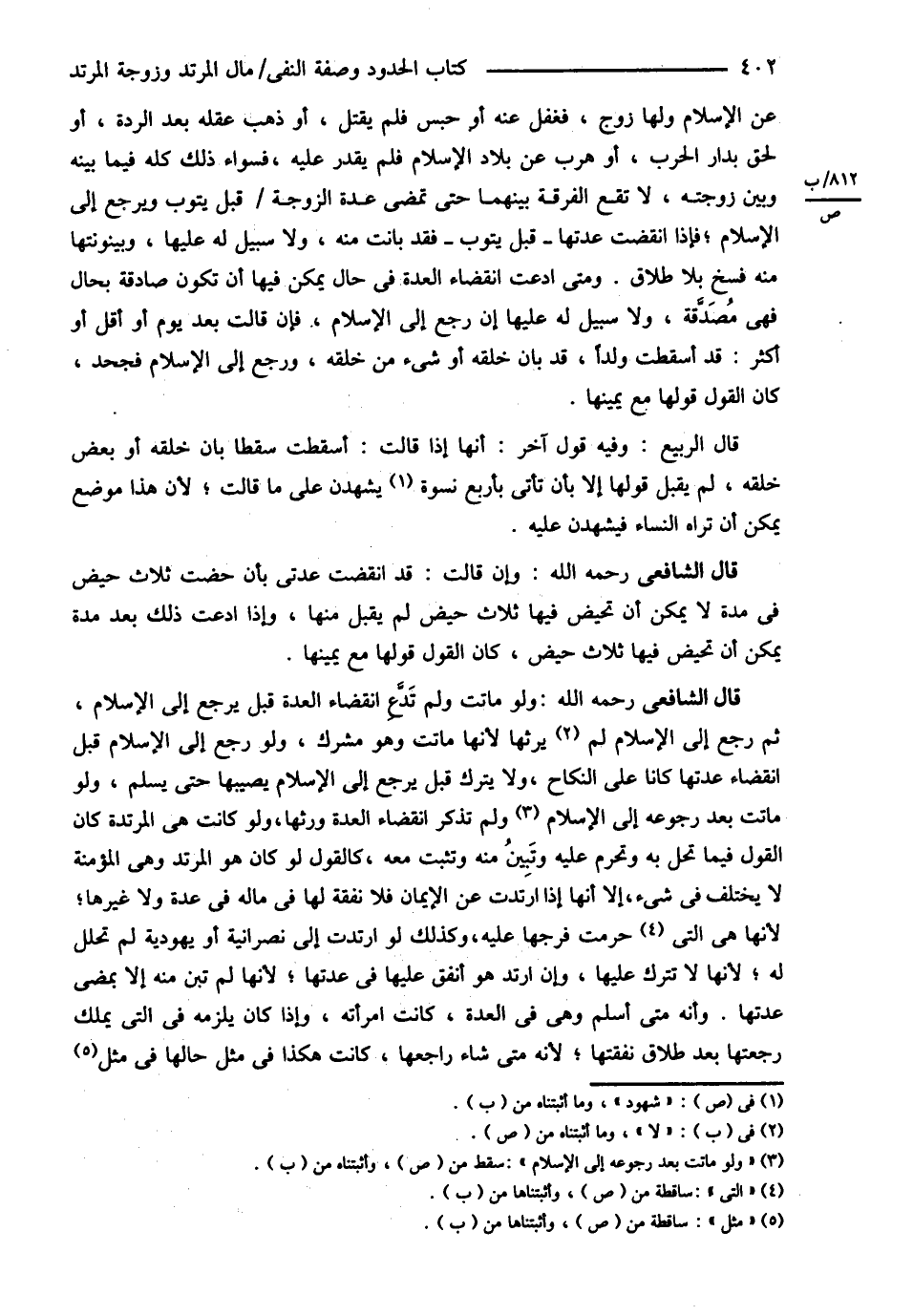 عَنْ الْإِسْلاَمِ وَلَهَا زَوْجٌ فَغَفَلَ عَنْهُ أَوْ حُبِسَ فَلَمْ يُقْتَلْ أَوْ ذَهَبَ عَقْلُهُ بَعْدَ الرِّدَّةِ أَوْ لَحِقَ بِدَارِ الْحَرْبِ أَوْ هَرَبَ عَنْ بِلاَدِ الْإِسْلاَمِ فَلَمْ يُقْدَرْ عَلَيْهِ فَسَوَاءٌ ذَلِكَ كُلُّهُ فِيمَا بَيْنَهُ وَبَيْنَ زَوْجَتِهِ لاَ تَقَعُ الْفُرْقَةُ بَيْنَهُمَا حَتَّى تَمْضِيَ عِدَّةُ الزَّوْجَةِ قَبْلَ يَتُوبُ وَيَرْجِعُ إلَى الْإِسْلاَمِ فَإِذَا انْقَضَتْ عِدَّتُهَا قَبْلَ يَتُوبُ فَقَدْ بَانَتْ مِنْهُ وَلاَ سَبِيلَ لَهُ عَلَيْهَا وَبَيْنُونَتُهَا مِنْهُ فَسْخٌ بِلاَ طَلاَقٍ وَمَتَى ادَّعَتْ انْقِضَاءَ الْعِدَّةِ فِي حَالٍ يُمْكِنُ فِيهَا أَنْ تَكُونَ صَادِقَةً بِحَالٍ فَهِيَ مُصَدَّقَةٌ وَلاَ سَبِيلَ لَهُ عَلَيْهَا إنْ رَجَعَ إلَى الْإِسْلاَمِ فَإِنْ قَالَتْ بَعْدَ يَوْمٍ أَوْ أَقَلَّ أَوْ أَكْثَرَ قَدْ أَسْقَطْت وَلَدًا قَدْ بَانَ خَلْقُهُ أَوْ شَيْءٌ مِنْ خَلْقِهِ وَرَجَعَ إلَى الْإِسْلاَمِ فَجَحَدَ كَانَ الْقَوْلُ قَوْلَهَا مَعَ يَمِينِهَا قَالَ الرَّبِيعُ وَفِيهِ قَوْلٌ آخَرُ أَنَّهَا إذَا قَالَتْ أَسْقَطْت سِقْطًا بَانَ خَلْقُهُ أَوْ بَعْضُ خَلْقِهِ لَمْ يُقْبَلْ قَوْلُهَا إلَّا بِأَنْ تَأْتِيَ بِأَرْبَعِ نِسْوَةٍ يَشْهَدْنَ عَلَى مَا قَالَتْ لِأَنَّ هَذَا مَوْضِعٌ يُمْكِنُ أَنْ تَرَاهُ النِّسَاءُ فَيَشْهَدْنَ عَلَيْهِ .