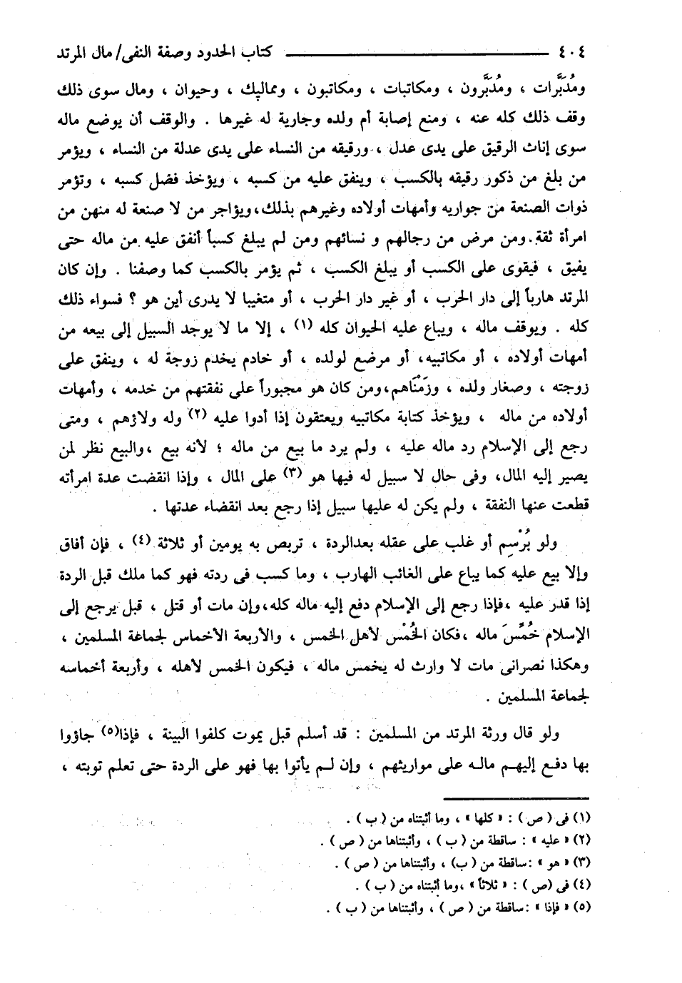 وَمُدَبَّرَاتٌ وَمُدَبَّرُونَ وَمُكَاتَبَاتٌ وَمُكَاتَبُونَ وَمَمَالِيكُ وَحَيَوَانٌ وَمَالٌ سِوَى ذَلِكَ وُقِفَ ذَلِكَ كُلُّهُ عَنْهُ وَمُنِعَ إصَابَةَ أُمِّ وَلَدِهِ وَجَارِيَةٍ لَهُ غَيْرُهَا , وَالْوَقْفُ أَنْ يُوضَعَ مَالُهُ سِوَى إنَاثِ الرَّقِيقِ عَلَى يَدَيْ عَدْلٍ وَرَقِيقُهُ مِنْ النِّسَاءِ عَلَى يَدَيْ عَدْلَةٍ مِنْ النِّسَاءِ وَيُؤْمَرُ مَنْ بَلَغَ مِنْ ذُكُورِ رَقِيقِهِ بِالْكَسْبِ وَيُنْفِقُ عَلَيْهِ مِنْ كَسْبِهِ وَيُؤْخَذُ فَضْلُ كَسْبِهِ وَتُؤْمَرُ ذَوَاتُ الصَّنْعَةِ مِنْ جَوَارِيهِ وَأُمَّهَاتِ أَوْلاَدِهِ وَغَيْرِهِمْ بِذَلِكَ وَيُؤَاجِرُ مَنْ لاَ صَنْعَةَ لَهُ مِنْهُنَّ مِنْ امْرَأَةٍ ثِقَةٍ وَمَنْ مَرِضَ مِنْ رِجَالِهِمْ وَنِسَائِهِمْ وَمَنْ لَمْ يَبْلُغْ كَسْبًا أُنْفِقَ عَلَيْهِ مِنْ مَالِهِ حَتَّى يُفِيقَ فَيَقْوَى عَلَى الْكَسْبِ أَوْ يَبْلُغَ الْكَسْبَ ثُمَّ يُؤْمَرَ بِالْكَسْبِ كَمَا وَصَفْنَا وَإِنْ كَانَ الْمُرْتَدُّ هَارِبًا إلَى دَارِ الْحَرْبِ أَوْ غَيْرِ دَارِ الْحَرْبِ أَوْ مُتَغَيِّبًا لاَ يَدْرِي أَيْنَ هُوَ ؟ فَسَوَاءٌ ذَلِكَ كُلُّهُ وَيُوقَفُ مَالُهُ وَيُبَاعُ عَلَيْهِ الْحَيَوَانُ كُلُّهُ إلَّا مَا لاَ يُوجَدُ السَّبِيلُ إلَى بَيْعِهِ مِنْ أُمَّهَاتِ أَوْلاَدِهِ أَوْ مُكَاتَبِيهِ أَوْ مُرْضِعٍ لِوَلَدِهِ أَوْ خَادِمٍ يَخْدُمُ زَوْجَةً لَهُ وَيُنْفِقُ عَلَى زَوْجَتِهِ وَصِغَارِ وَلَدِهِ وَزَمْنَاهُمْ وَمَنْ كَانَ هُوَ مَجْبُورًا عَلَى نَفَقَتِهِمْ مِنْ خِدْمَةٍ وَأُمَّهَاتِ أَوْلاَدِهِ مِنْ مَالِهِ وَيُؤْخَذُ كِتَابَةُ مُكَاتَبِيهِ وَيَعْتِقُونَ إذَا أَدَّوْا وَلَهُ وَلاَؤُهُمْ وَمَتَى رَجَعَ إلَى الْإِسْلاَمِ رَدَّ مَالَهُ عَلَيْهِ وَلَمْ يَرُدَّ مَا بِيعَ مِنْ مَالِهِ لِأَنَّهُ بَيْعٌ وَالْبَيْعُ نَظَرٌ لِمَنْ يَصِيرُ إلَيْهِ الْمَالُ وَفِي حَالٍ لاَ سَبِيلَ لَهُ فِيهَا عَلَى الْمَالِ وَإِذَا انْقَضَتْ عِدَّةُ امْرَأَتِهِ قُطِعَتْ عَنْهَا النَّفَقَةُ وَلَمْ يَكُنْ لَهُ عَلَيْهَا سَبِيلٌ إذَا رَجَعَ بَعْدَ انْقِضَاءِ عِدَّتِهَا وَلَوْ بُرْسِمَ أَوْ غُلِبَ عَلَى عَقْلِهِ بَعْدَ الرِّدَّةِ تُرُبِّصَ بِهِ يَوْمَيْنِ أَوْ ثَلاَثَةً فَإِنْ أَفَاقَ وَإِلَّا بِيعَ عَلَيْهِ كَمَا يُبَاعُ عَلَى الْغَائِبِ الْهَارِبِ وَمَا كُسِبَ فِي رِدَّتِهِ فَهُوَ كَمَا مُلِكَ قَبْلَ الرِّدَّةِ إذَا قَدَرَ عَلَيْهِ فَإِذَا رَجَعَ إلَى الْإِسْلاَمِ دُفِعَ إلَيْهِ مَالُهُ كُلُّهُ وَإِنْ مَاتَ أَوْ قُتِلَ قَبْلَ أَنْ يَرْجِعَ إلَى الْإِسْلاَمِ خُمِّسَ مَالُهُ فَكَانَ الْخُمُسُ لِأَهْلِ الْخُمُسِ وَالْأَرْبَعَةُ الْأَخْمَاسِ لِجَمَاعَةِ الْمُسْلِمِينَ . وَهَكَذَا نَصْرَانِيٌّ مَاتَ لاَ وَارِثَ لَهُ يُخَمَّسُ مَالُهُ فَيَكُونُ الْخُمُسُ لِأَهْلِهِ وَأَرْبَعَةُ أَخْمَاسِهِ لِجَمَاعَةِ الْمُسْلِمِينَ , وَلَوْ قَالَ وَرَثَةُ الْمُرْتَدِّ مِنْ الْمُسْلِمِينَ قَدْ أَسْلَمَ قَبْلَ أَنْ يَمُوتَ كُلِّفُوا الْبَيِّنَةَ فَإِذَا جَاءُوا بِهَا دُفِعَ إلَيْهِمْ مَالُهُ عَلَى مَوَارِيثِهِمْ وَإِنْ لَمْ يَأْتُوا بِهَا فَهُوَ عَلَى الرِّدَّةِ حَتَّى تُعْلَمَ تَوْبَتُهُ@