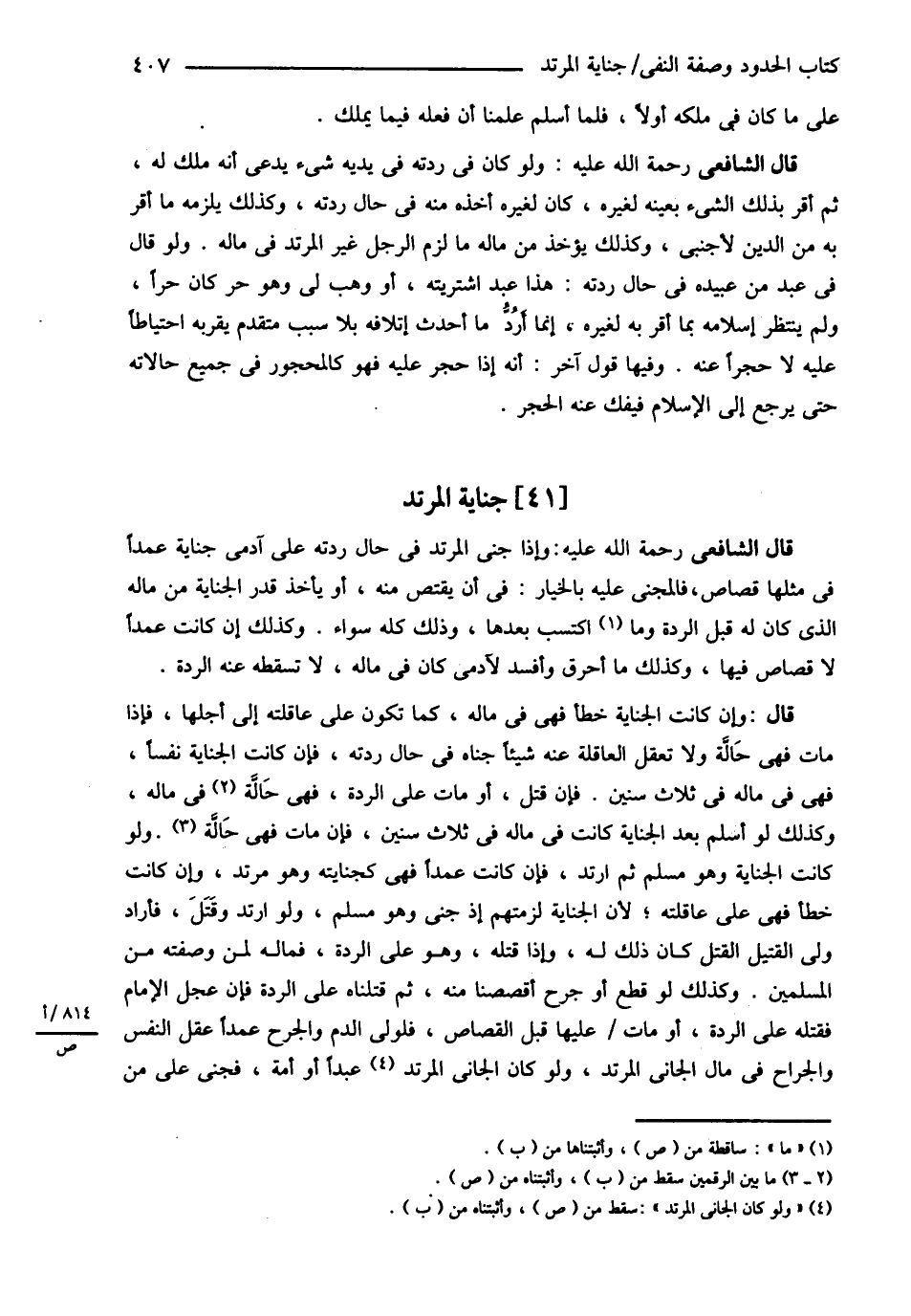 قَالَ الشَّافِعِيُّ : رحمه الله تعالى وَإِذَا جَنَى الْمُرْتَدُّ فِي حَالِ رِدَّتِهِ عَلَى آدَمِيٍّ جِنَايَةً عَمْدًا فِي مِثْلِهَا قِصَاصٌ فَالْمَجْنِيُّ عَلَيْهِ بِالْخِيَارِ فِي أَنْ يَقْتَصَّ مِنْهُ أَوْ يَأْخُذَ قَدْرَ الْجِنَايَةِ مِنْ مَالِهِ الَّذِي كَانَ لَهُ قَبْلَ الرِّدَّةِ وَمَا اكْتَسَبَ بَعْدَهَا وَذَلِكَ كُلُّهُ سَوَاءٌ وَكَذَلِكَ إنْ كَانَتْ عَمْدًا لاَ قِصَاصَ فِيهَا وَكَذَلِكَ مَا أَحْرَقَ وَأَفْسَدَ لِآدَمِيٍّ كَانَ فِي مَالِهِ لاَ تُسْقِطُهُ عَنْهُ الرِّدَّةُ ( قَالَ ) وَإِنْ كَانَتْ الْجِنَايَةُ خَطَأً فَهِيَ فِي مَالِهِ كَمَا تَكُونُ عَلَى عَاقِلَتِهِ إلَى أَجَلِهَا فَإِذَا مَاتَ فَهِيَ حَالَّةٌ وَلاَ تَعْقِلُ الْعَاقِلَةُ عَنْهُ شَيْئًا جَنَاهُ فِي حَالِ رِدَّتِهِ فَإِنْ كَانَتْ الْجِنَايَةُ نَفْسًا فَهِيَ فِي مَالِهِ فِي ثَلاَثِ سِنِينَ فَإِنْ قُتِلَ أَوْ مَاتَ عَلَى الرِّدَّةِ فَهِيَ حَالَّةٌ . وَلَوْ كَانَتْ الْجِنَايَةُ وَهُوَ مُسْلِمٌ ثُمَّ ارْتَدَّ فَإِنْ كَانَتْ عَمْدًا فَهِيَ كَجِنَايَتِهِ وَهُوَ مُرْتَدٌّ وَإِنْ كَانَتْ خَطَأً فَهِيَ عَلَى عَاقِلَتِهِ لِأَنَّ الْجِنَايَةَ لَزِمَتْهُمْ إذْ جَنَى وَهُوَ مُسْلِمٌ . وَلَوْ ارْتَدَّ وَقَتَلَ فَأَرَادَ وَلِيُّ الْقَتِيلِ الْقَتْلَ كَانَ ذَلِكَ لَهُ وَإِذَا قَتَلَهُ وَهُوَ عَلَى الرِّدَّةِ فَمَالُهُ لِمَنْ وَصَفْته مِنْ الْمُسْلِمِينَ وَكَذَلِكَ لَوْ قَطَعَ أَوْ جَرَحَ أَقْصَصْنَا مِنْهُ ثُمَّ قَتَلْنَاهُ عَلَى الرِّدَّةِ فَإِنْ عَجَّلَ الْإِمَامُ فَقَتَلَهُ عَلَى الرِّدَّةِ أَوْ مَاتَ عَلَيْهَا قَبْلَ الْقِصَاصِ فَلِوَلِيِّ الدَّمِ وَالْجَرْحِ عَمْدًا عَقْلُ النَّفْسِ وَالْجِرَاحُ فِي مَالِ الْجَانِي الْمُرْتَدِّ , وَلَوْ كَانَ الْجَانِي الْمُرْتَدُّ عَبْدًا أَوْ أَمَةً فَجَنَى عَلَى مَنْ @