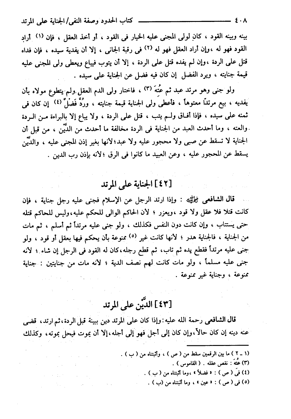 قَالَ الشَّافِعِيُّ : رحمه الله تعالى وَإِذَا ارْتَدَّ الرَّجُلُ عَنْ الْإِسْلاَمِ فَجَنَى عَلَيْهِ رَجُلٌ جِنَايَةً فَإِنْ كَانَتْ قَتْلاً فَلاَ عَقْلَ وَلاَ قَوَدَ وَيُعَزَّرُ لِأَنَّ الْحَاكِمَ الْوَالِيَ لِلْحُكْمِ عَلَيْهِ وَلَيْسَ لِلْحَاكِمِ قَتْلُهُ حَتَّى يُسْتَتَابَ وَإِنْ كَانَتْ دُونَ النَّفْسِ فَكَذَلِكَ . وَلَوْ جَنَى عَلَيْهِ مُرْتَدًّا ثُمَّ أَسْلَمَ ثُمَّ مَاتَ مِنْ الْجِنَايَةِ فَالْجِنَايَةُ هَدَرٌ لِأَنَّهَا كَانَتْ غَيْرَ مَمْنُوعَةٍ بِأَنْ يُحْكَمَ فِيهَا بِعَقْلٍ أَوْ قَوَدٍ وَلَوْ جَنَى عَلَيْهِ مُرْتَدًّا فَقَطَعَ يَدَهُ ثُمَّ تَابَ ثُمَّ قَطَعَ رِجْلَهُ كَانَ لَهُ الْقَوَدُ فِي الرَّجُلِ إنْ شَاءَ لِأَنَّهُ جَنَى عَلَيْهِ مُسْلِمًا وَلَوْ مَاتَ كَانَتْ لَهُمْ نِصْفُ الدِّيَةِ لِأَنَّهُ مَاتَ مِنْ جِنَايَتَيْنِ جِنَايَةٌ مَمْنُوعَةٌ وَجِنَايَةٌ غَيْرُ مَمْنُوعَةٍ .