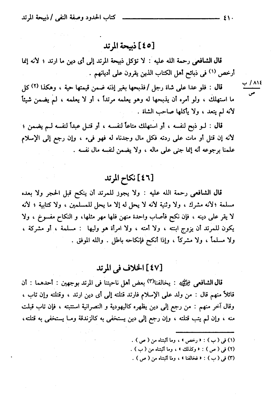 قَالَ الشَّافِعِيُّ: رحمه الله تعالى: لاَ تُؤْكَلُ ذَبِيحَةُ الْمُرْتَدِّ إلَى أَيِّ دِينٍ مَا ارْتَدَّ لِأَنَّهُ إنَّمَا رَخَّصَ فِي ذَبَائِحِ أَهْلِ الْكِتَابِ الَّذِينَ يُقِرُّونَ عَلَى أَدْيَانِهِمْ (قَالَ) فَلَوْ عَدَا عَلَى شَاةٍ رَجُلٌ فَذَبَحَهَا بِغَيْرِ إذْنِهِ ضَمِنَ قِيمَتَهَا حَيَّةً , وَهَكَذَا كُلُّ مَا اُسْتُهْلِكَ , وَلَوْ أَمَرَهُ أَنْ يَذْبَحَهَا لَهُ وَهُوَ يَعْلَمُهُ مُرْتَدًّا أَوْ لاَ يَعْلَمُهُ لَمْ يَضْمَنْ شَيْئًا لِأَنَّهُ لَمْ يَتَعَدَّ وَلاَ يَأْكُلُهَا صَاحِبُ الشَّاةِ (قَالَ) وَلَوْ ذَبَحَ لِنَفْسِهِ أَوْ اسْتَهْلَكَ مَتَاعًا لِنَفْسِهِ أَوْ قَتَلَ عَبْدًا لِنَفْسِهِ لَمْ يَضْمَنْ لِأَنَّهُ إنْ قُتِلَ أَوْ مَاتَ عَلَى رِدَّتِهِ فَكُلُّ مَالٍ وَجَدْنَاهُ لَهُ فَهُوَ فَيْءٌ , وَإِنْ رَجَعَ إلَى الْإِسْلاَمِ عَلِمْنَا بِرُجُوعِهِ أَنَّهُ إنَّمَا جَنَى عَلَى مَالِهِ وَلاَ يَضْمَنُ لِنَفْسِهِ مَالَ نَفْسِهِ.