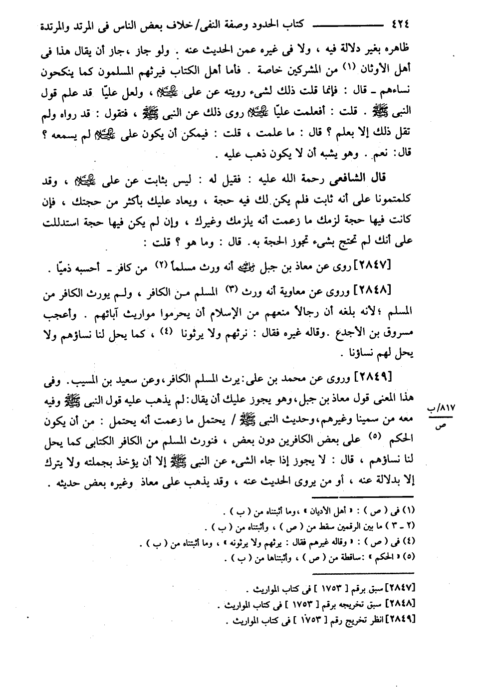 ظَاهِرِهِ بِغَيْرِ دَلاَلَةٍ فِيهِ وَلاَ فِي غَيْرِهِ عَمَّنْ الْحَدِيثُ عَنْهُ . وَلَوْ جَازَ جَازَ أَنْ يُقَالَ هَذَا فِي أَهْلِ الْأَوْثَانِ مِنْ الْمُشْرِكِينَ خَاصَّةً . فَأَمَّا أَهْلُ الْكِتَابِ فَيَرِثُهُمْ الْمُسْلِمُونَ كَمَا يَنْكِحُونَ نِسَاءَهُمْ قَالَ فَإِنَّمَا قُلْت ذَلِكَ لِشَيْءٍ رَوَيْته عَنْ عَلِيٍّ رضي الله عنه وَلَعَلَّ عَلِيًّا قَدْ عَلِمَ قَوْلَ النَّبِيِّ - صلى الله عليه وسلم - . قُلْت أَفَعَلِمْت عَلِيًّا رضي الله عنه رَوَى ذَلِكَ عَنْ النَّبِيِّ - صلى الله عليه وسلم - فَنَقُولُ قَدْ رَوَاهُ وَلَمْ تَقُلْ ذَلِكَ إلَّا بِعِلْمٍ ؟ قَالَ مَا عَلِمْت قُلْت فَيُمْكِنُ أَنْ يَكُون عَلِيٌّ رضي الله عنه لَمْ يَسْمَعْهُ ؟ قَالَ نَعَمْ وَهُوَ يُشْبِهُ أَنْ لاَ يَكُونَ ذَهَبَ عَلَيْهِ