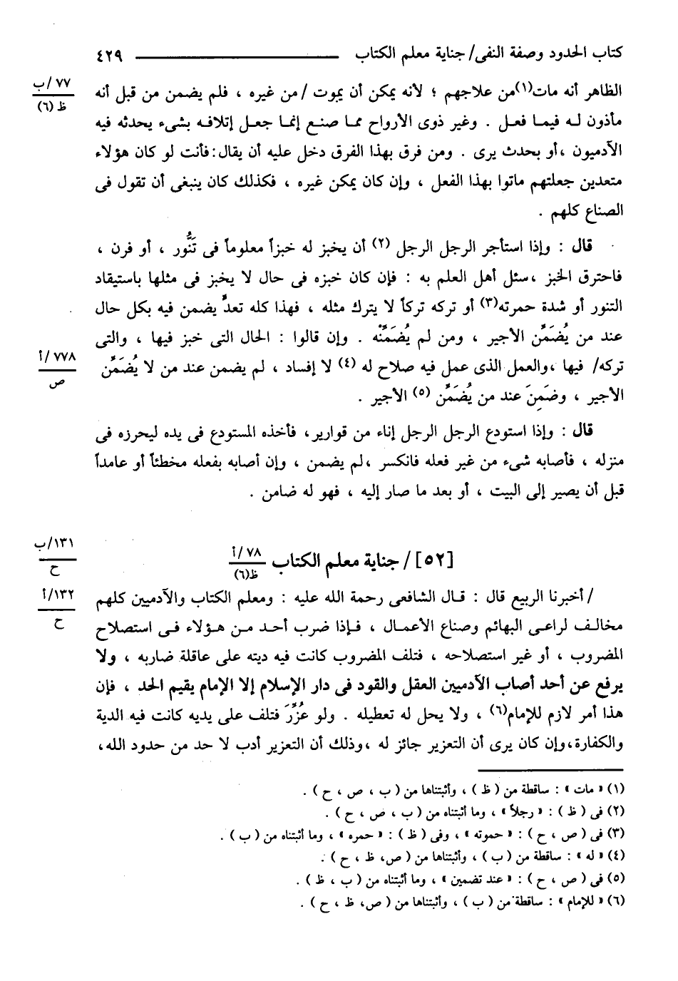 قَالَ الشَّافِعِيُّ : رحمه الله تعالى : وَمُعَلِّمُ الْكُتَّابِ وَالْآدَمِيِّينَ كُلِّهِمْ مُخَالِفٌ لِرَاعِي الْبَهَائِمِ وَصُنَّاعِ الْأَعْمَالِ فَإِذَا ضَرَبَ أَحَدٌ مِنْ هَؤُلاَءِ فِي اسْتِصْلاَحِ الْمَضْرُوبِ أَوْ غَيْرِ اسْتِصْلاَحِهِ فَتَلِفَ الْمَضْرُوبُ كَانَتْ فِيهِ دِيَتُهُ عَلَى عَاقِلَةِ ضَارِبِهِ وَلاَ يُرْفَعُ عَنْ أَحَدٍ أَصَابَ الْآدَمِيِّينَ الْعَقْلُ وَالْقَوَدُ فِي دَارِ الْإِسْلاَمِ إلَّا الْإِمَامُ يُقِيمُ الْحَدَّ فَإِنَّ هَذَا أَمْرٌ لاَزِمٌ وَلاَ يَحِلُّ لَهُ تَعْطِيلُهُ , وَلَوْ عُزِّرَ فَتَلِفَ عَلَى يَدَيْهِ كَانَتْ فِيهِ الدِّيَةُ وَالْكَفَّارَةُ وَإِنْ كَانَ يَرَى أَنَّ التَّعْزِيرَ جَائِزٌ لَهُ وَذَلِكَ أَنَّ التَّعْزِيرَ أَدَبٌ لاَ حَدٌّ مِنْ حُدُودِ اللَّهِ تَعَالَى . @