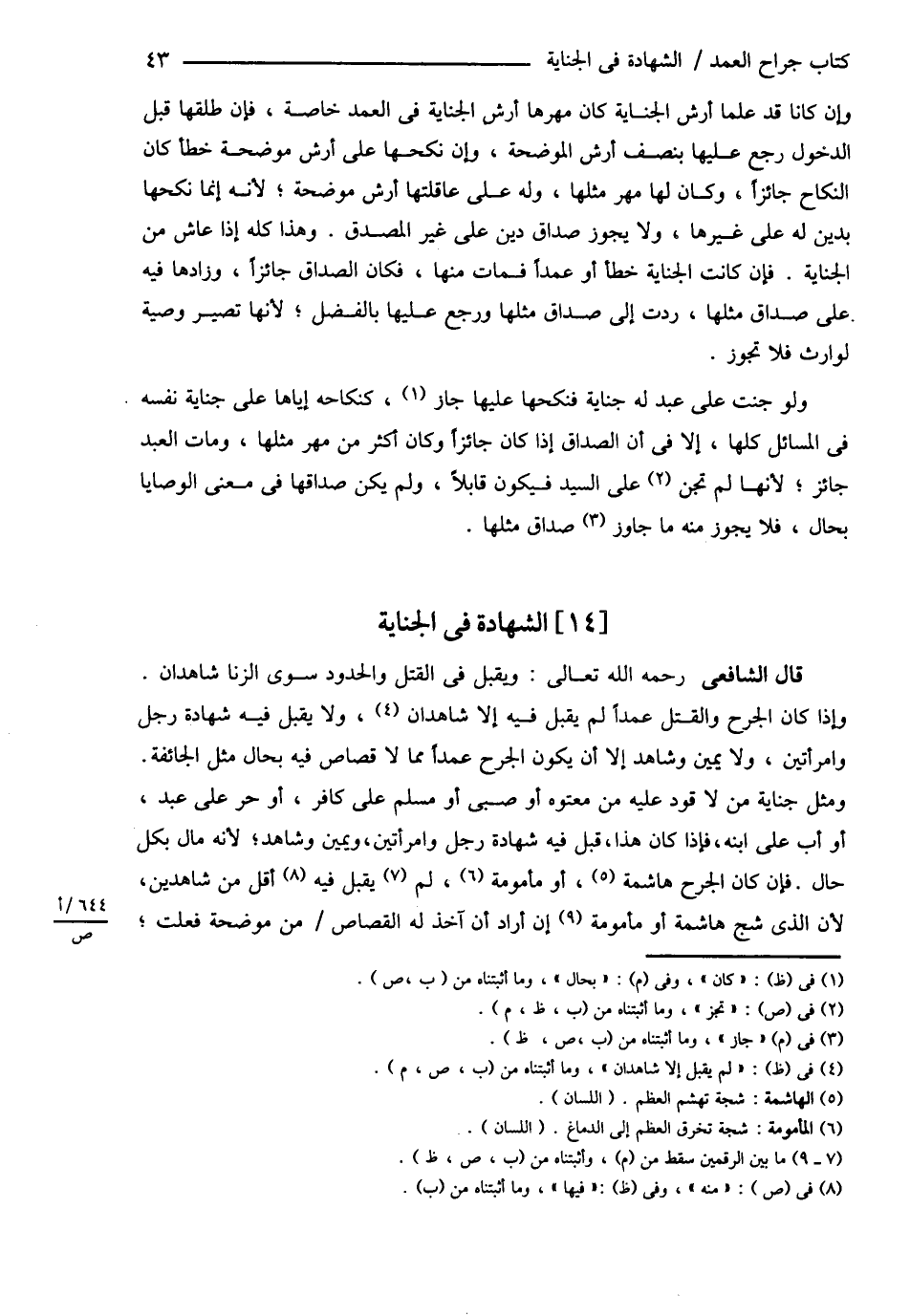 قَالَ الشَّافِعِيُّ : رحمه الله تعالى : وَيُقْبَلُ فِي الْقَتْلِ وَالْحُدُودِ سِوَى الزِّنَا شَاهِدَانِ . وَإِذَا كَانَ الْجُرْحُ وَالْقَتْلُ عَمْدًا لَمْ يُقْبَلْ فِيهِ إلَّا شَاهِدَانِ وَلاَ يُقْبَلُ فِيهِ شَهَادَةُ رَجُلٍ وَامْرَأَتَيْنِ وَلاَ يَمِينٌ وَشَاهِدٌ إلَّا أَنْ يَكُونَ الْجُرْحُ عَمْدًا مِمَّا لاَ قِصَاصَ فِيهِ بِحَالٍ , مِثْلُ الْجَائِفَةِ وَمِثْلُ جِنَايَةِ مَنْ لاَ قَوَدَ عَلَيْهِ مِنْ مَعْتُوهٍ أَوْ صَبِيٍّ أَوْ مُسْلِمٍ عَلَى كَافِرٍ أَوْ حُرٍّ عَلَى عَبْدٍ أَوْ أَبٍ عَلَى ابْنِهِ فَإِذَا كَانَ هَذَا قُبِلَ فِيهِ شَهَادَةُ رَجُلٍ وَامْرَأَتَيْنِ وَيَمِينٌ وَشَاهِدٌ ; لِأَنَّهُ مَالٌ بِكُلِّ حَالٍ فَإِنْ كَانَ الْجُرْحُ هَاشِمَةً أَوْ مَأْمُومَةً لَمْ يُقْبَلْ فِيهِ أَقَلُّ مِنْ شَاهِدَيْنِ ; لِأَنَّ الَّذِي شُجَّ هَاشِمَةً أَوْ مَأْمُومَةً إنْ أَرَادَ أَنْ آخُذَ لَهُ الْقِصَاصَ مِنْ مُوضِحَةٍ فَعَلْت@