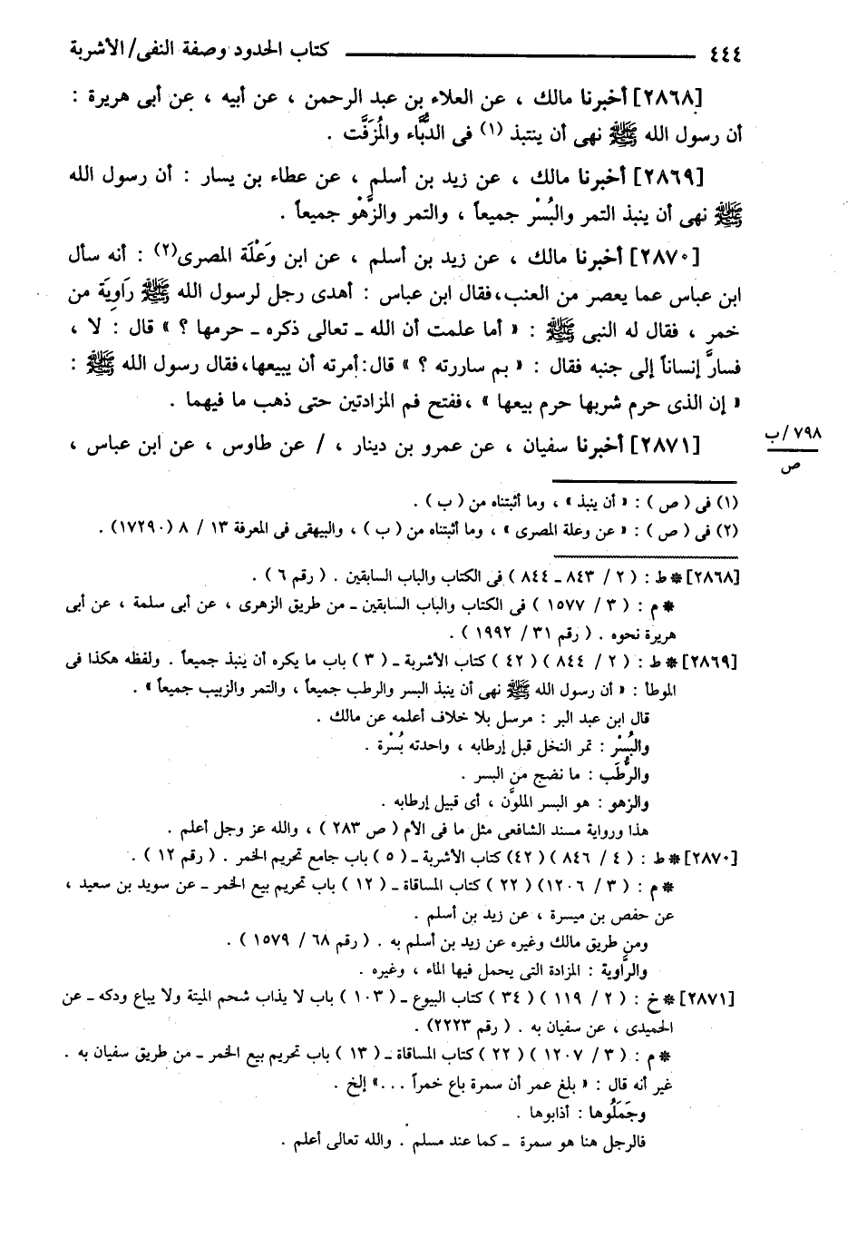 أَخْبَرَنَا مَالِكٌ عَنْ الْعَلاَءِ بْنِ عَبْدِ الرَّحْمَنِ عَنْ أَبِيهِ عَنْ أَبِي هُرَيْرَةَ : ? أَنَّ رَسُولَ اللَّهِ - صلى الله عليه وسلم - نَهَى أَنْ يُنْتَبَذَ فِي الدُّبَّاءِ وَالْمُزَفَّتِ ? أَخْبَرَنَا مَالِكٌ عَنْ زَيْدِ بْنِ أَسْلَمَ عَنْ عَطَاءِ بْنِ يَسَارٍ : ? أَنَّ رَسُولَ اللَّهِ - صلى الله عليه وسلم - نَهَى أَنْ يُنْبَذَ التَّمْرُ وَالْبُسْرُ جَمِيعًا وَالتَّمْرُ وَالزَّهْوُ جَمِيعًا ? أَخْبَرَنَا مَالِكٌ عَنْ زَيْدِ بْنِ أَسْلَمَ عَنْ ابْنِ وَعْلَةَ الْمِصْرِيِّ أَنَّهُ سَأَلَ ابْنَ عَبَّاسٍ عَمَّا يُعْصَرُ مِنْ الْعِنَبِ فَقَالَ ابْنُ عَبَّاسٍ رضي الله عنهما : ? أَهْدَى رَجُلٌ لِرَسُولِ اللَّهِ - صلى الله عليه وسلم - رَاوِيَةً مِنْ خَمْرٍ فَقَالَ لَهُ النَّبِيُّ - صلى الله عليه وسلم - أَمَا عَلِمْت أَنَّ اللَّهَ تَعَالَى ذِكْرُهُ حَرَّمَهَا ؟ ? قَالَ : لاَ , فَسَارَّ إنْسَانًا إلَى جَنْبِهِ , فَقَالَ : بِمَ سَارَرْتَهُ ؟ فَقَالَ أَمَرْتُهُ أَنْ يَبِيعَهَا فَقَالَ رَسُولُ اللَّهِ - صلى الله عليه وسلم - : ? إنَّ الَّذِي حَرَّمَ شُرْبَهَا حَرَّمَ بَيْعَهَا ? فَفَتَحَ فَمَ الْمَزَادَتَيْنِ حَتَّى ذَهَبَ مَا فِيهِمَا أَخْبَرَنَا سُفْيَانُ عَنْ عَمْرِو بْنِ دِينَارٍ عَنْ طَاوُسٍ عَنْ ابْنِ عَبَّاسٍ @